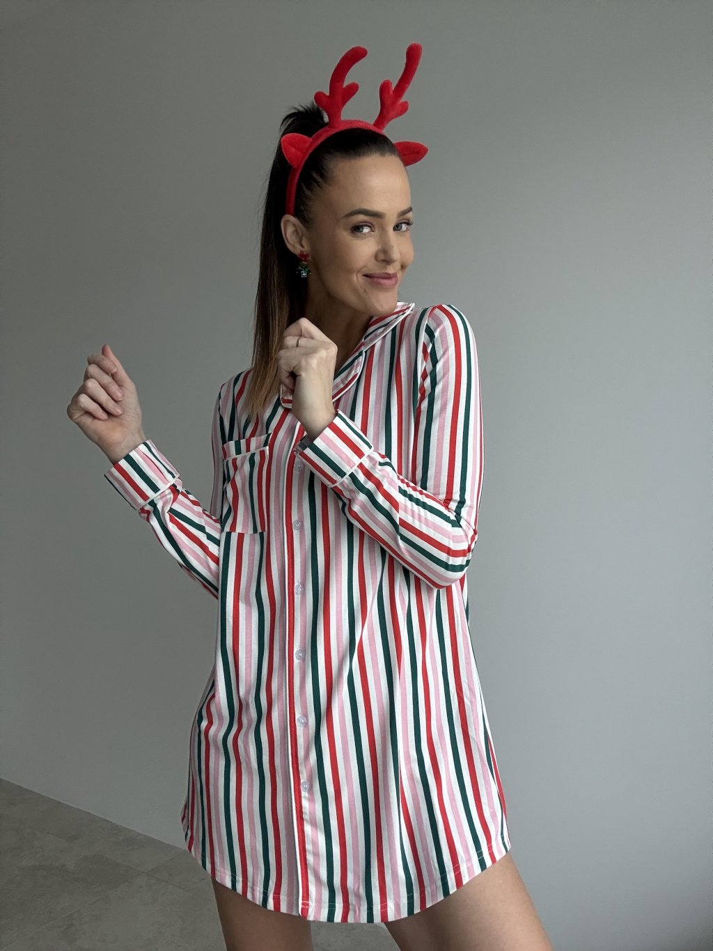 Shirt-style nightdress with long sleeves and an all-over striped pattern that combines a playful festive look with maximum comfort. The soft, pleasant fabric gently follows the body while the relaxed fit gives you plenty of freedom to move, whether you are sleeping or relaxing at home. A classic collar, full button fastening and a chest pocket create the look of an elegant shirt, so you still feel put-together for cosy mornings or evening lounging. The above-the-knee length allows you to wear it on its own as a nightdress or layered with leggings or lounge trousers.