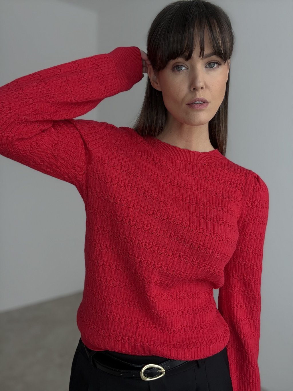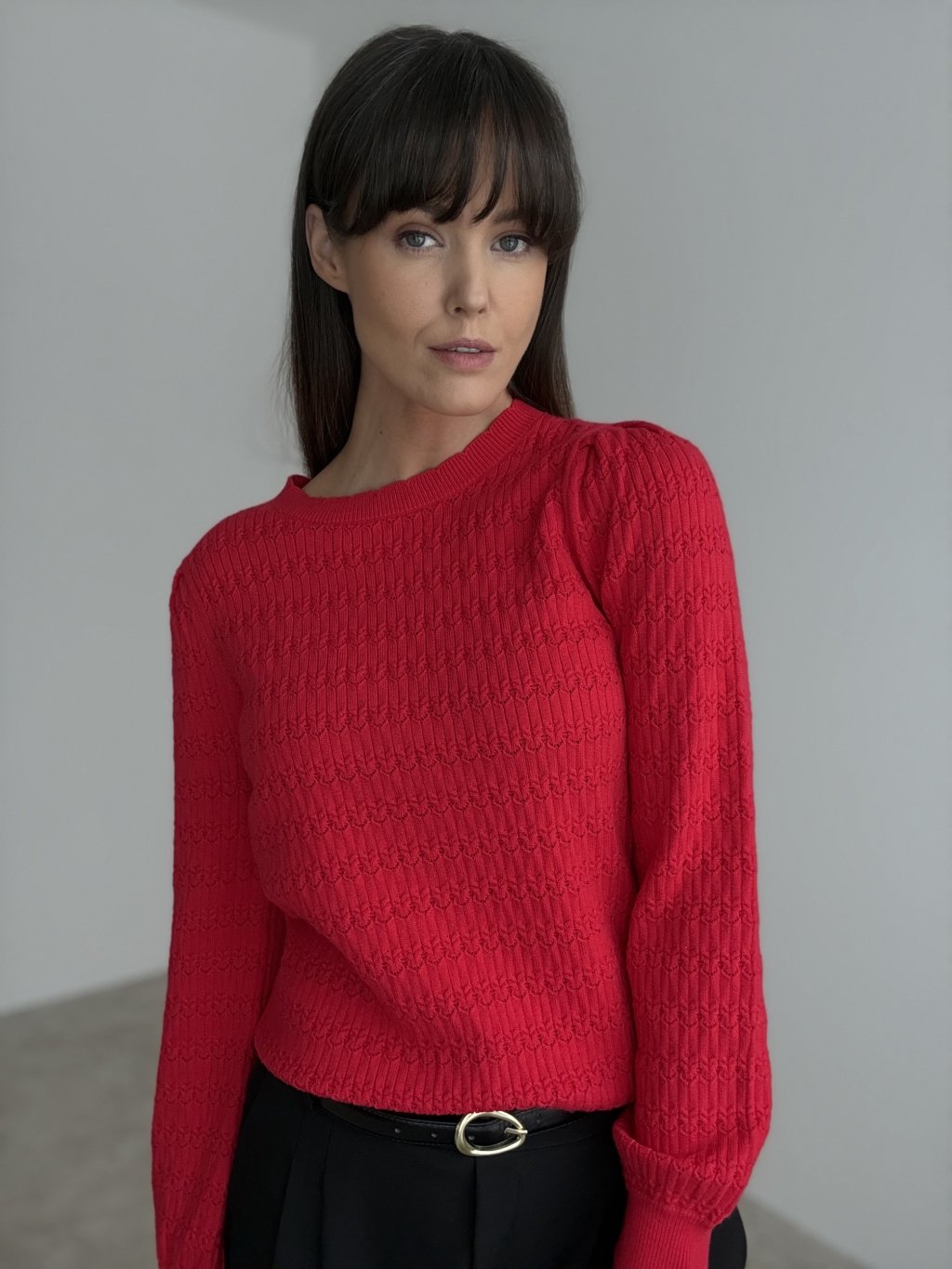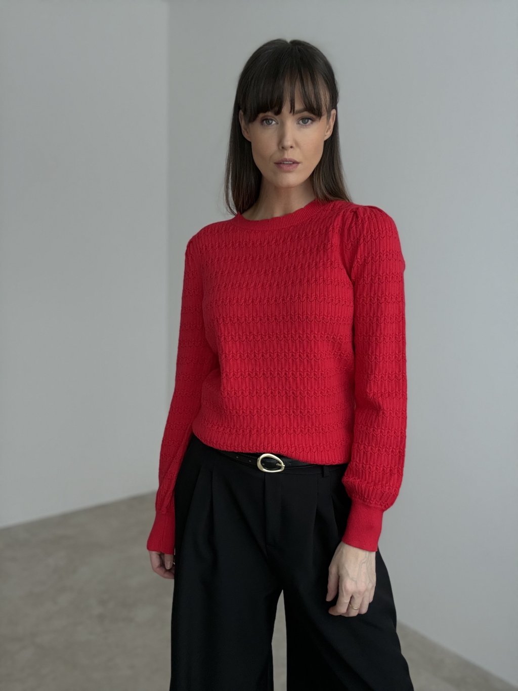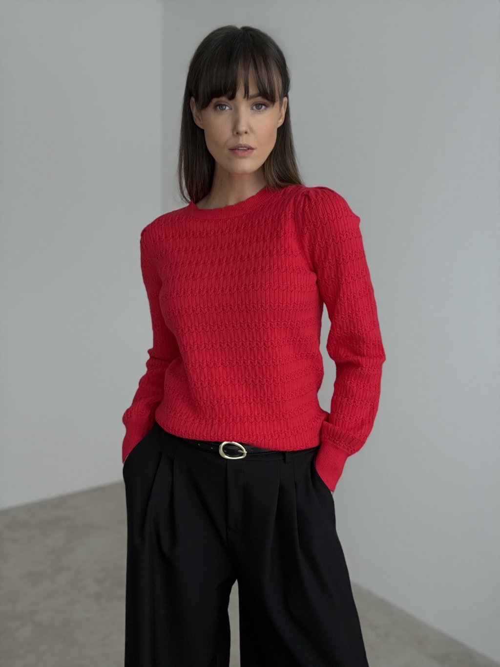 A softly patterned sweater with a classic round neckline that combines a simple shape with refined detailing. The entire surface features a delicate textured knit pattern, giving the piece a more luxurious and interesting look even without bold accessories. The shoulders are slightly gathered, beautifully softening the silhouette and adding a feminine touch. Fitted ribbed trims at the neck, cuffs and hem help the sweater keep its shape and gently define the waist, while still remaining comfortable for all-day wear.