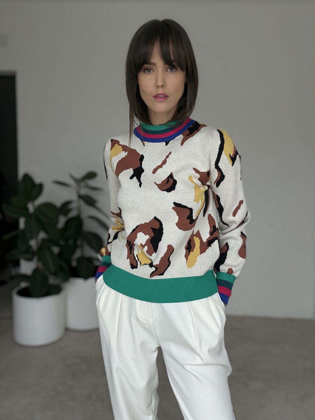 A modern patterned sweater with a unique design that instantly catches the eye. It features a comfortable fit, soft knit fabric, and elastic hems for a perfect shape. Thanks to its playful pattern and colorful details, it adds a stylish and trendy touch to any outfit. Perfect to pair with skirts, jeans, or elegant trousers.