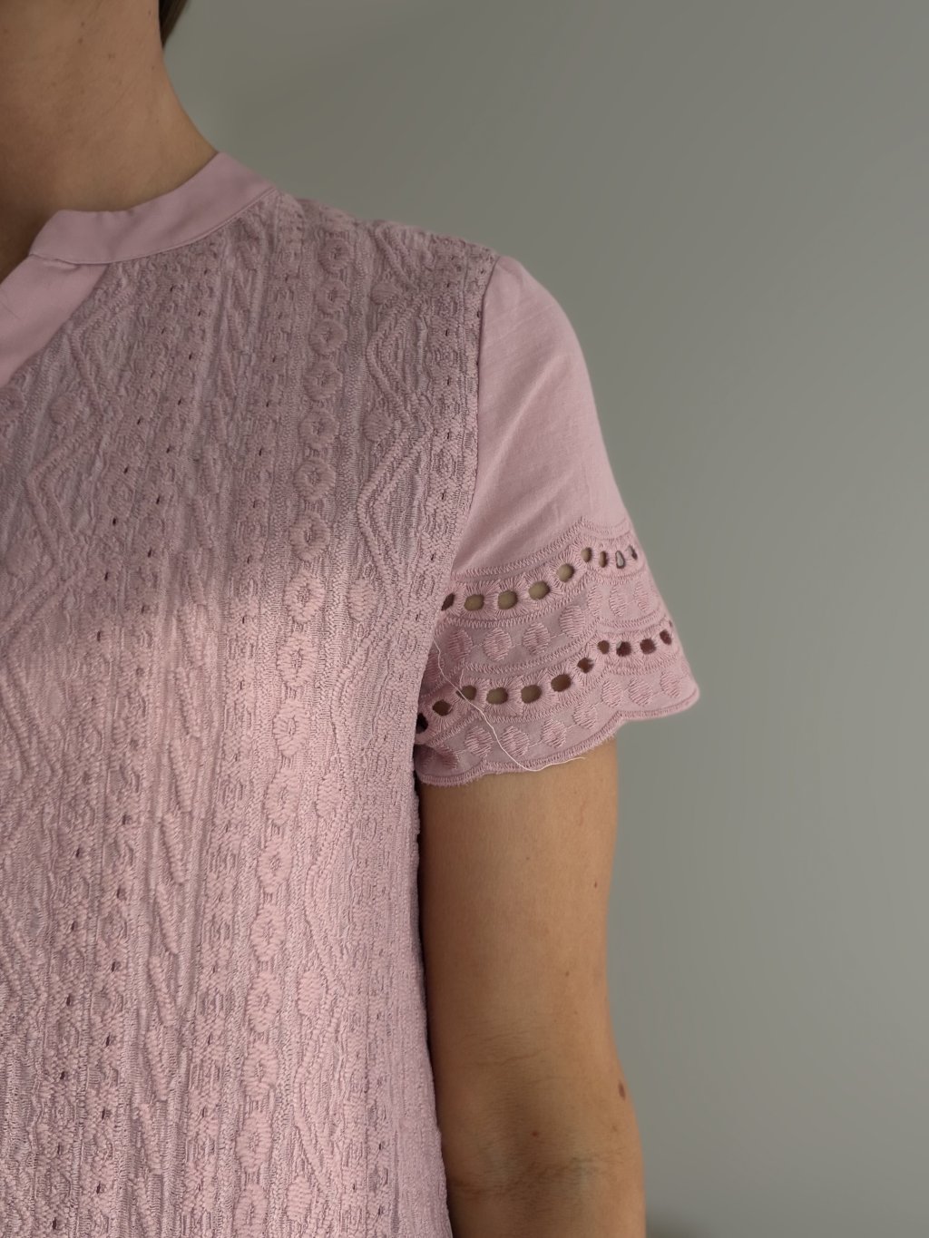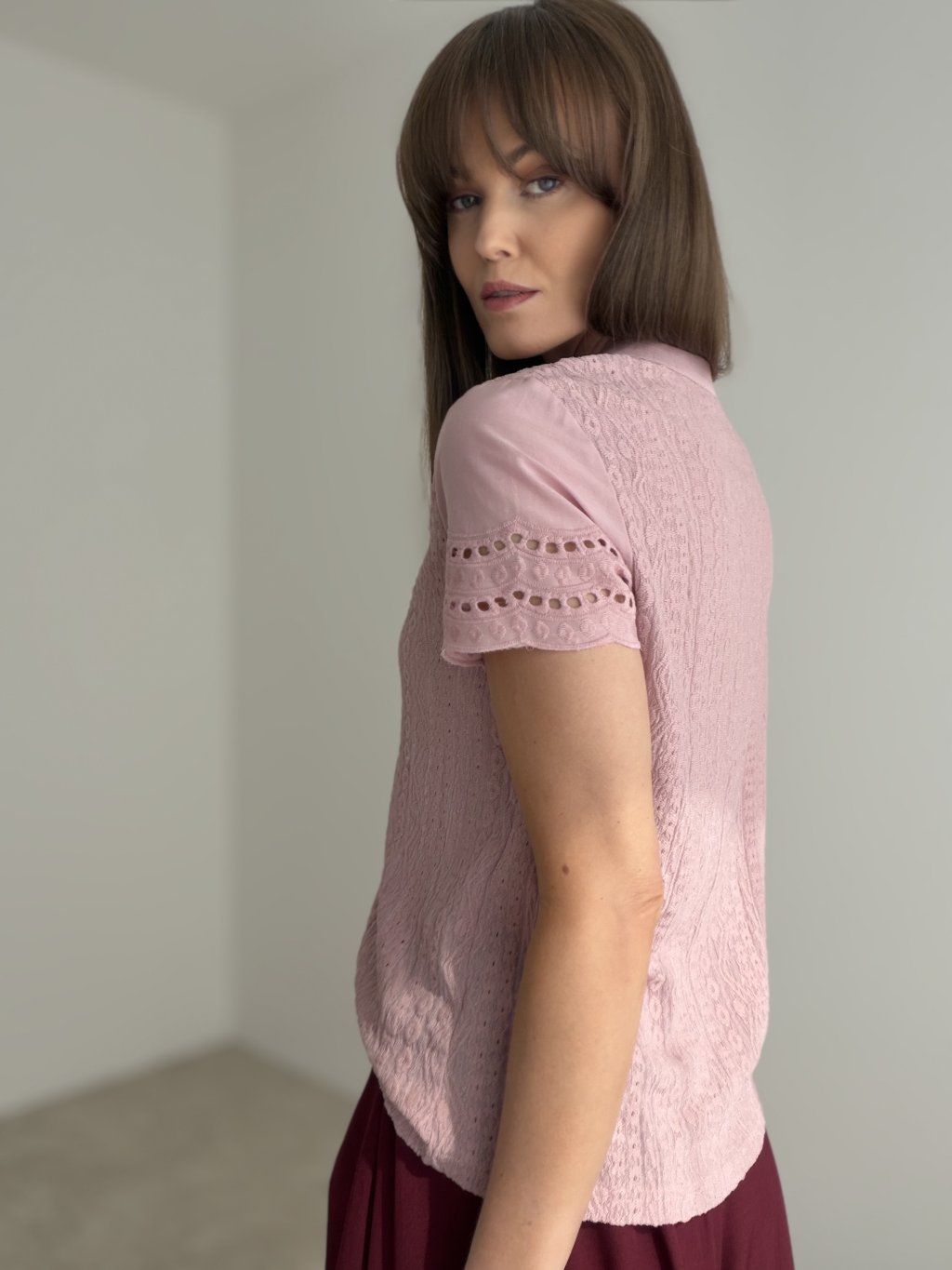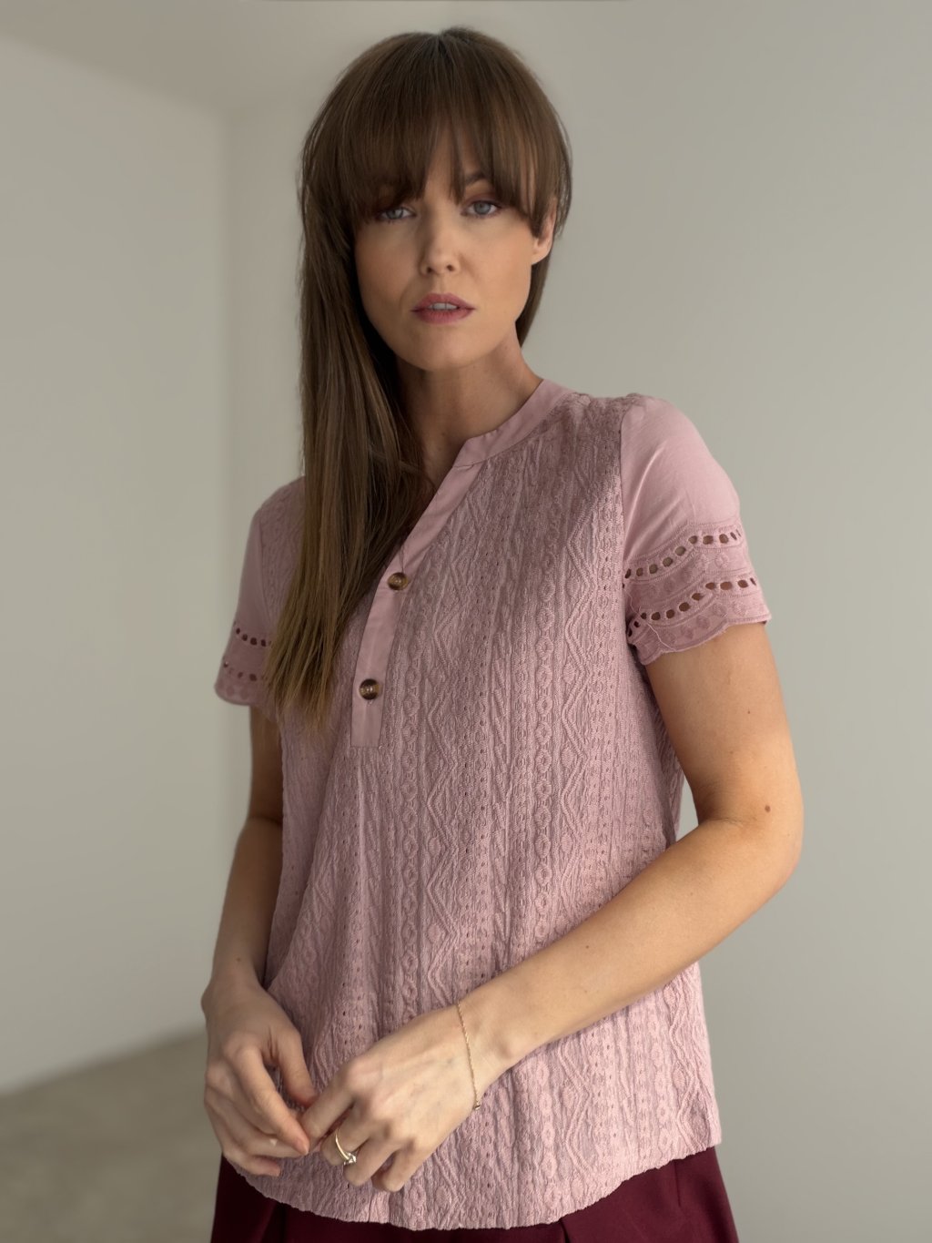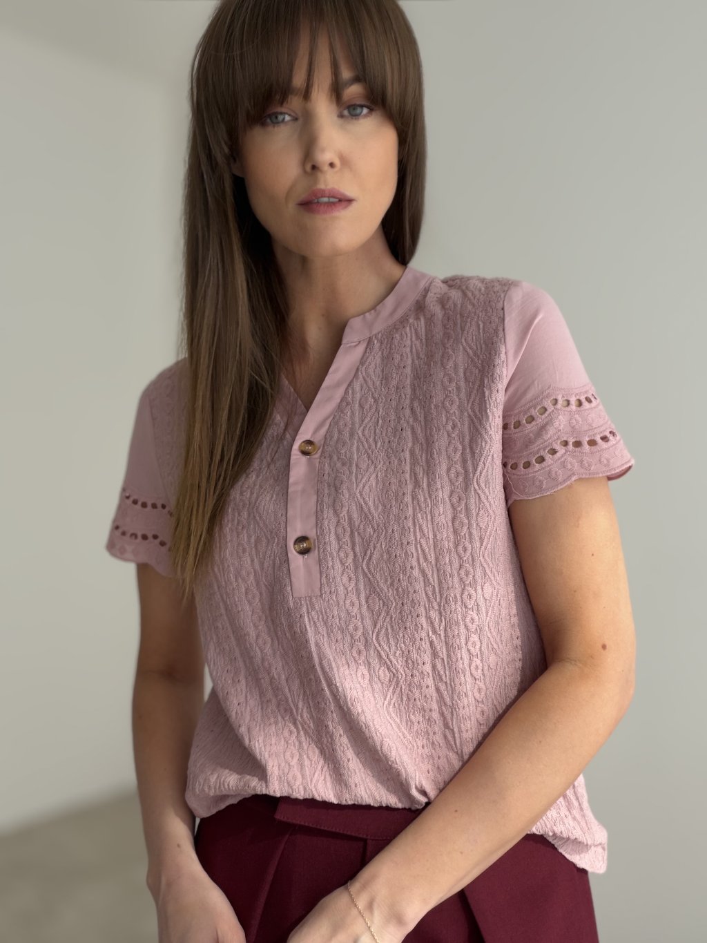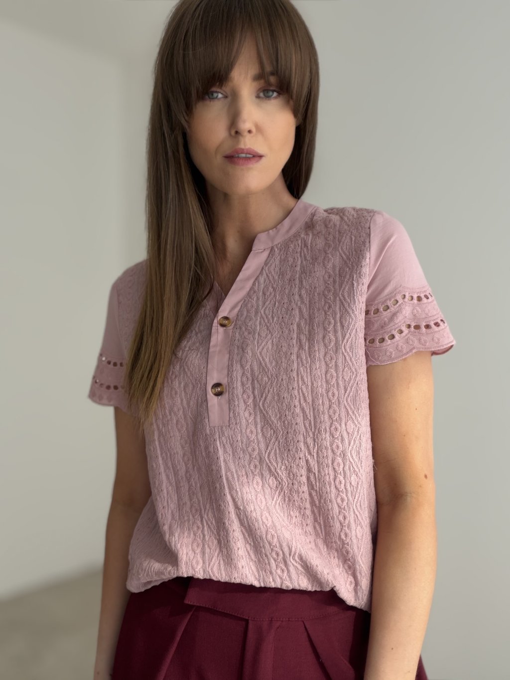 Elegant top with textured fabric, subtle neckline fastening, and decorative sleeve details. A comfortable and feminine piece suitable for everyday wear as well as more polished occasions.