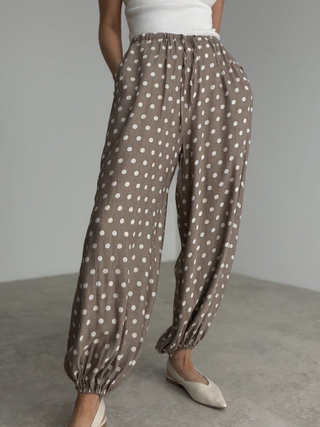 These trousers look feminine, playful, and at the same time very elegant. The loose, flowing cut offers excellent comfort while wearing and moves beautifully with the silhouette. The pattern adds a subtle fashion detail that makes them a standout piece while still being easy to style. The waist feels comfortable and flattering, making these trousers suitable for everyday wear as well as for more special occasions. They pair beautifully with a simple fitted top, a shirt, or an elegant blazer, allowing you to create a look that works both for daily wear and for a stylish outing.