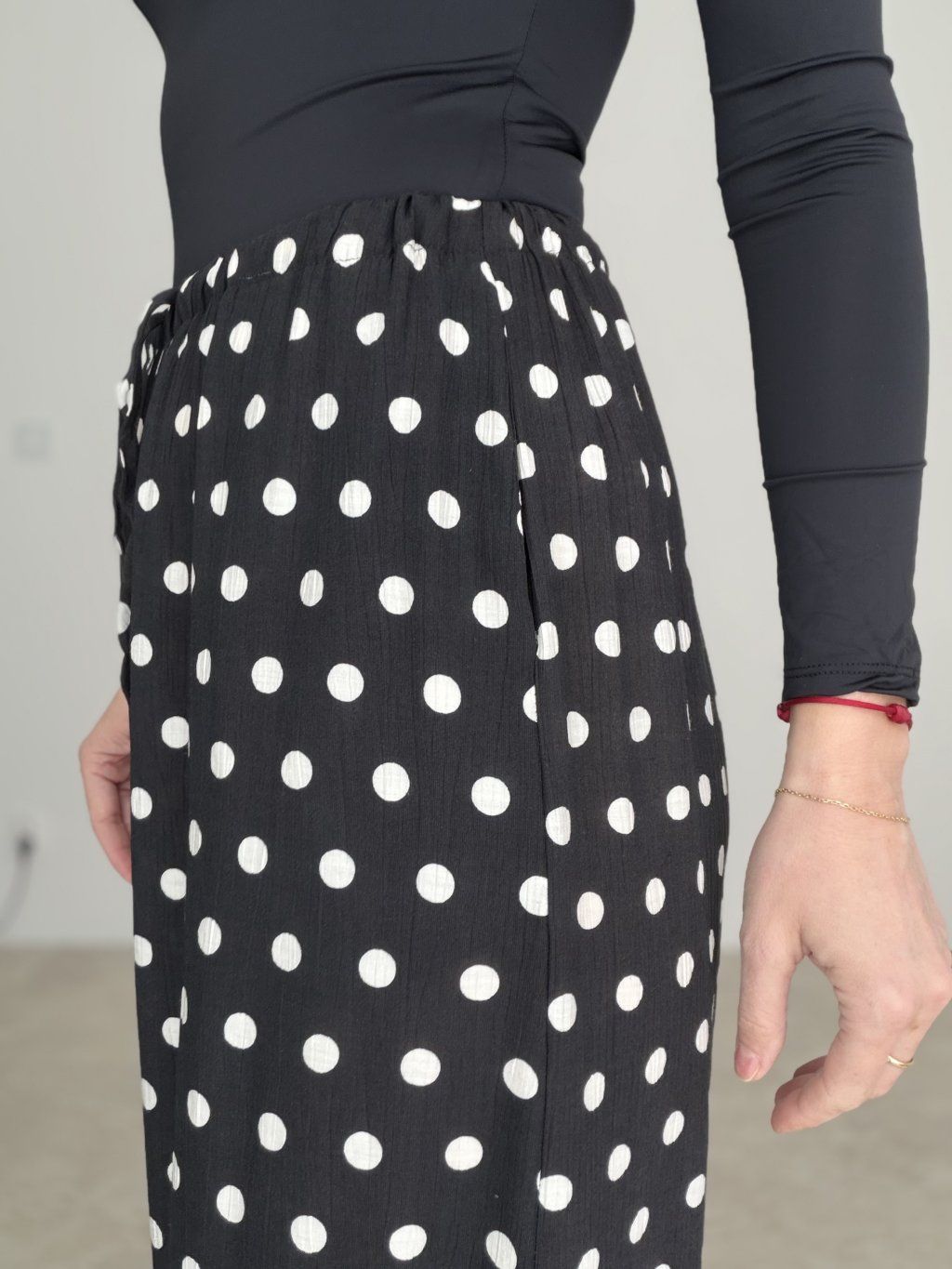 These trousers look feminine, playful, and at the same time very elegant. The loose, flowing cut offers excellent comfort while wearing and moves beautifully with the silhouette. The pattern adds a subtle fashion detail that makes them a standout piece while still being easy to style. The waist feels comfortable and flattering, making these trousers suitable for everyday wear as well as for more special occasions. They pair beautifully with a simple fitted top, a shirt, or an elegant blazer, allowing you to create a look that works both for daily wear and for a stylish outing.