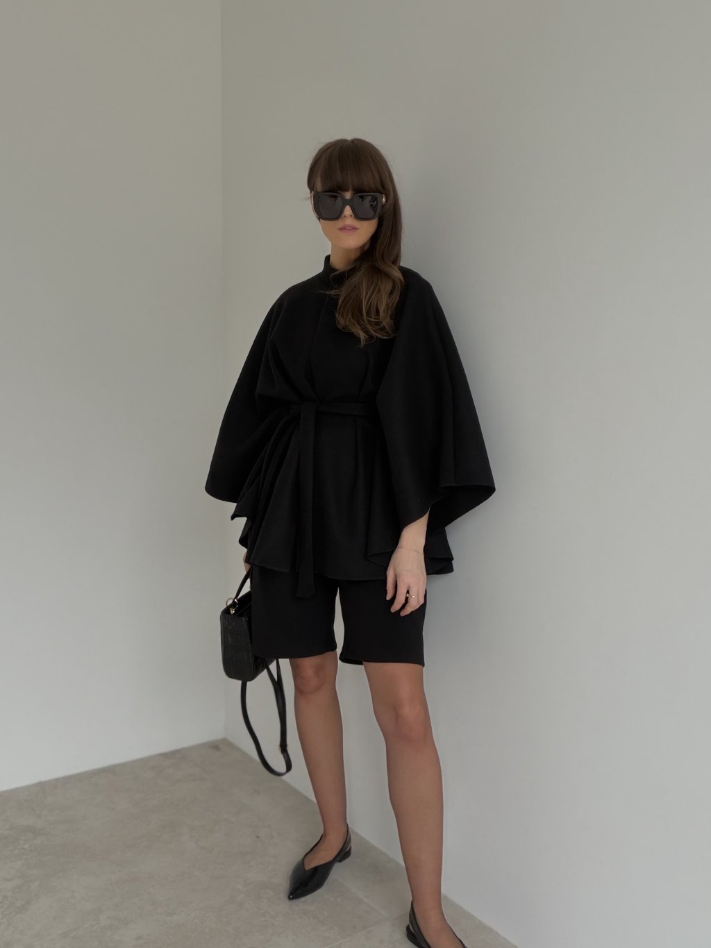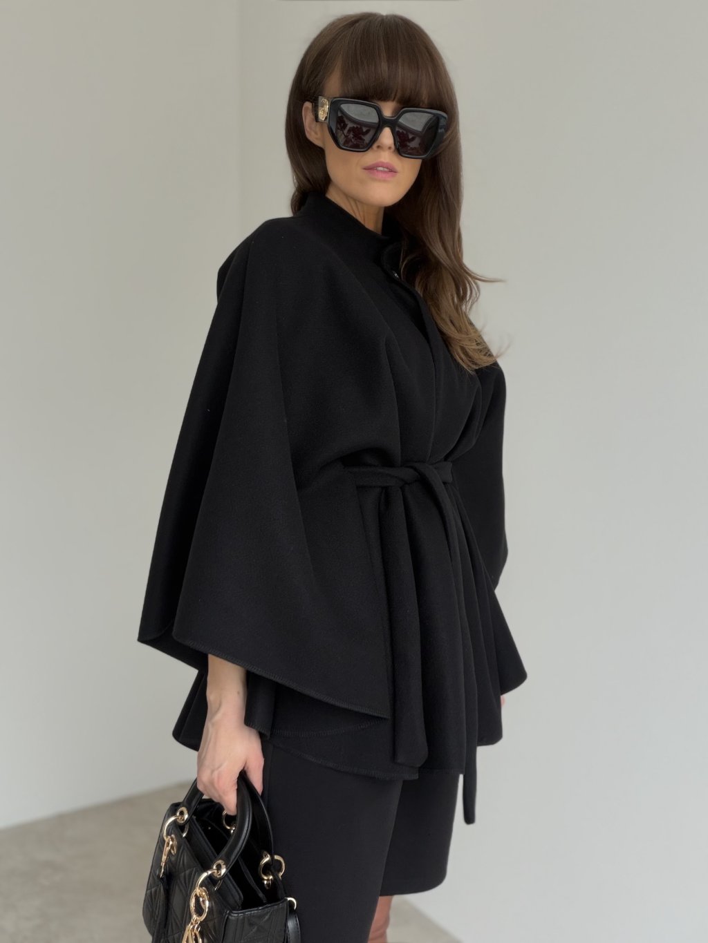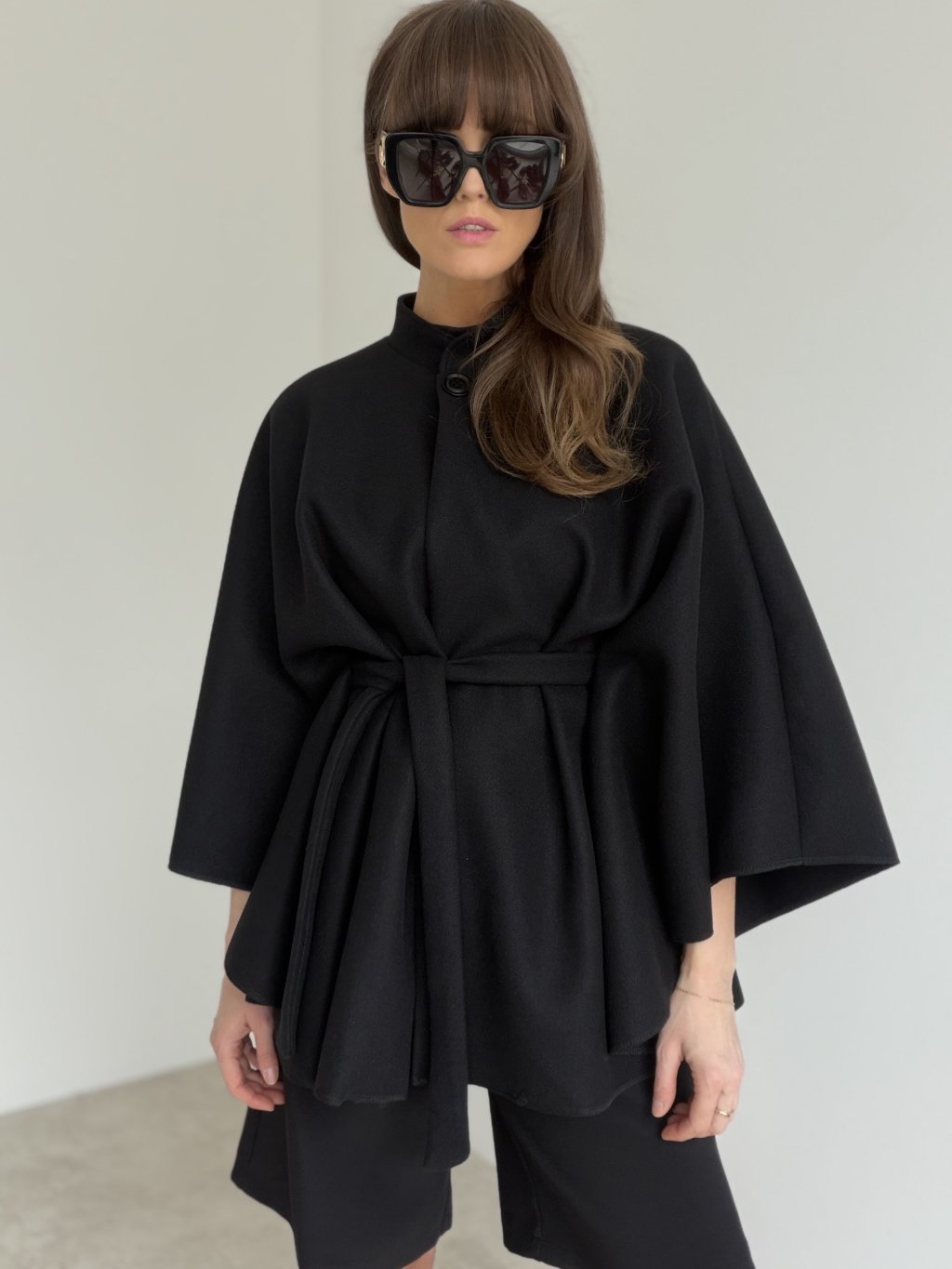 An elegant poncho with a clean, timeless silhouette that feels luxurious while staying incredibly comfortable. The relaxed cape-style cut drapes beautifully, creates soft movement and adds a bold yet minimalist touch to any outfit. It features a stand collar with a fastening at the neckline for a polished look, and a waist tie that lets you adjust the shape—wear it loose for an effortless vibe or cinch it in to highlight the waist. A perfect piece for transitional seasons, city styling, meetings or evening wear when you want to look chic with ease.