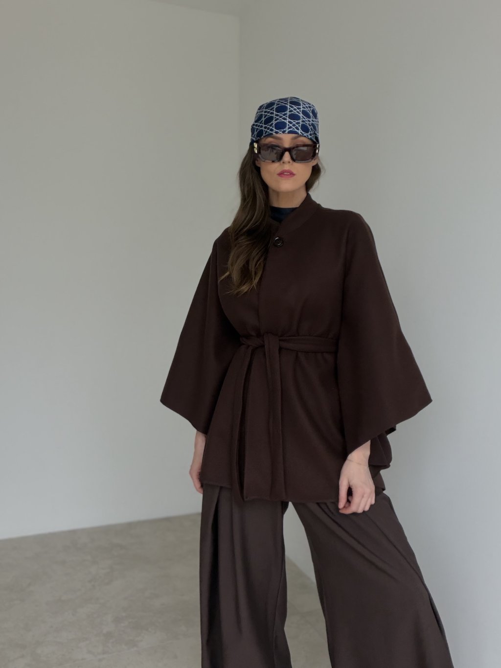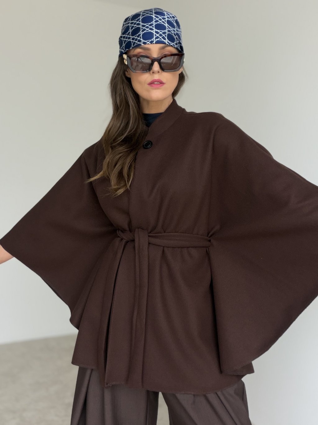 An elegant poncho with a clean, timeless silhouette that feels luxurious while staying incredibly comfortable. The relaxed cape-style cut drapes beautifully, creates soft movement and adds a bold yet minimalist touch to any outfit. It features a stand collar with a fastening at the neckline for a polished look, and a waist tie that lets you adjust the shape—wear it loose for an effortless vibe or cinch it in to highlight the waist. A perfect piece for transitional seasons, city styling, meetings or evening wear when you want to look chic with ease.