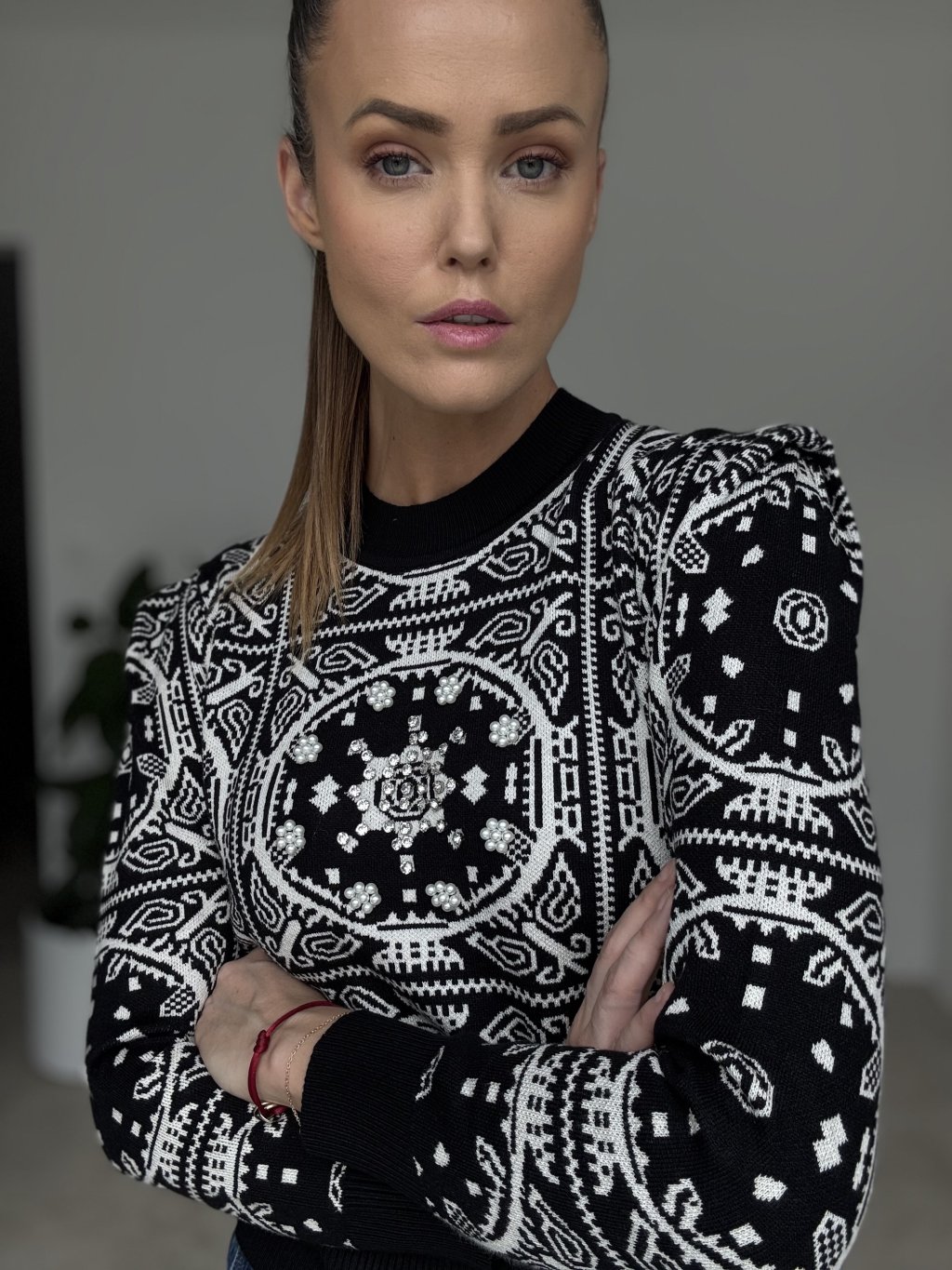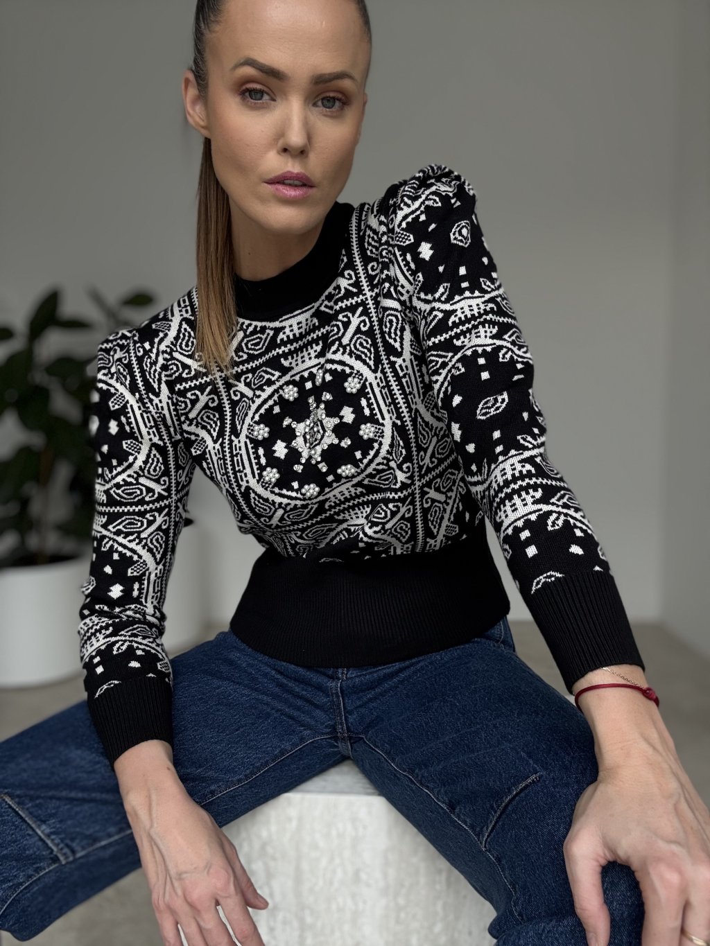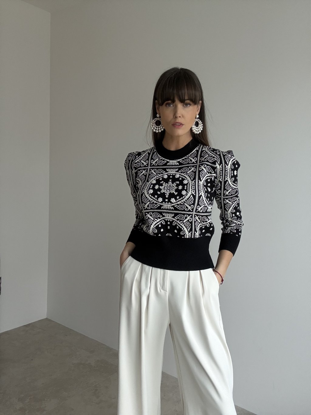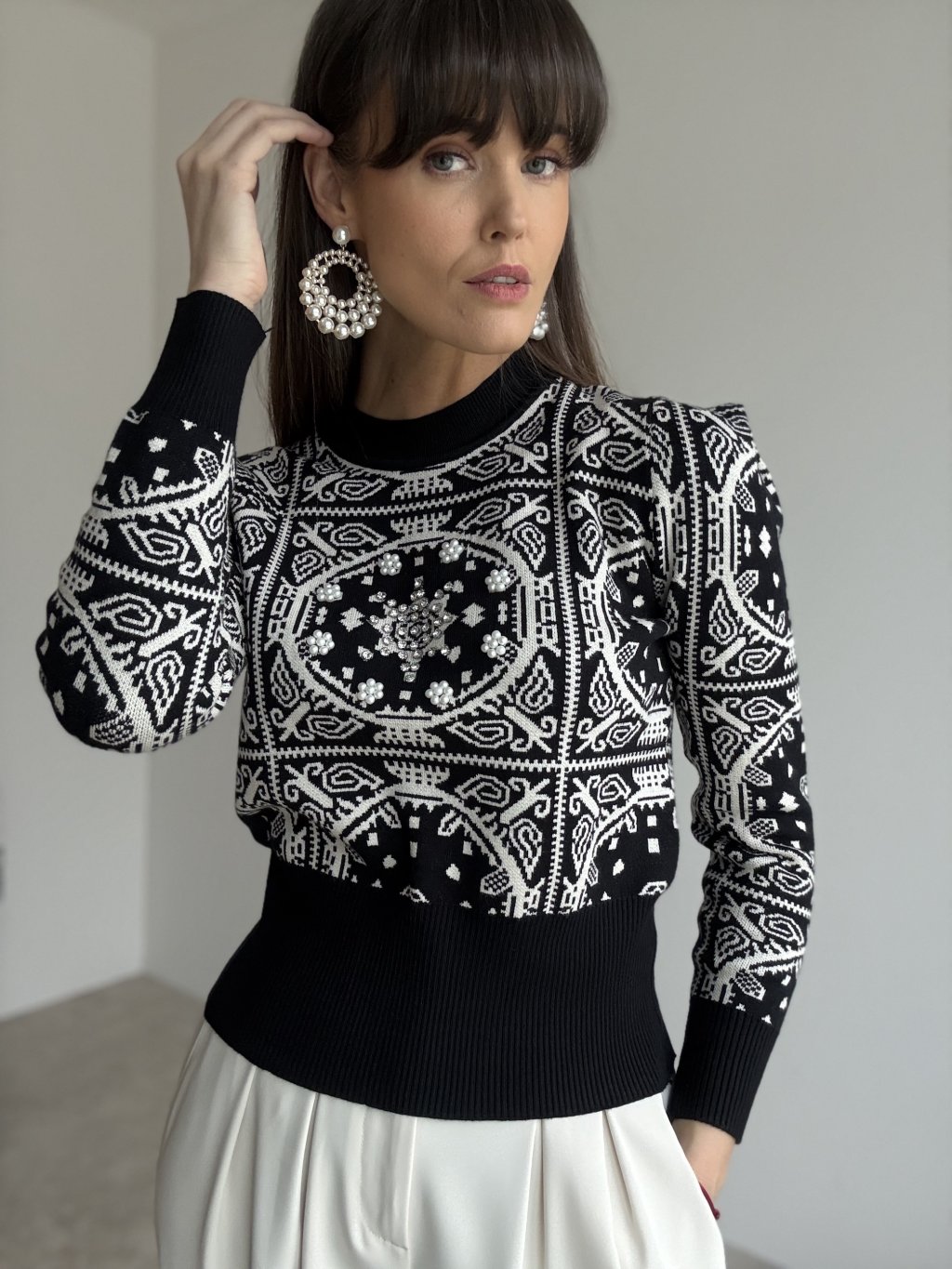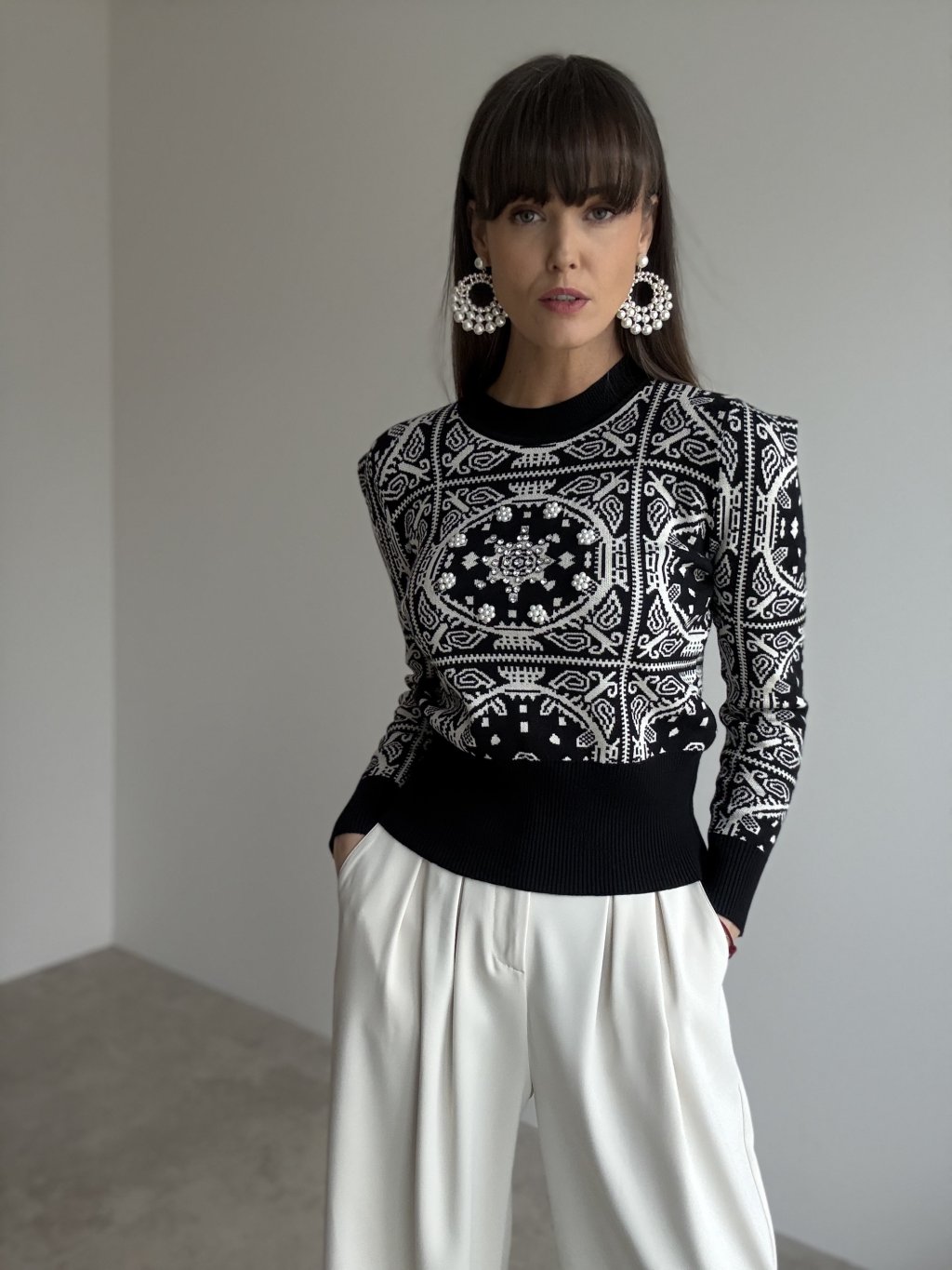 A stylish pullover with an original geometric pattern makes a statement piece that elevates any outfit. The soft knit is comfortable to wear, while the elasticated hems keep the shape perfectly. Featuring a cropped fit and slightly accentuated shoulders, it adds a modern touch and flatters the silhouette. This pullover pairs beautifully with trousers, skirts, or jeans, creating an elegant yet casual look.