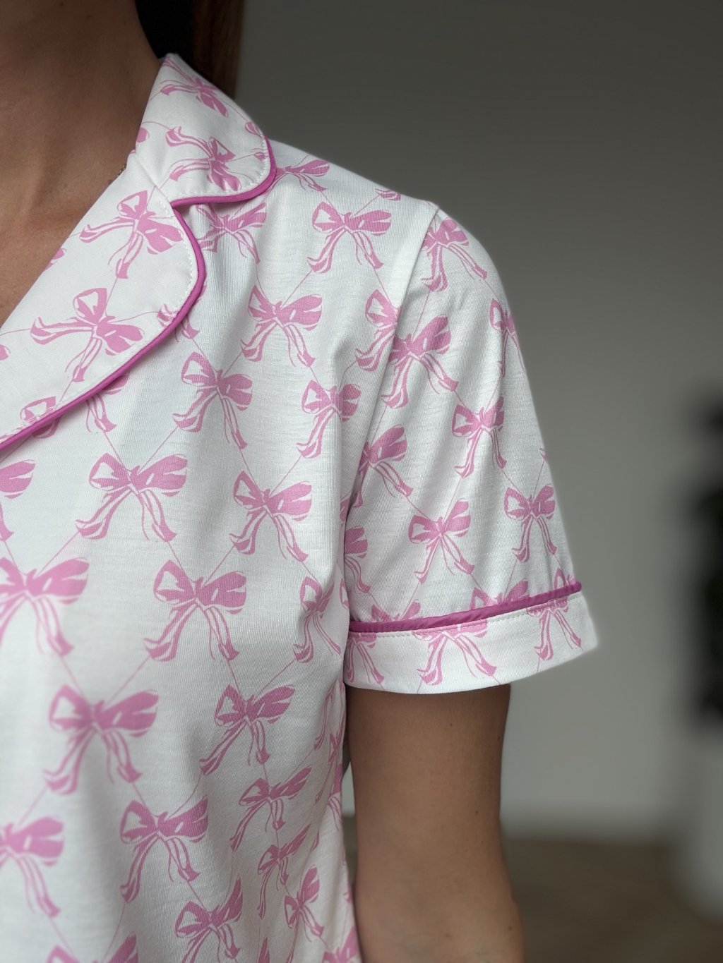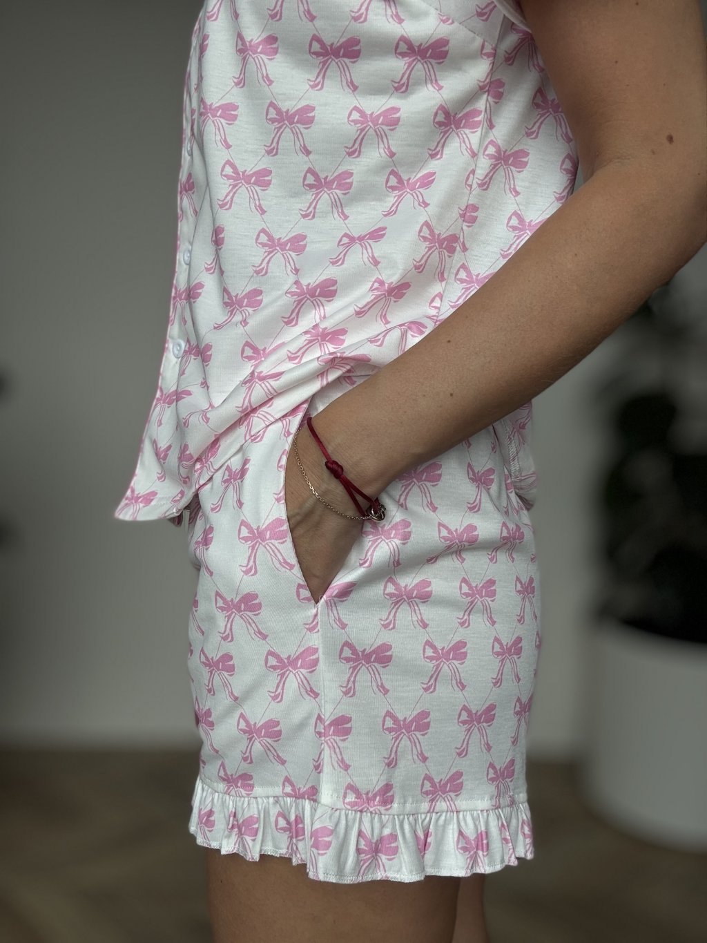 This women’s pajama set includes a short button-down top and matching shorts, offering a perfect blend of comfort and delicate feminine style. Made from soft fabric with a subtle floral print, it ensures a light and breathable feel for sleep or lounging. The shorts feature an elastic waistband with a drawstring and ruffled hems for a playful touch. With practical pockets and refined tailoring, this set is an ideal addition to your summer wardrobe.