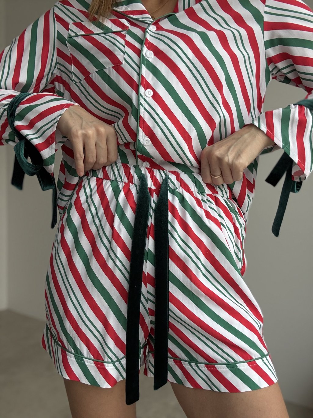Two-piece lounge set in a shirt style that combines a playful striped pattern with maximum comfort. The top comes in a relaxed fit with a classic collar and full button fastening, giving it a neat, shirt-like look for cosy mornings or evening lounging. Long sleeves are finished with decorative ties that add a subtle festive touch. The shorts feature an elasticated waistband with a drawstring, so they adapt comfortably to your waist without digging in while you sleep or relax at home. The lightweight, soft fabric feels pleasant on the skin and is perfect for cooler evenings as well as special moments spent at home.