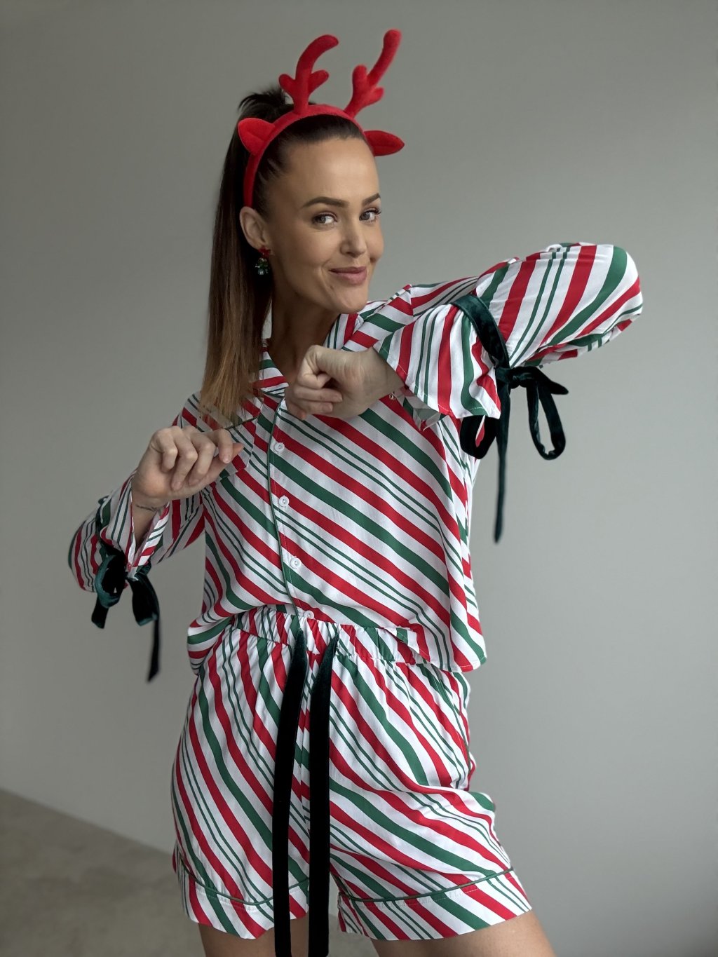 Two-piece shirt-style lounge set with a striped pattern, relaxed button-up top and elastic waist shorts, designed for comfortable sleep and cosy festive home wear.