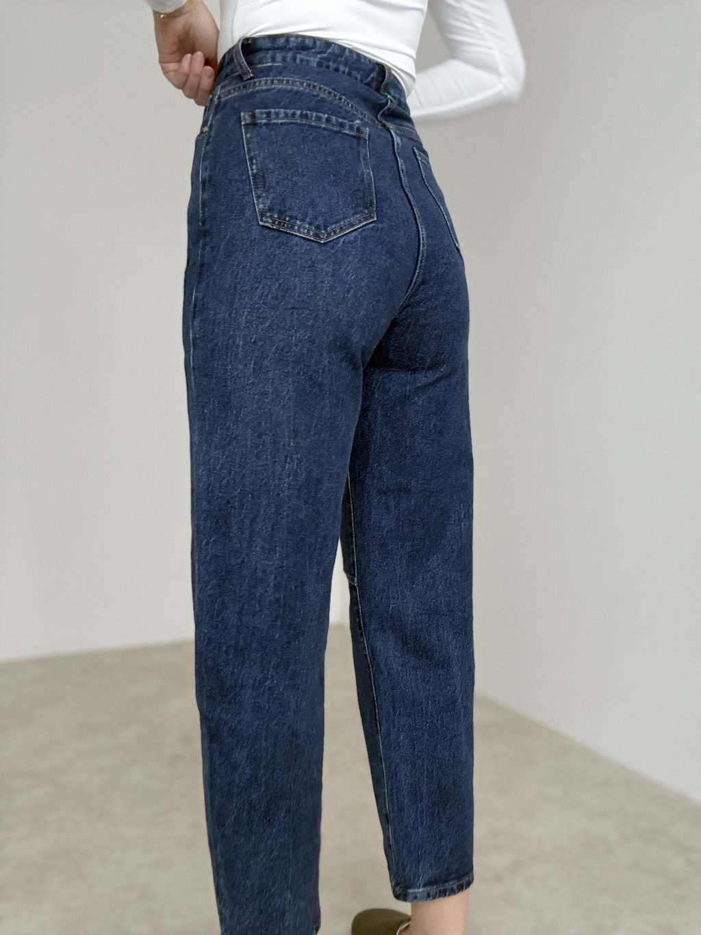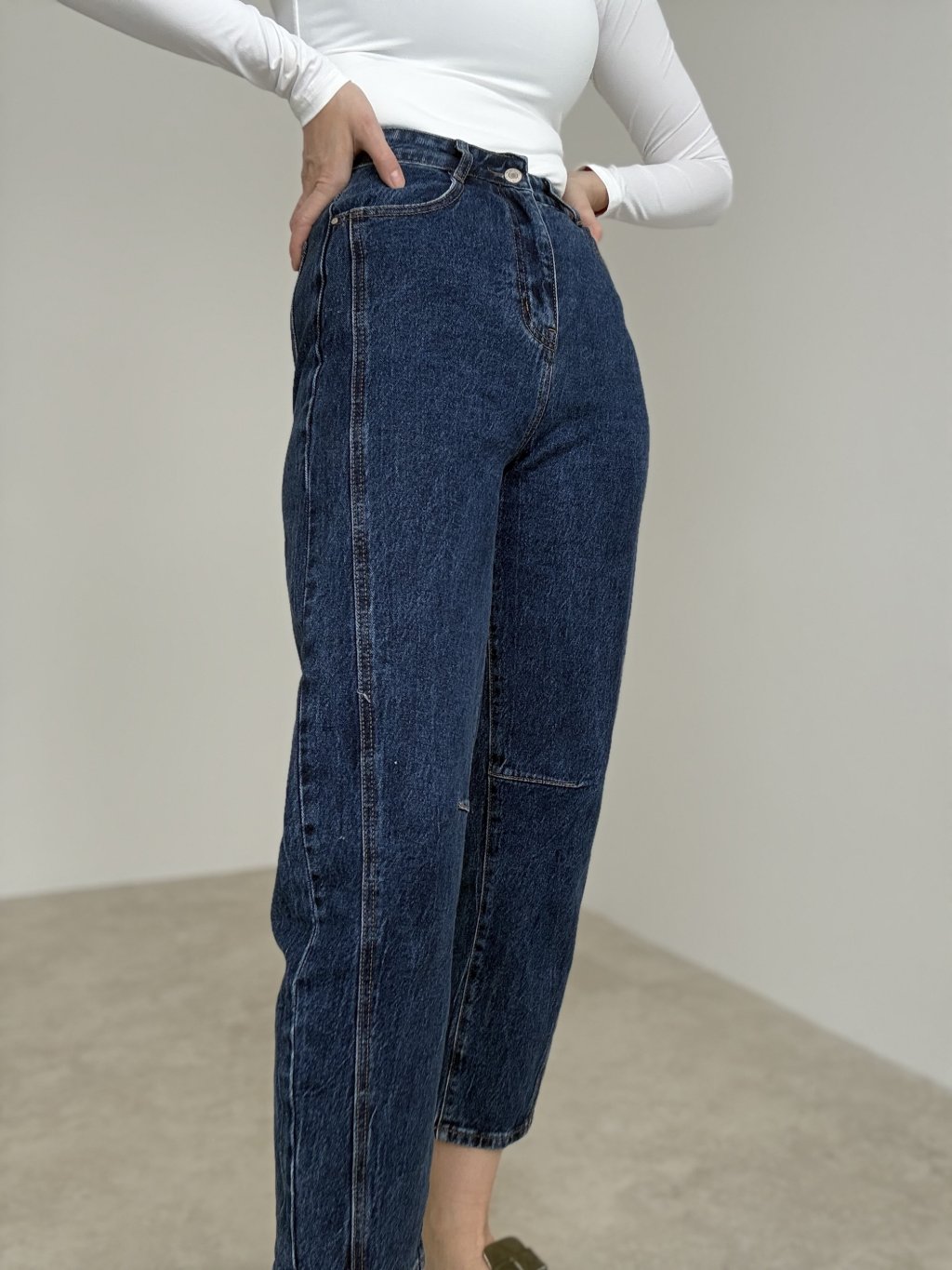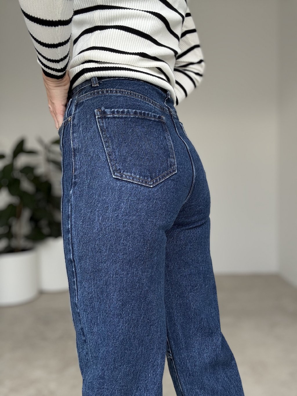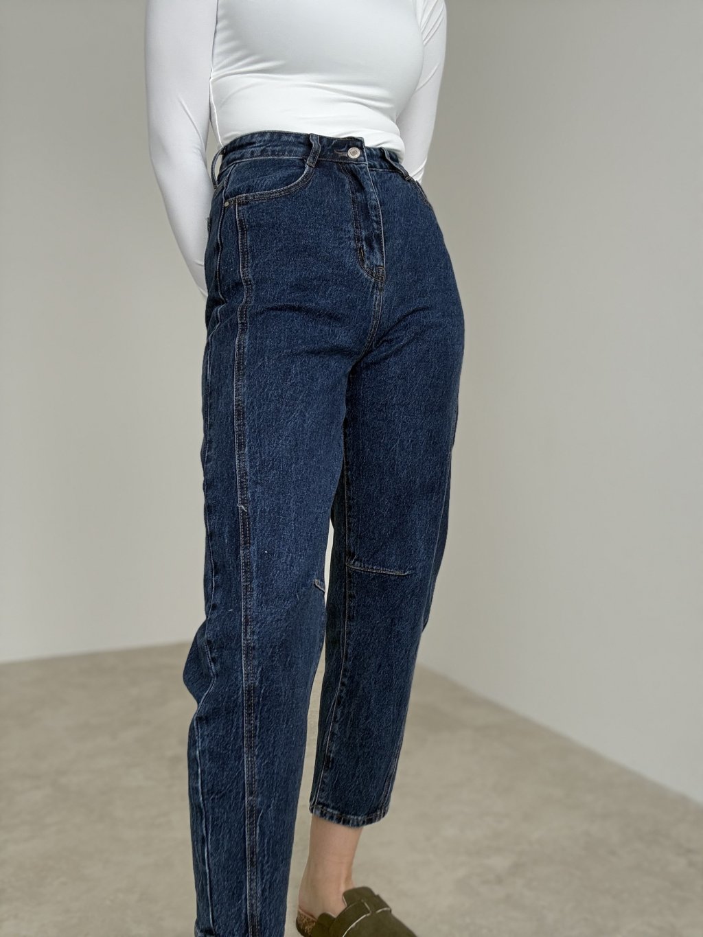 Jeans with a comfortable mid-to-high rise and a straight, slightly tapered fit. Decorative seams along the legs visually elongate the silhouette and give a clean, minimalist look. The firm denim with a touch of stretch adapts nicely to the body and maintains its shape throughout the day. Classic zip and button fastening with front and back pockets. Versatile length that pairs well with sneakers or ankle boots. Wash inside out on a gentle cycle.
