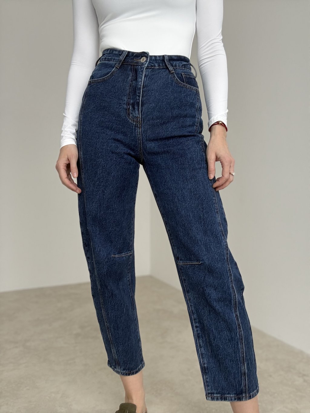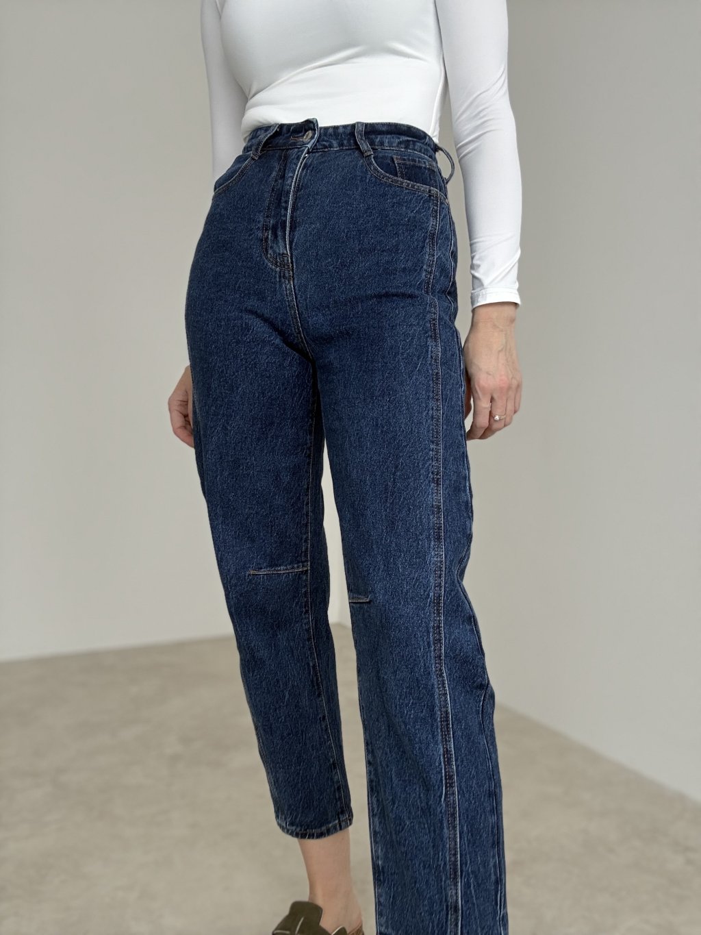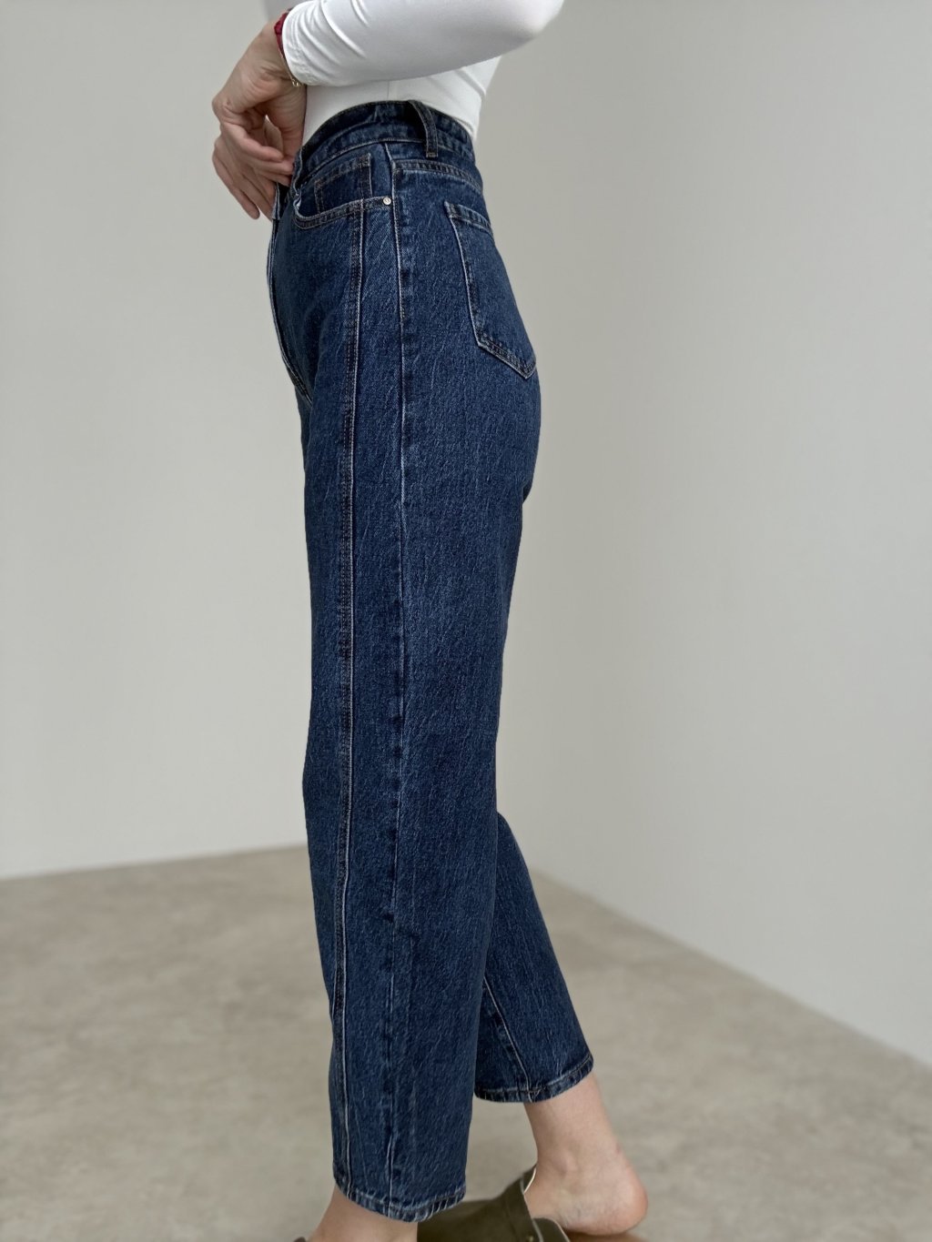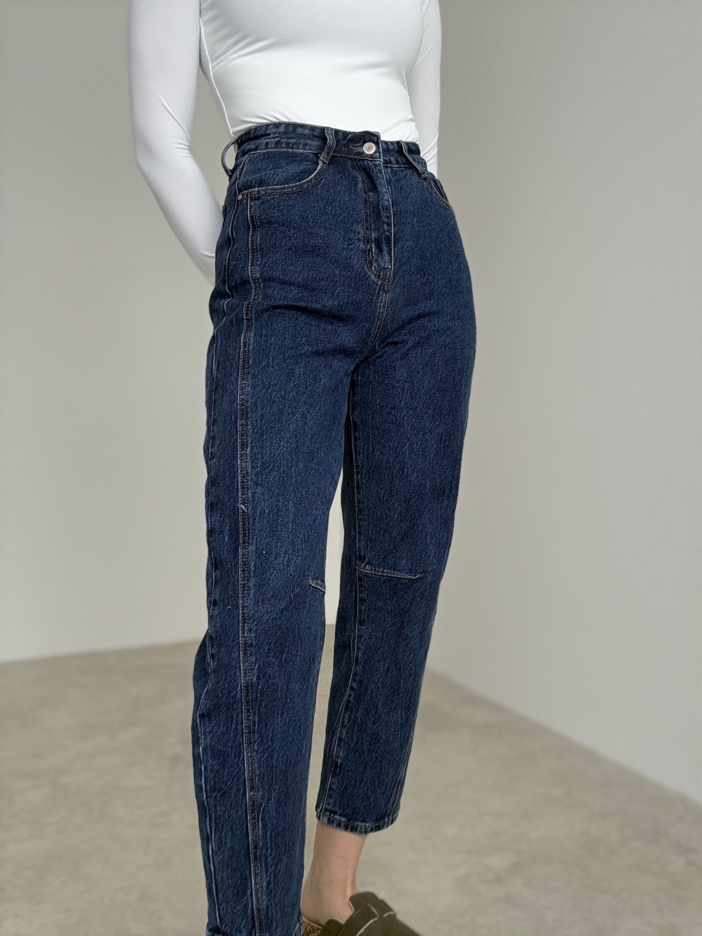 Straight jeans with mid-to-high rise and elongating seam details for a clean, modern look.