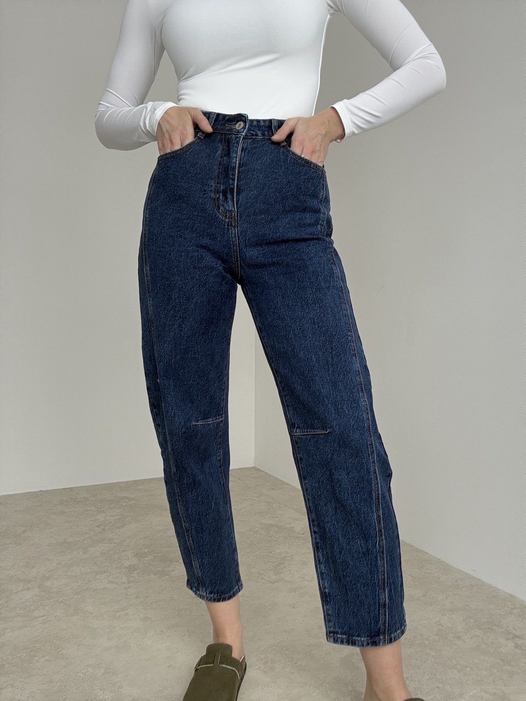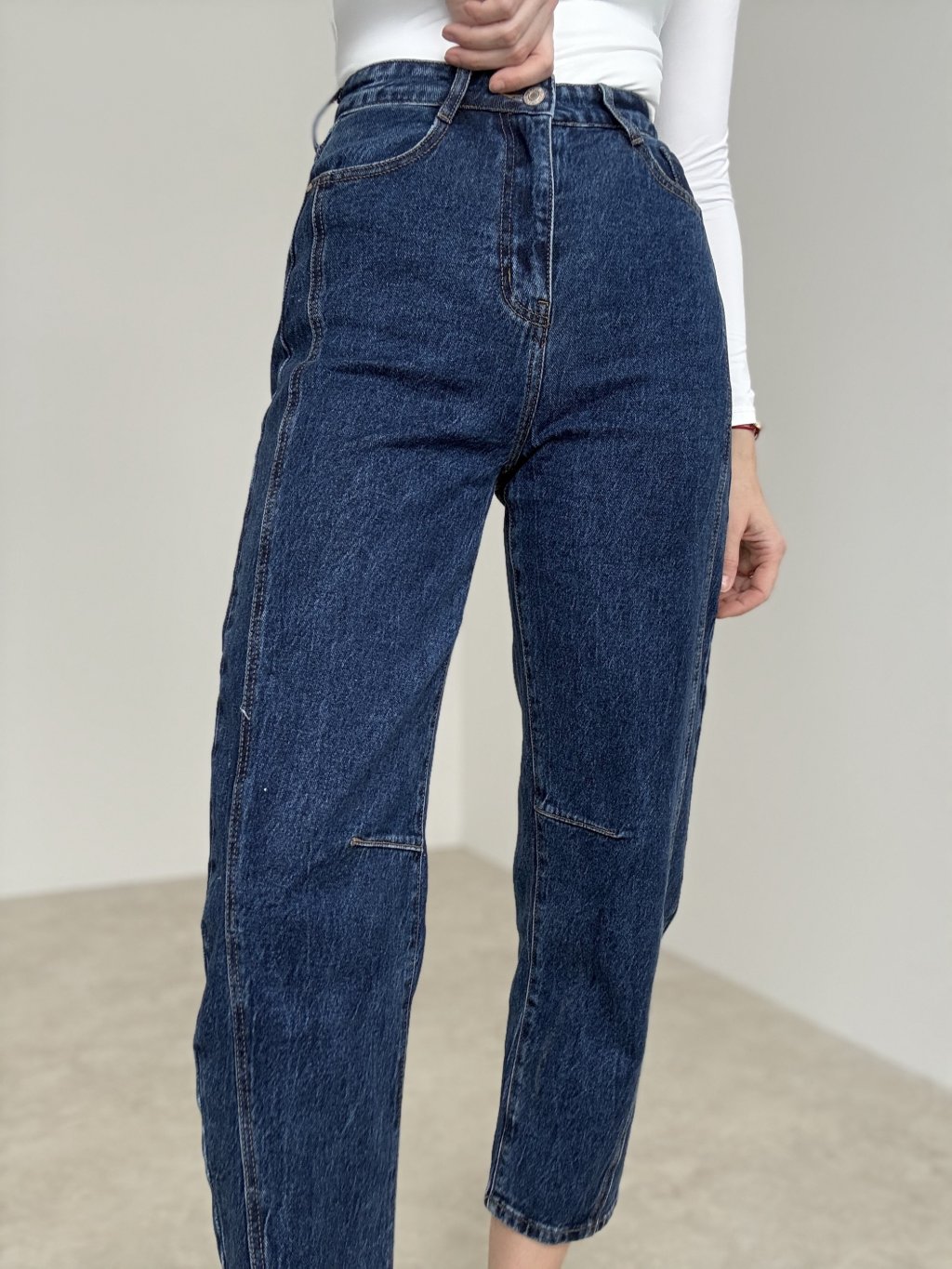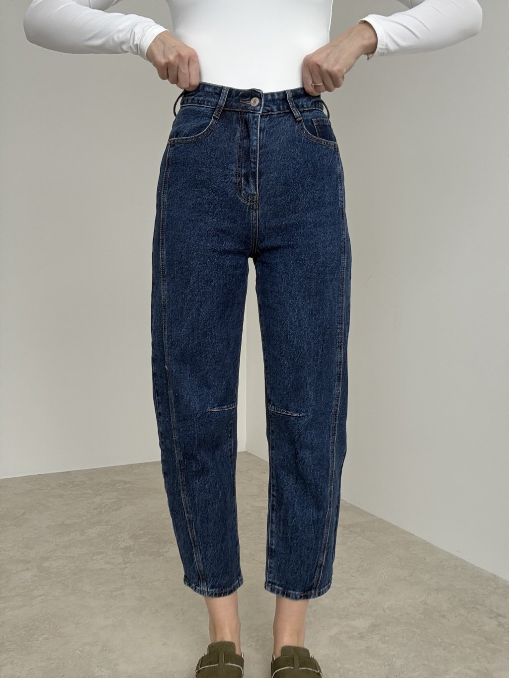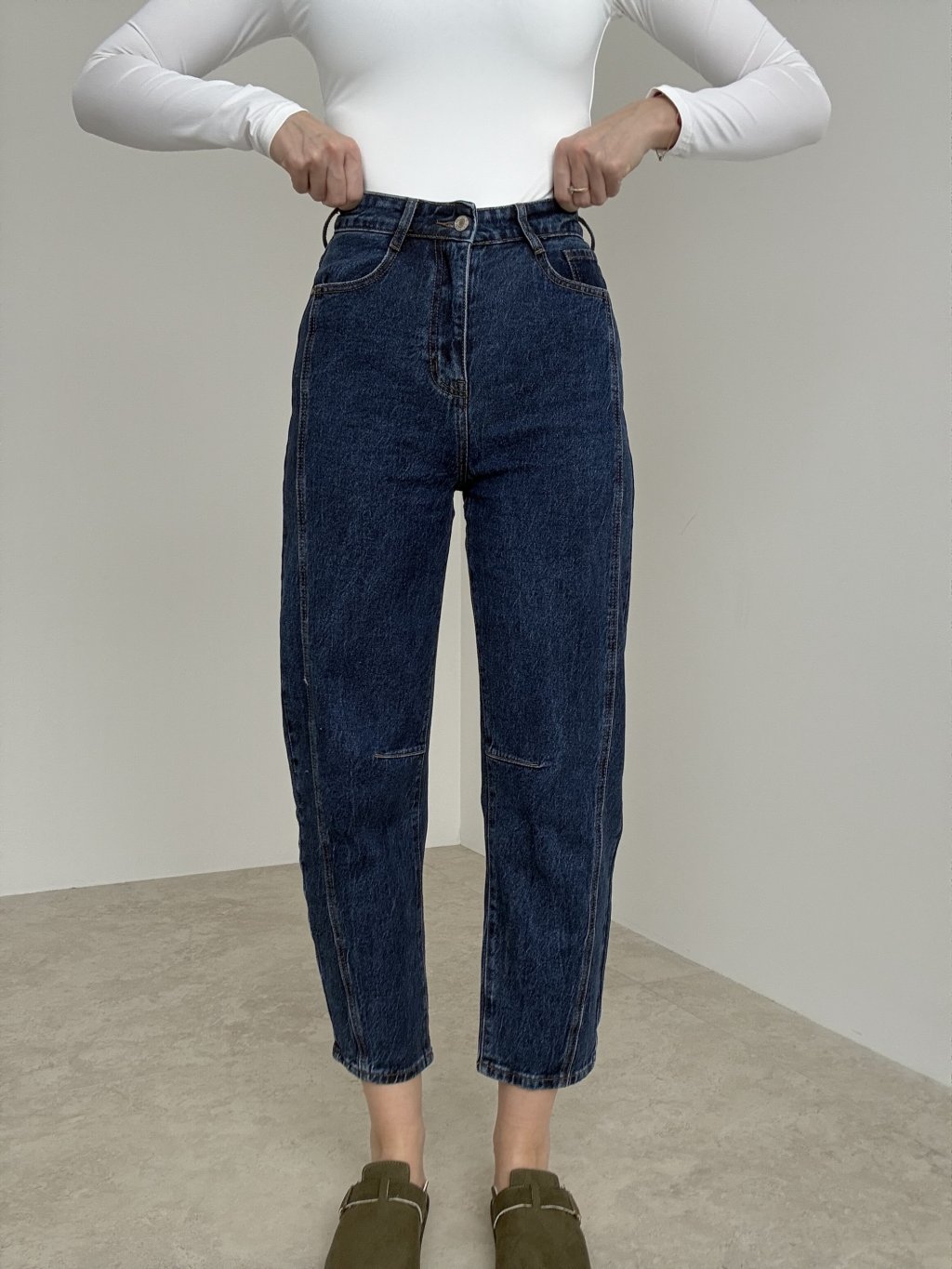 Straight jeans with mid-to-high rise and elongating seam details for a clean, modern look.