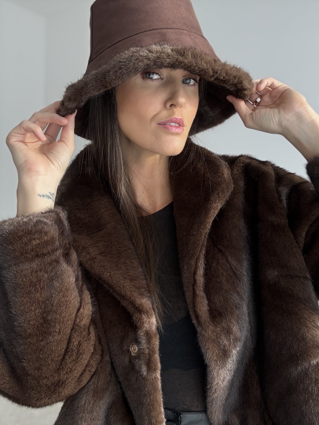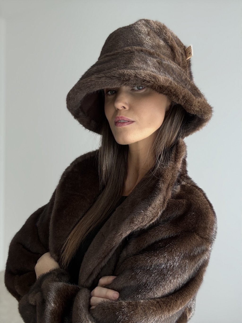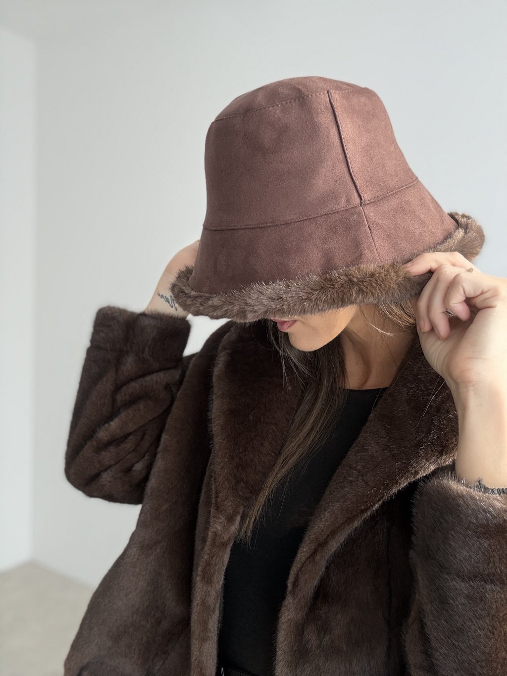 This reversible bucket hat is the perfect choice for colder days when you want to stay warm and stylish at the same time. One side features a smooth, suede-like finish for a clean and elegant look, while the other side is made from soft faux-fur that adds warmth and a touch of luxury to any outfit. Thanks to its structured design, the hat keeps its shape, comfortably hugs your head and protects you from wind and cold.