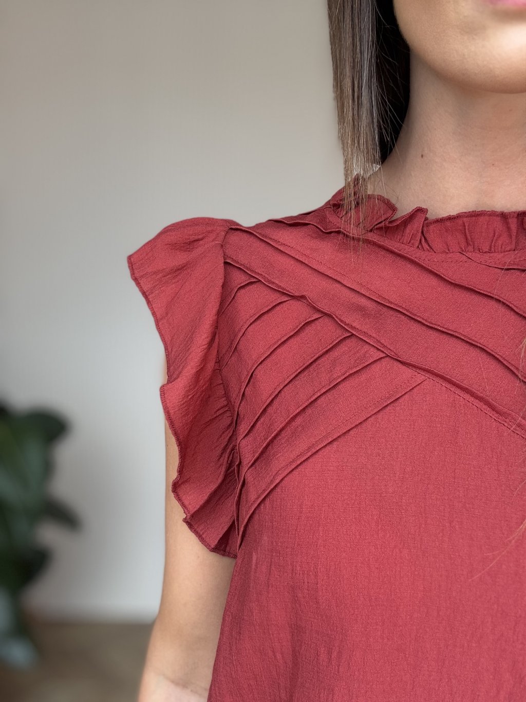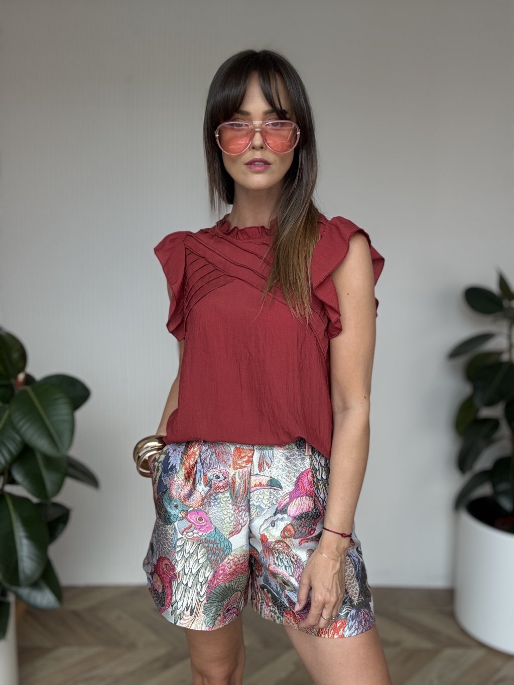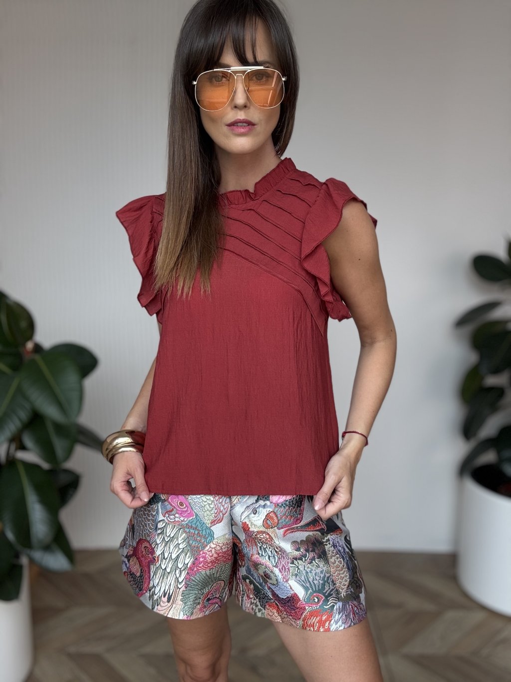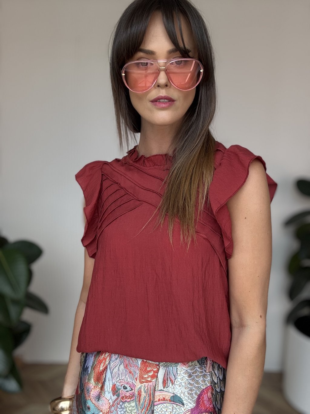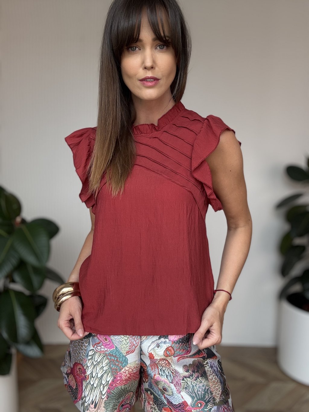 Blouse with ruffled sleeves and decorative pleats, suitable for everyday wear or more elegant occasions.