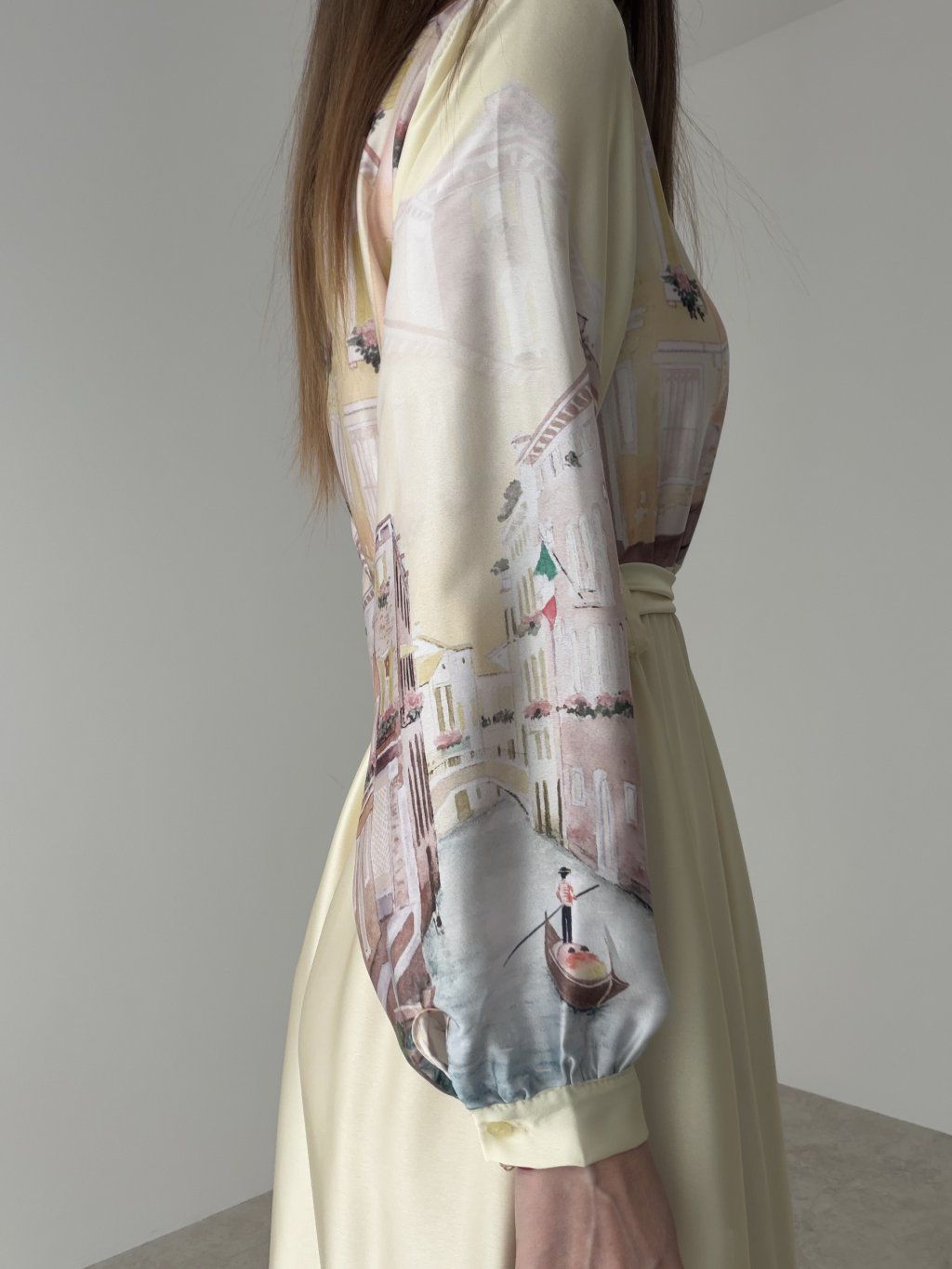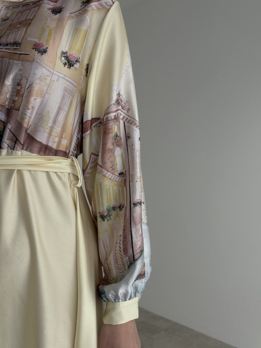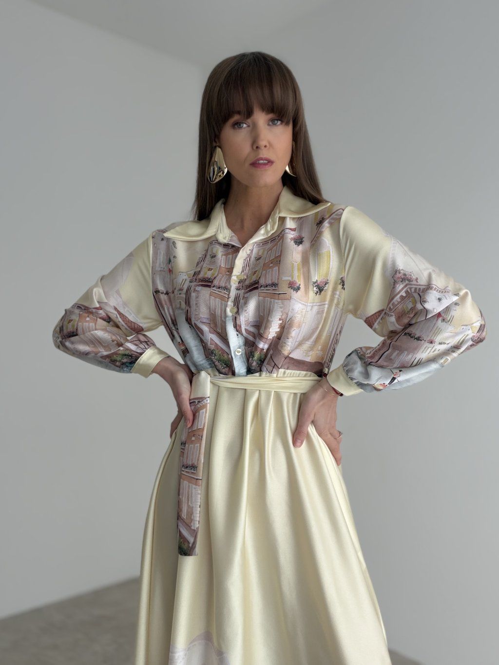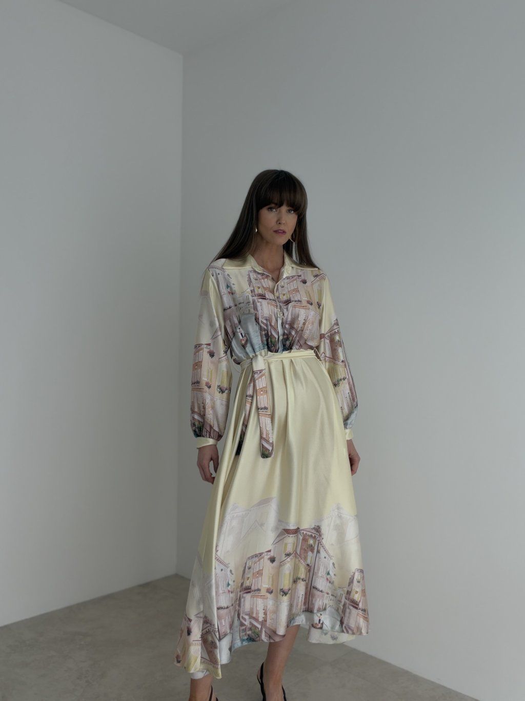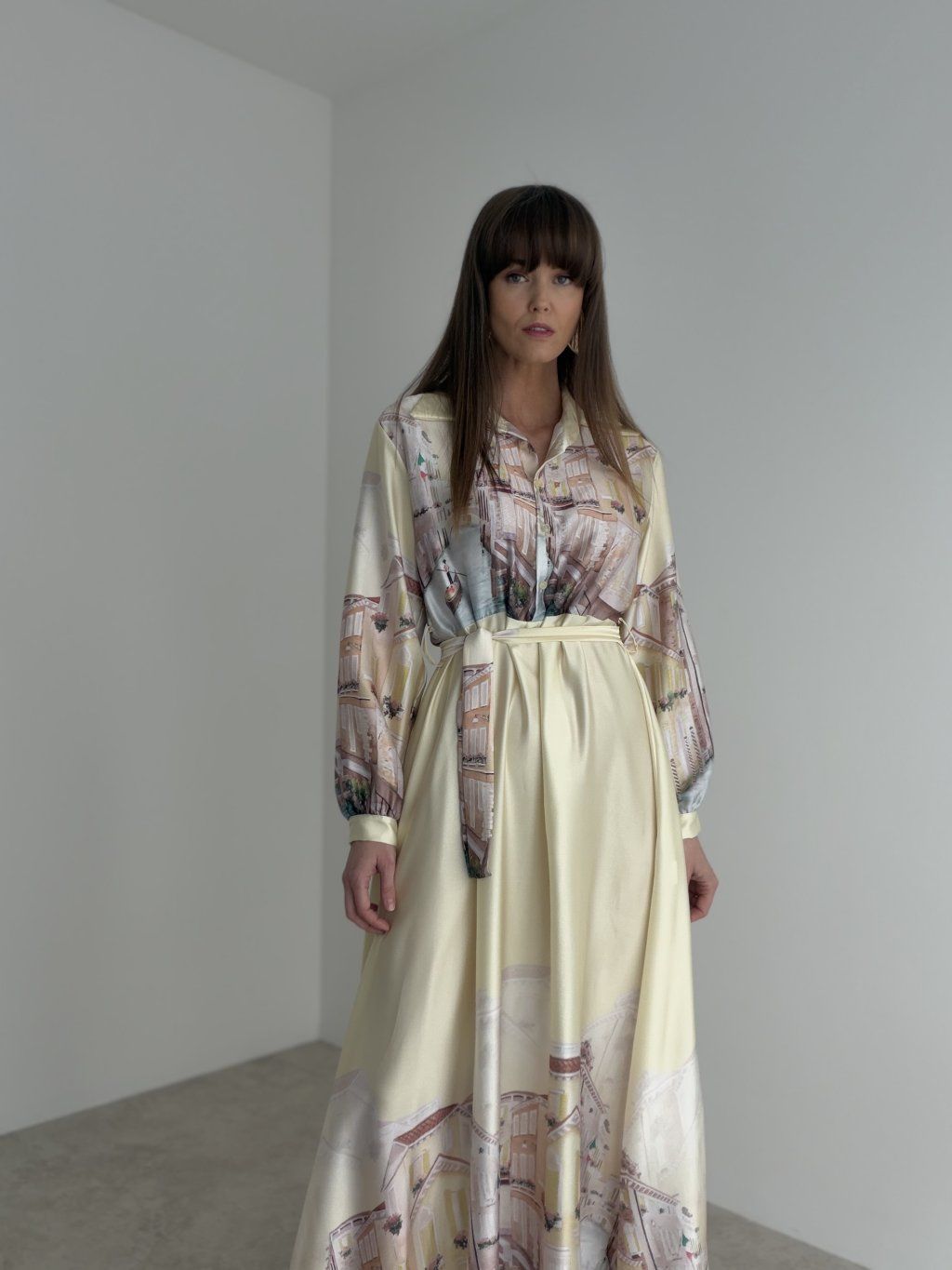 This satin dress feels elegant, soft, and beautifully feminine. Its flowing fabric gives the design a light and sophisticated look, while the waist tie nicely enhances the silhouette. The collar and long sleeves add a polished and timeless touch, making the dress suitable for special occasions as well as for moments when you want to look truly refined. The delicate print gives the piece an original accent and makes it stand out while still remaining elegant. The fabric is slightly sheer, so we recommend wearing nude or discreet underwear underneath.