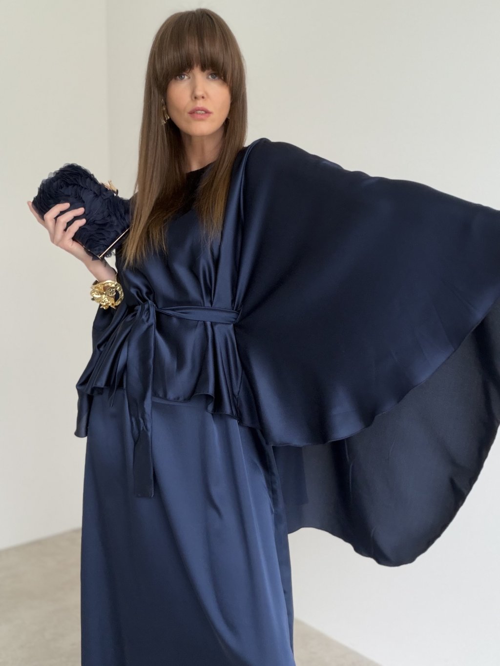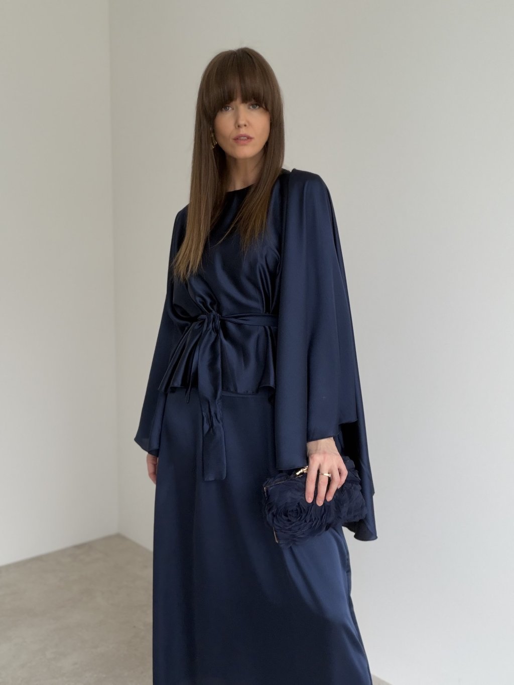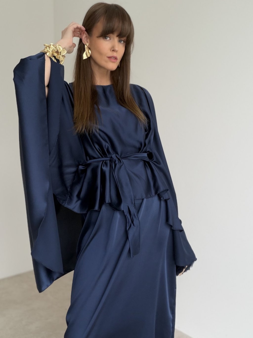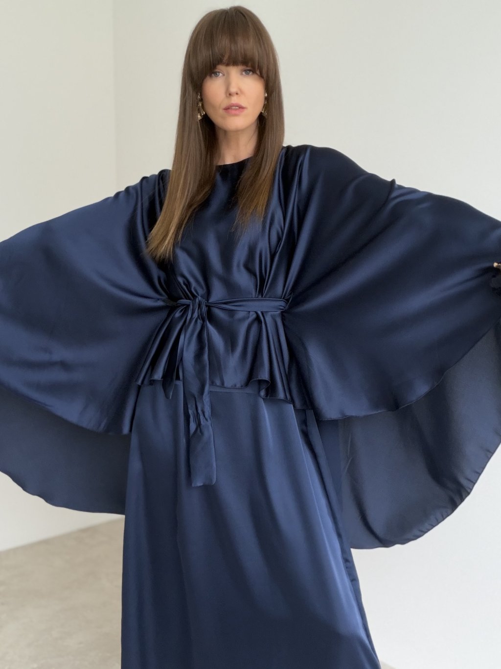 Elegant satin dress with a flowing kaftan-style cut, wide sleeves and a waist tie—perfect for formal and festive occasions.