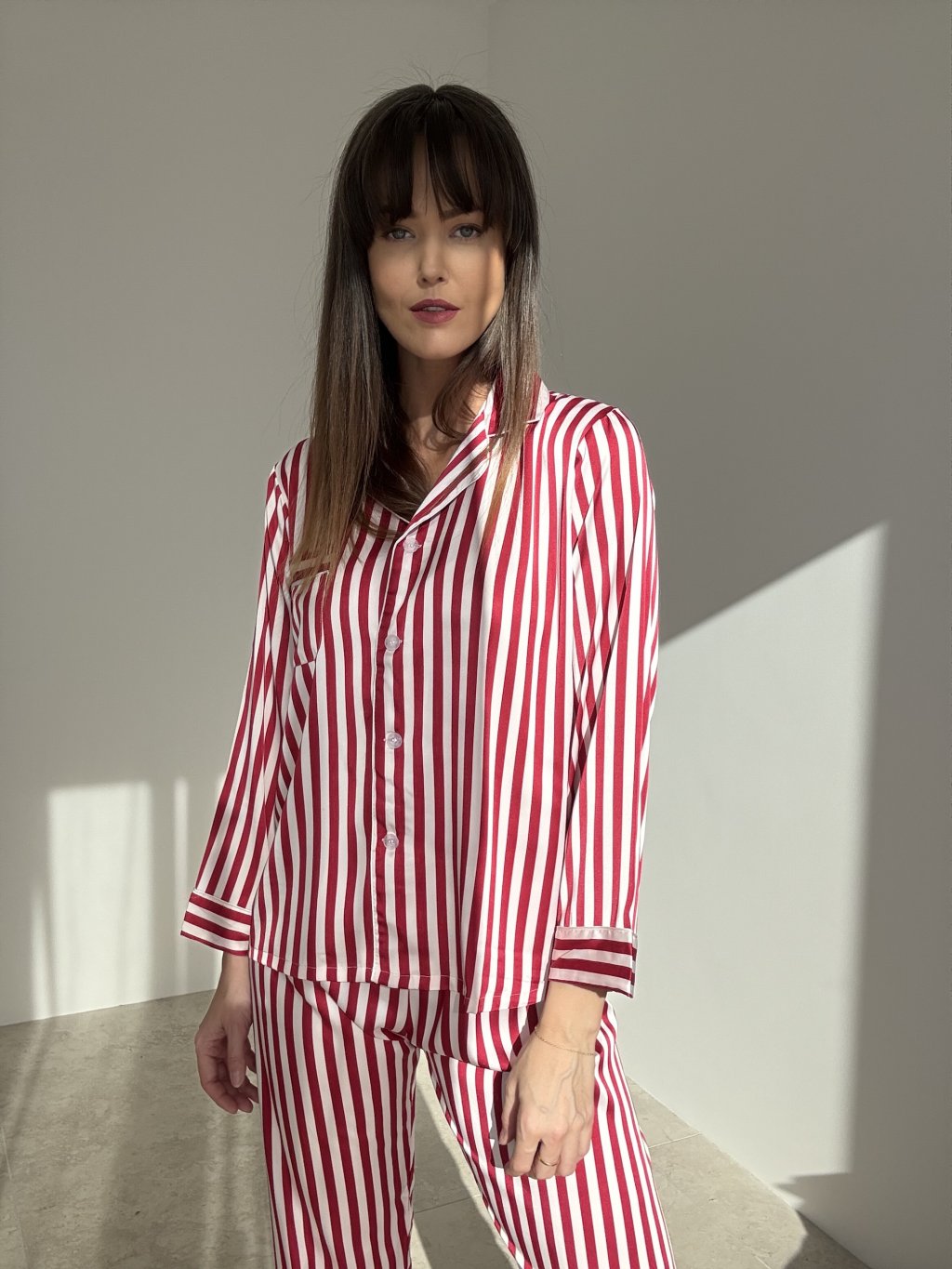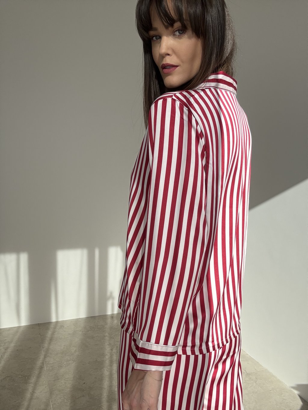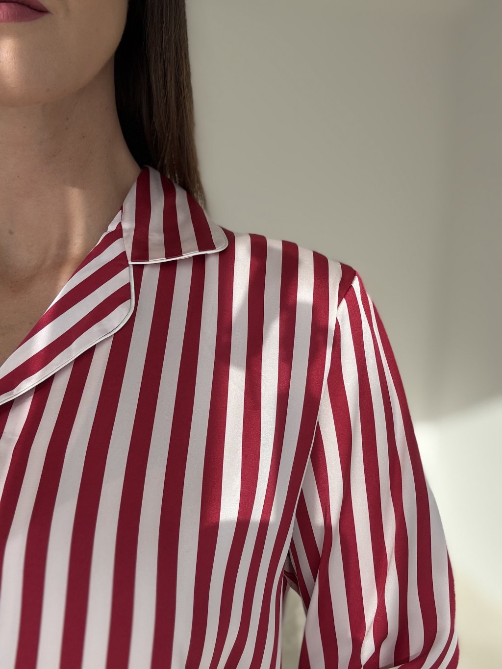 A silky satin two-piece pajama set with a subtle sheen and timeless stripes, crafted to feel soft and gentle against the skin. The shirt features a classic notched collar and button fastening for easy wear and layering. The mid-rise trousers have a comfortable elastic waistband and a relaxed straight leg. The lightweight, breathable fabric moves beautifully with the body, perfect for restful nights and cozy lounging. Refined finishing creates an elegant, feminine look with lasting comfort.