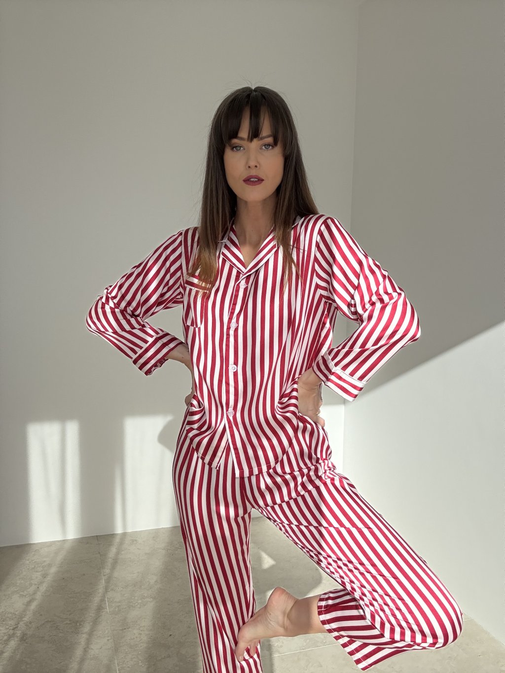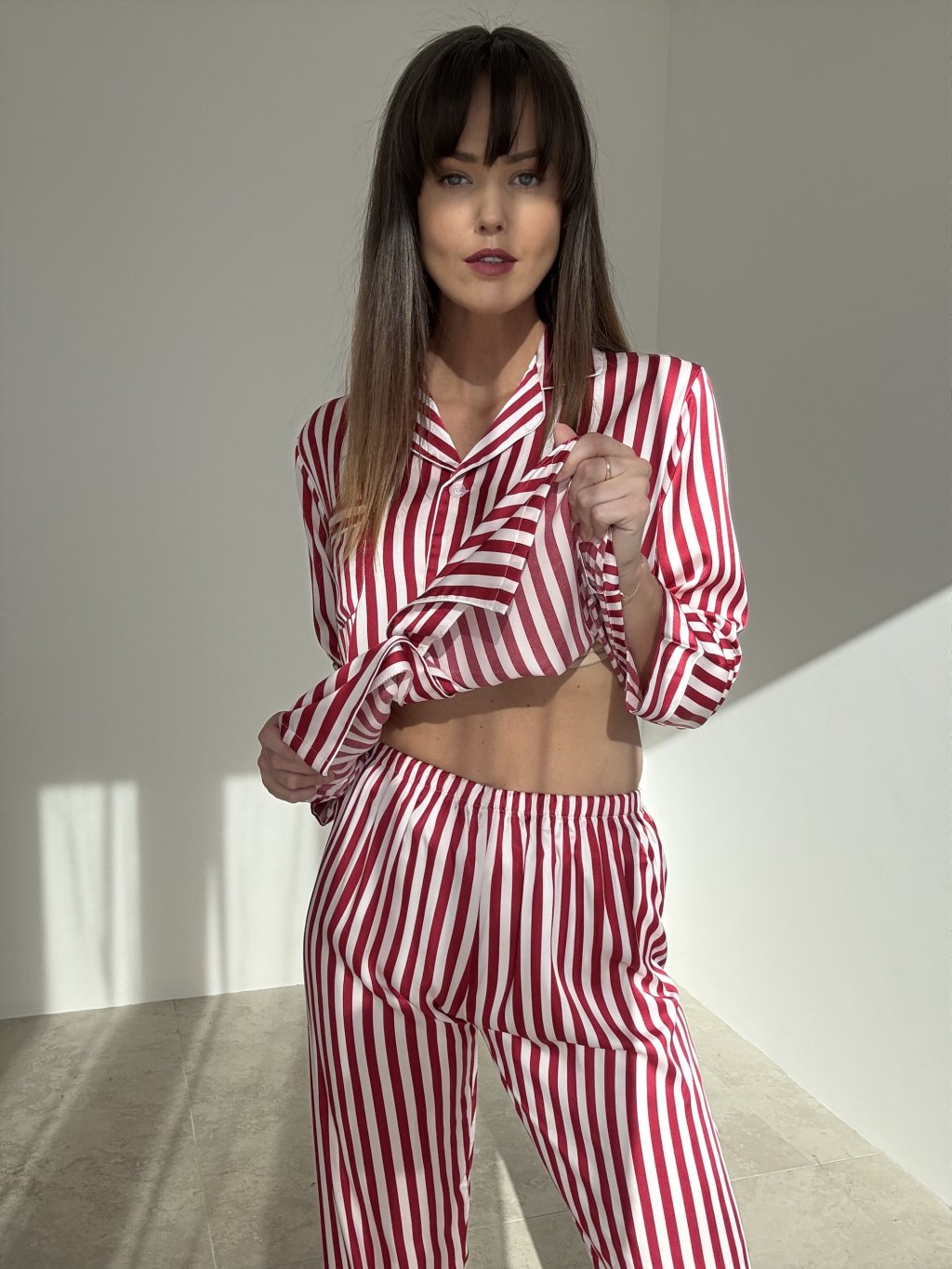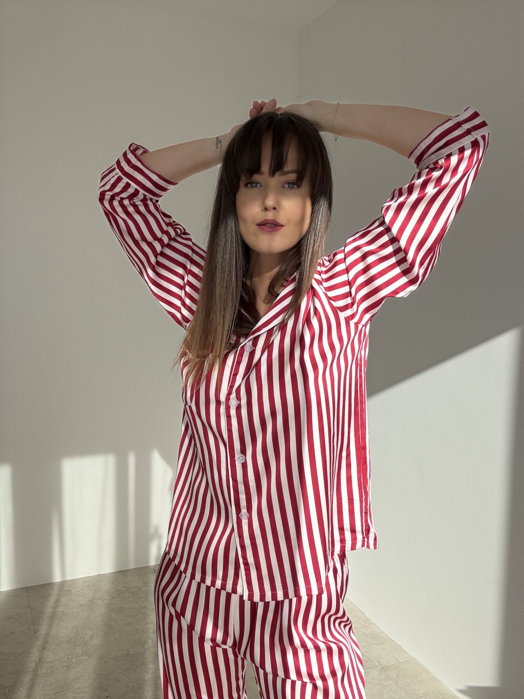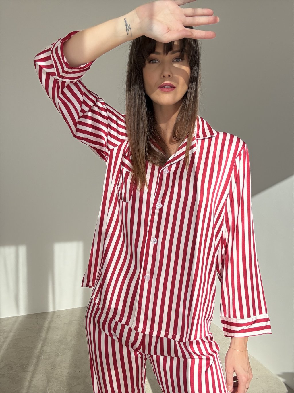 A silky satin two-piece pajama set with a subtle sheen and timeless stripes, crafted to feel soft and gentle against the skin. The shirt features a classic notched collar and button fastening for easy wear and layering. The mid-rise trousers have a comfortable elastic waistband and a relaxed straight leg. The lightweight, breathable fabric moves beautifully with the body, perfect for restful nights and cozy lounging. Refined finishing creates an elegant, feminine look with lasting comfort.