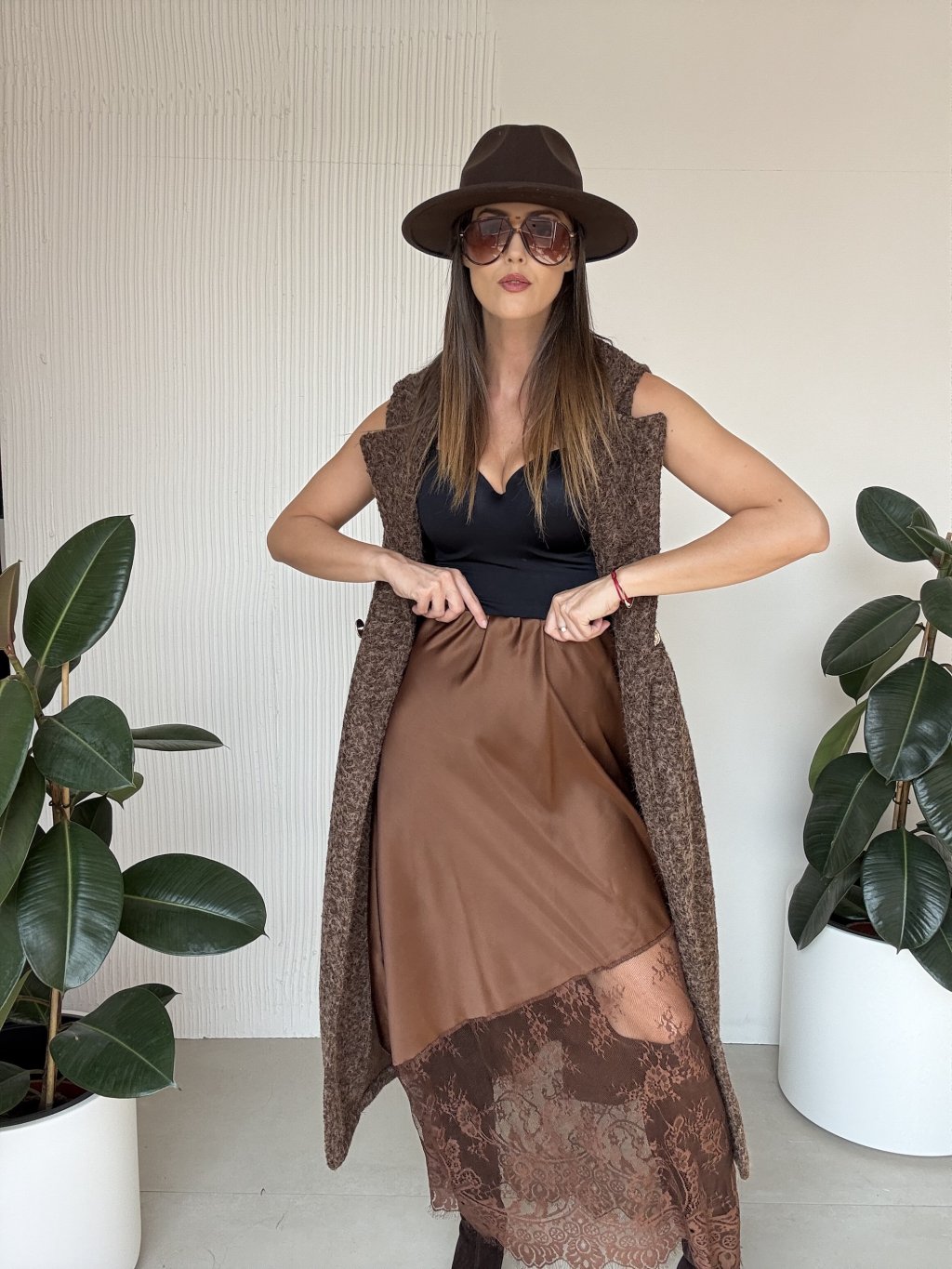 A satin skirt with an asymmetrical cut, designed to stand out with its originality and feminine touch. The lower part is decorated with delicate floral lace, bringing a romantic and airy feel. The elastic waistband ensures comfort and a flattering fit. Perfect for social events, evening occasions, or elevating an everyday outfit with elegance.
