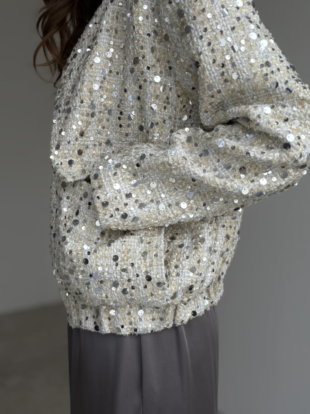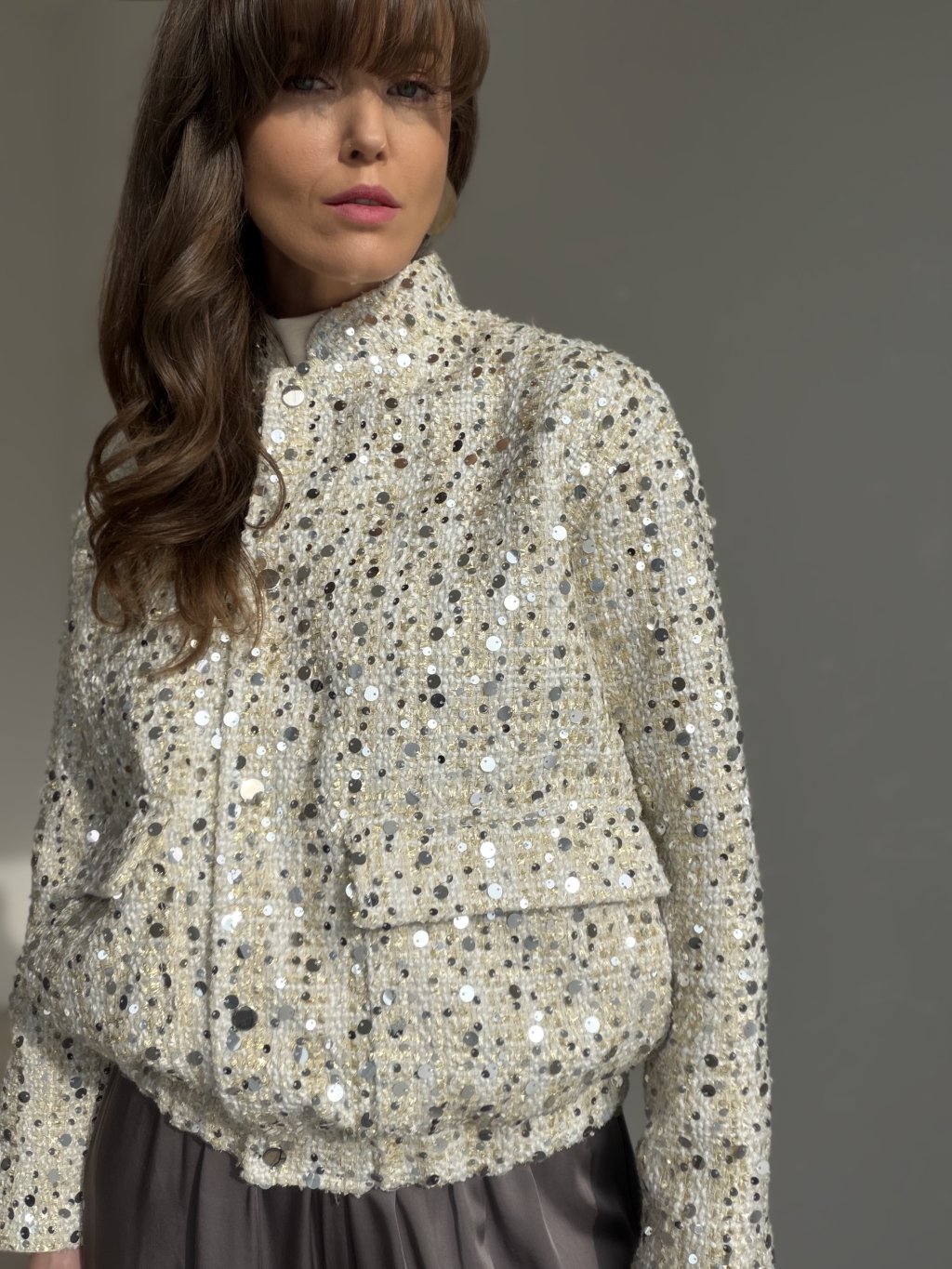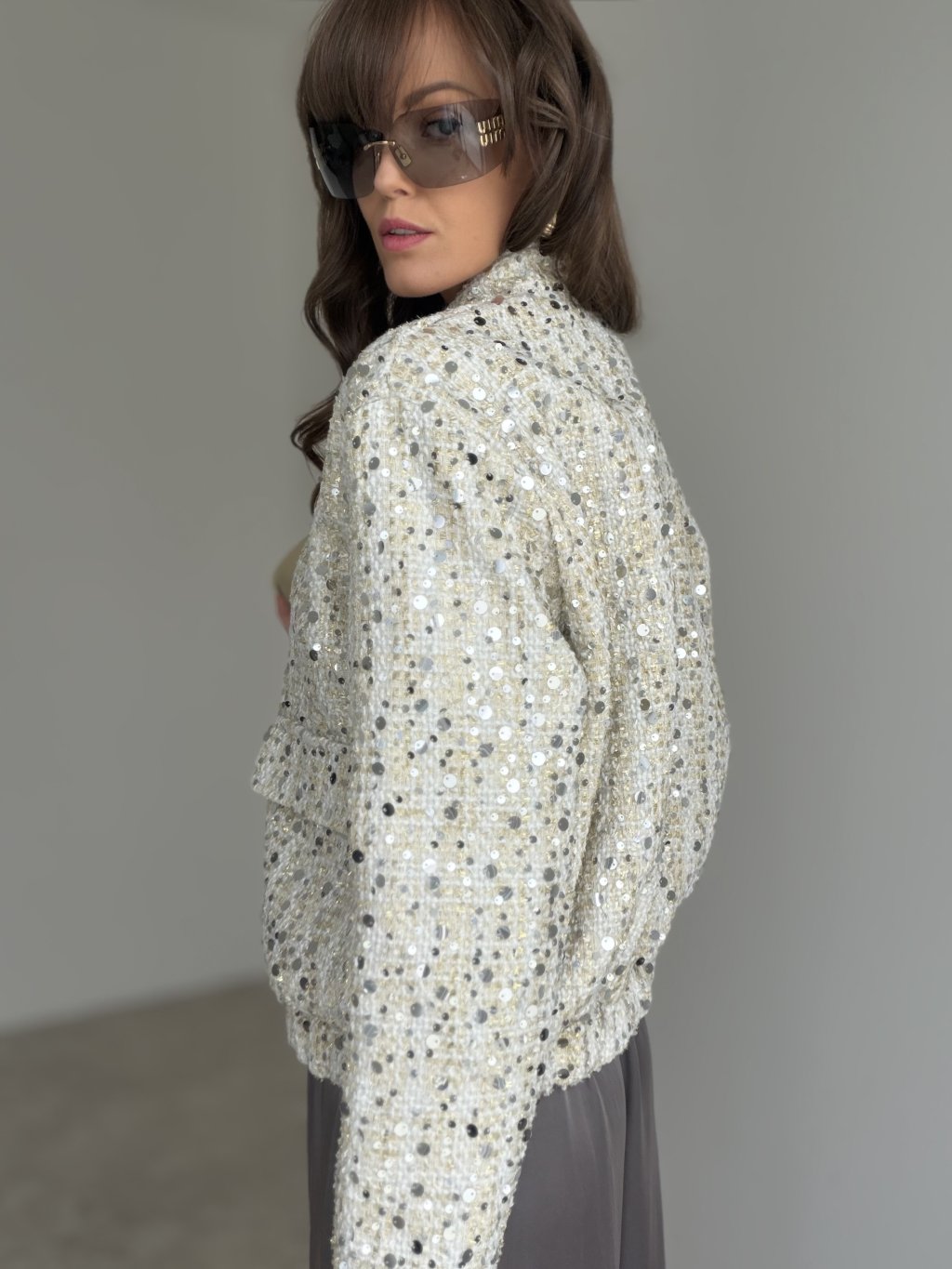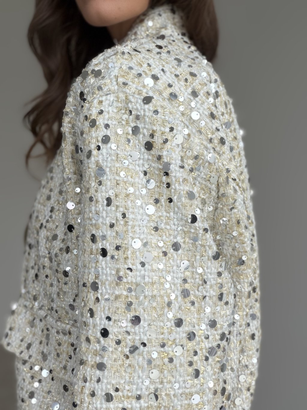 This sequin-effect jacket is a statement piece that still feels refined and wearable. It features a neat, slightly structured silhouette that holds its shape and instantly elevates even the simplest outfit. The front closure and practical pockets make it easy to style for everyday looks, not only for special occasions. Pair it with satin trousers, a skirt, or a clean high-neck top when you want a polished, modern finish.