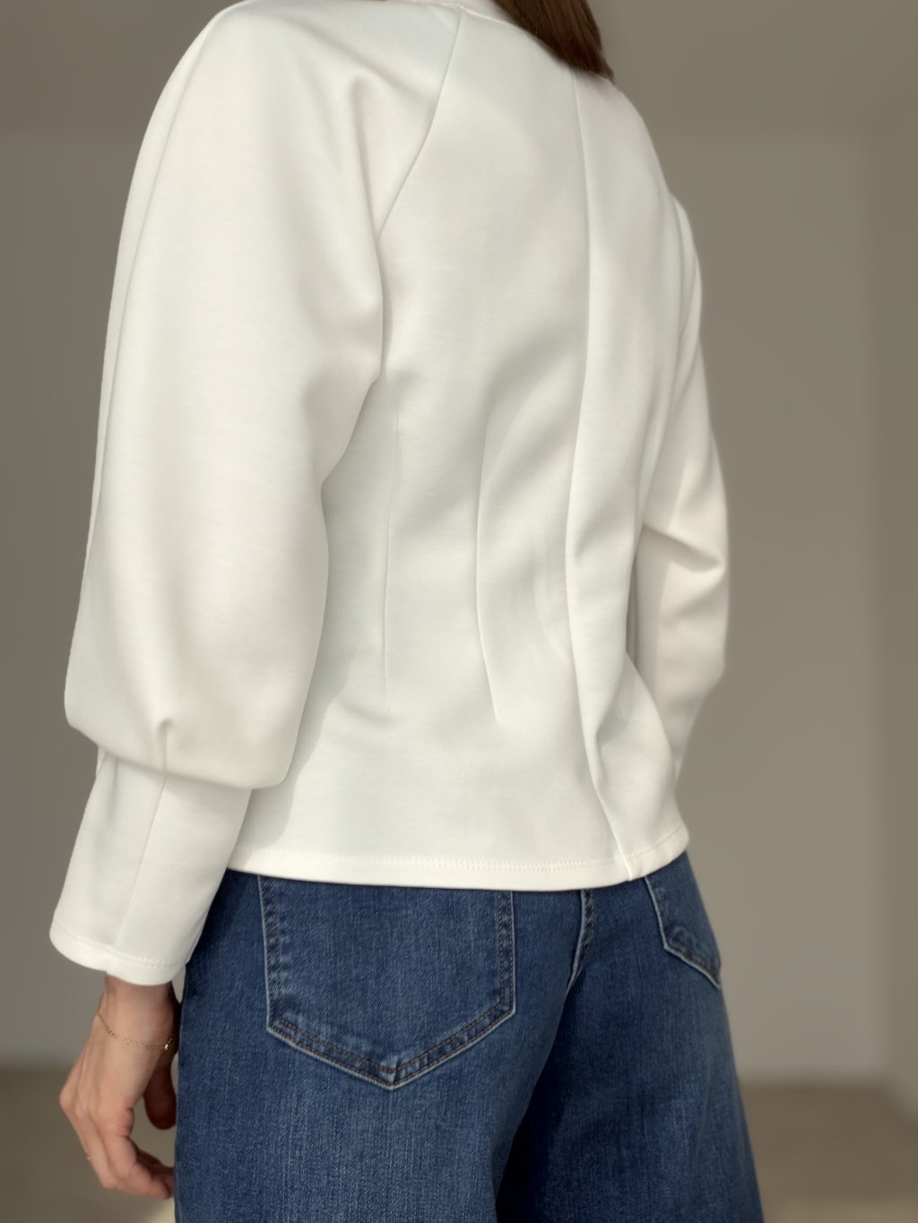 The minimalist design is complemented by long sleeves and clean lines that give the piece a modern and timeless appearance. The cut is designed to gently emphasize the waist and naturally follow the shape of the body. The back features subtle seams that add an interesting detail while enhancing the shaping effect.