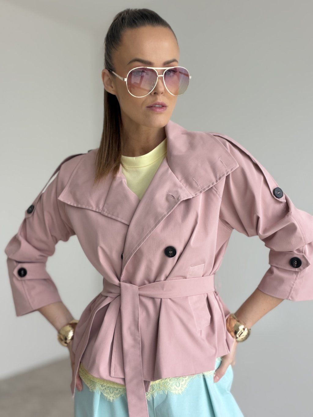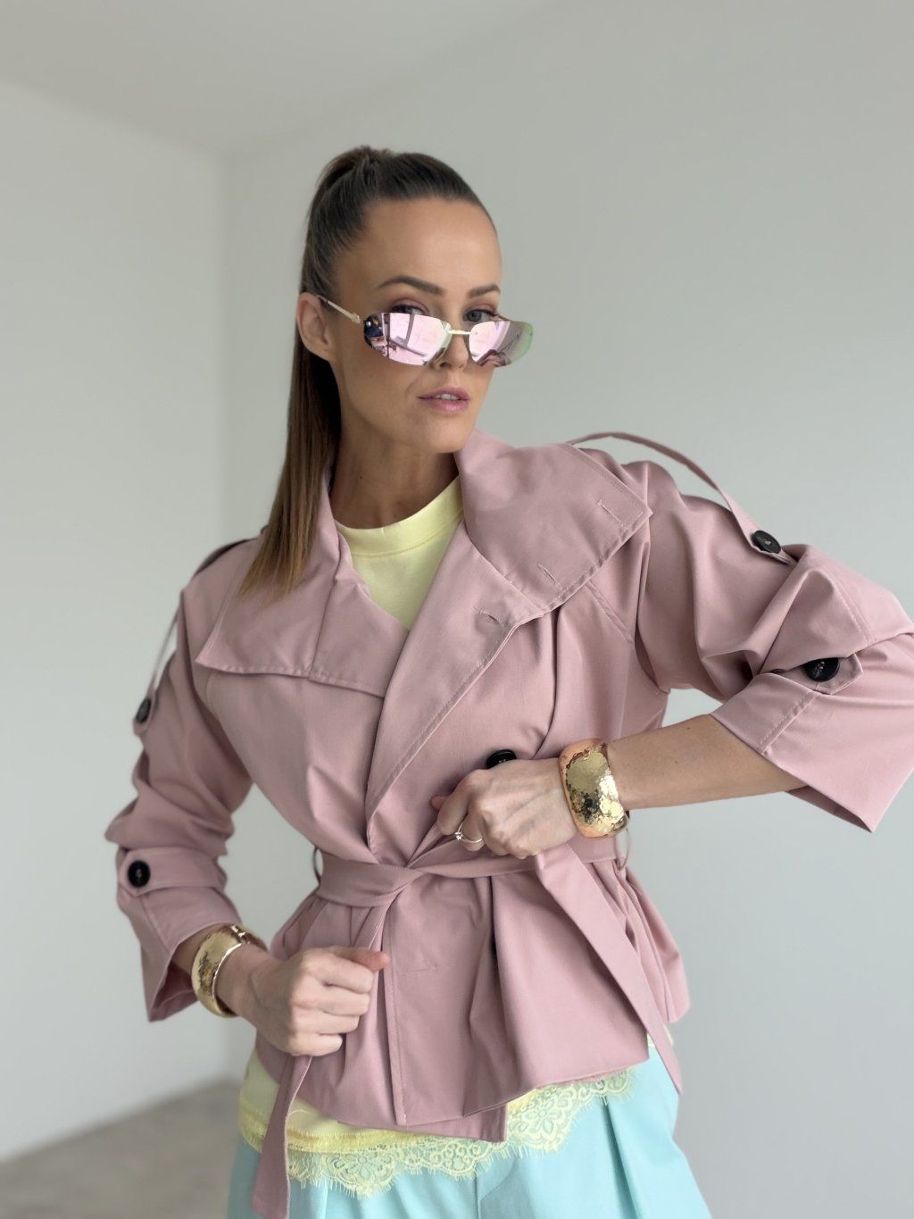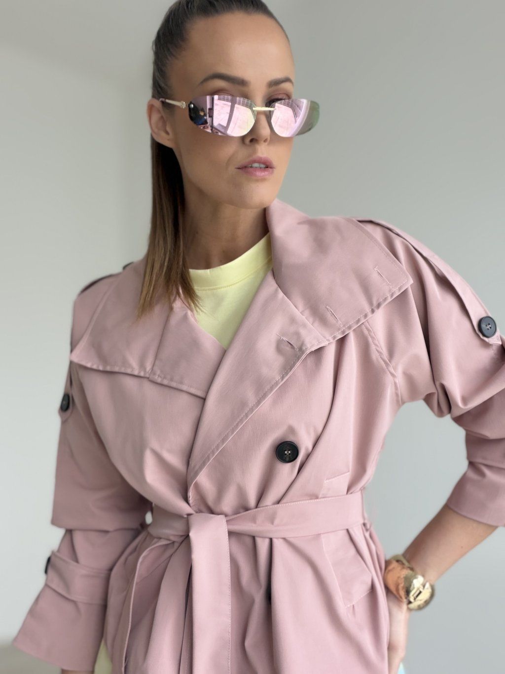 A modern short trench coat designed to deliver a polished look with minimal effort. The shorter, flattering cut highlights the waist thanks to the tie belt, while still letting your trousers or skirt stand out. Double-breasted fastening, a statement collar, and refined sleeve details give it a timeless feel. The fabric looks structured yet comfortable, helping the coat keep its shape and stay elegant throughout the day. Perfect for city outfits, workwear styling, or an evening plan—just switch up the accessories.