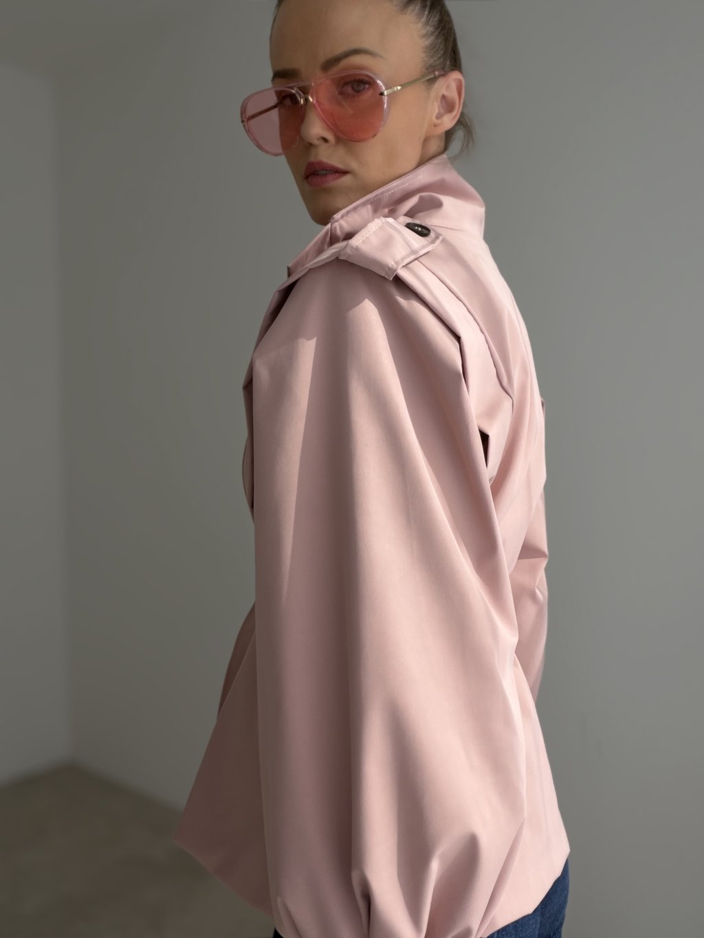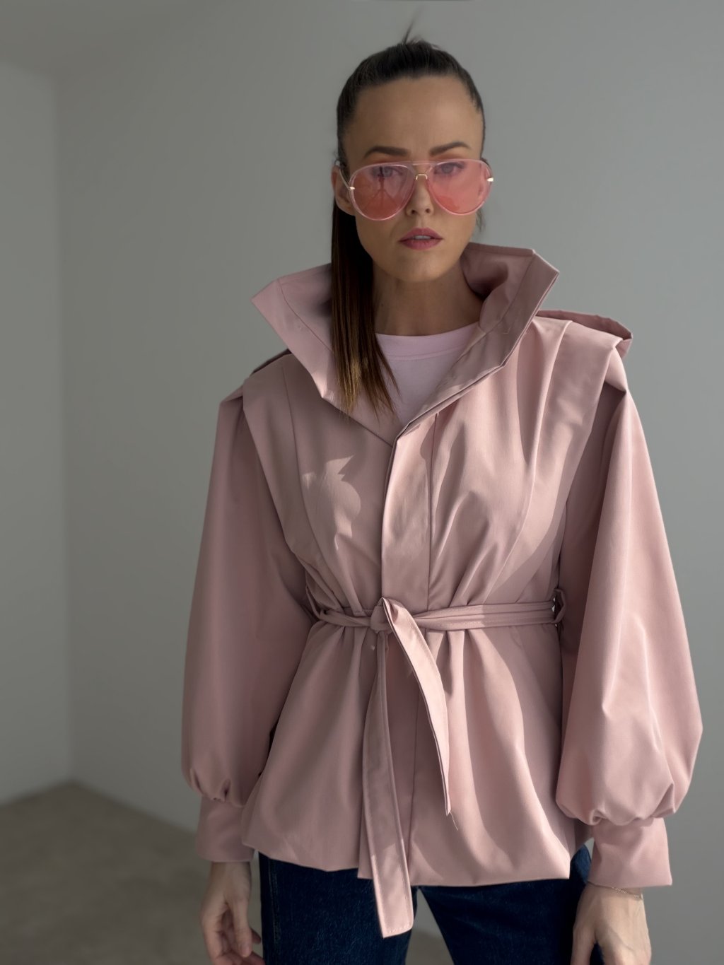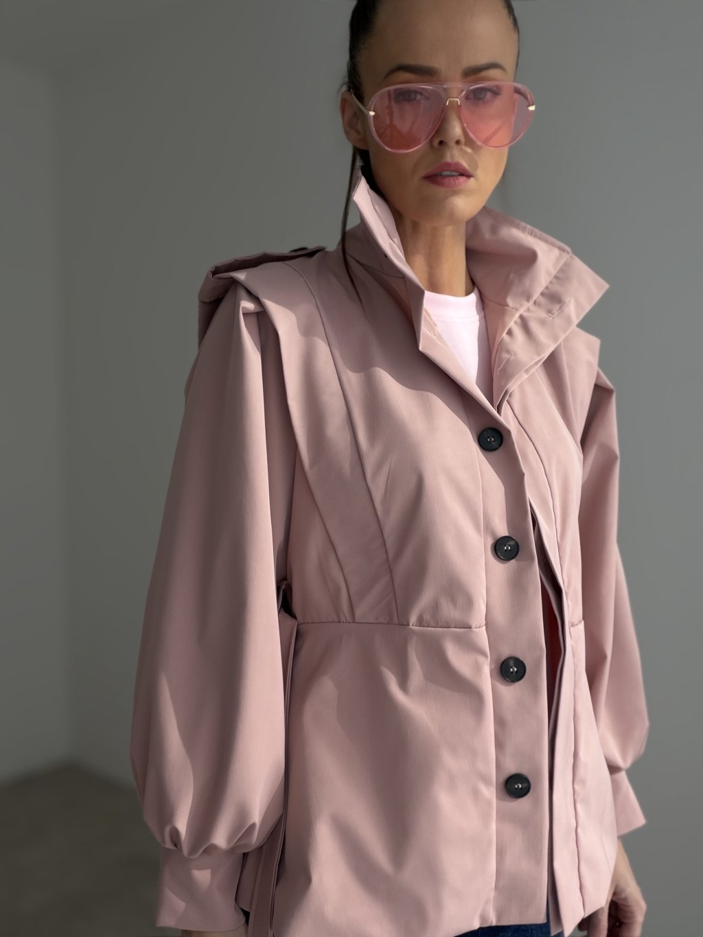 This short trench coat is a modern statement piece with a structured feel that instantly elevates any outfit. The cropped length works perfectly with high-waisted trousers and skirts, keeping the look light yet polished. Voluminous sleeves with sculpted shaping and a refined shoulder detail create an architectural silhouette that stands out while remaining elegant. Button fastening and a waist belt allow you to wear it open for effortless layering or cinched to define the waist. It’s a versatile transitional style suitable for everyday wear as well as a more dressed-up look.