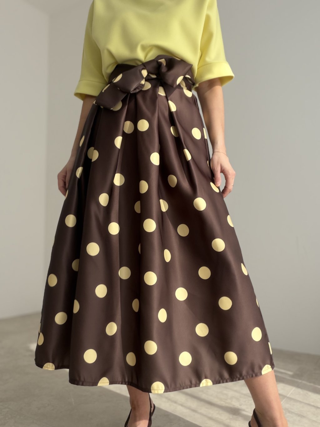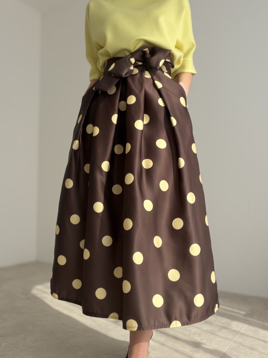 A feminine skirt with a playful, elegant, and stylish feel. This design stands out with its bold pattern, beautifully voluminous silhouette, and well-shaped waistband that enhances the figure. The waistband also features comfortable elastic, allowing the skirt to adapt nicely to the body and feel comfortable throughout the day.