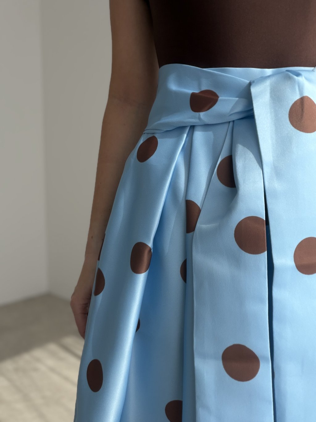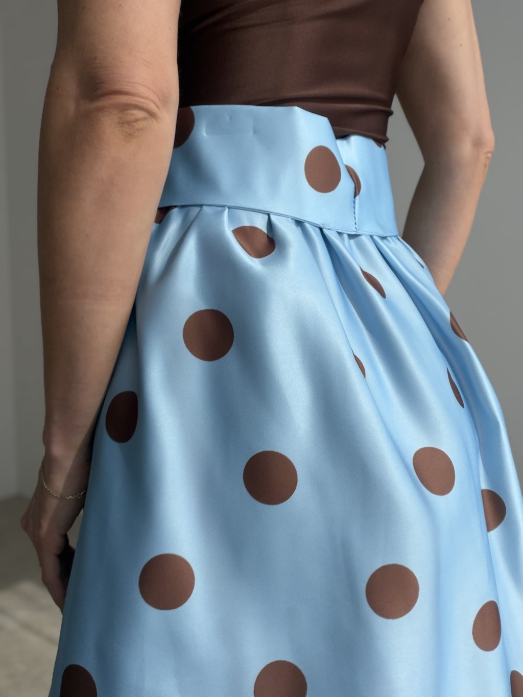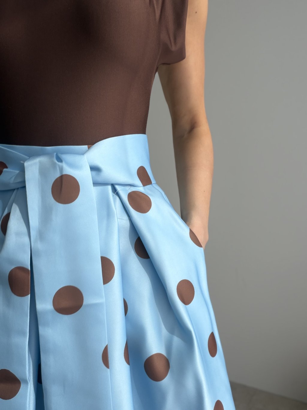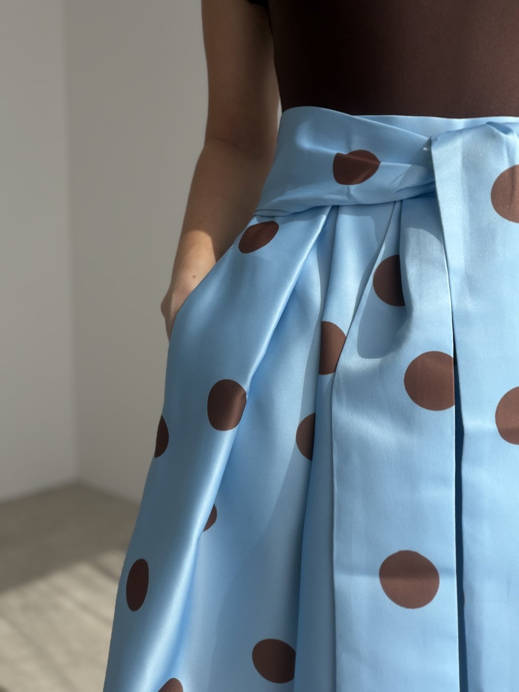A feminine skirt with a playful, elegant, and stylish feel. This design stands out with its bold pattern, beautifully voluminous silhouette, and well-shaped waistband that enhances the figure. The waistband also features comfortable elastic, allowing the skirt to adapt nicely to the body and feel comfortable throughout the day.