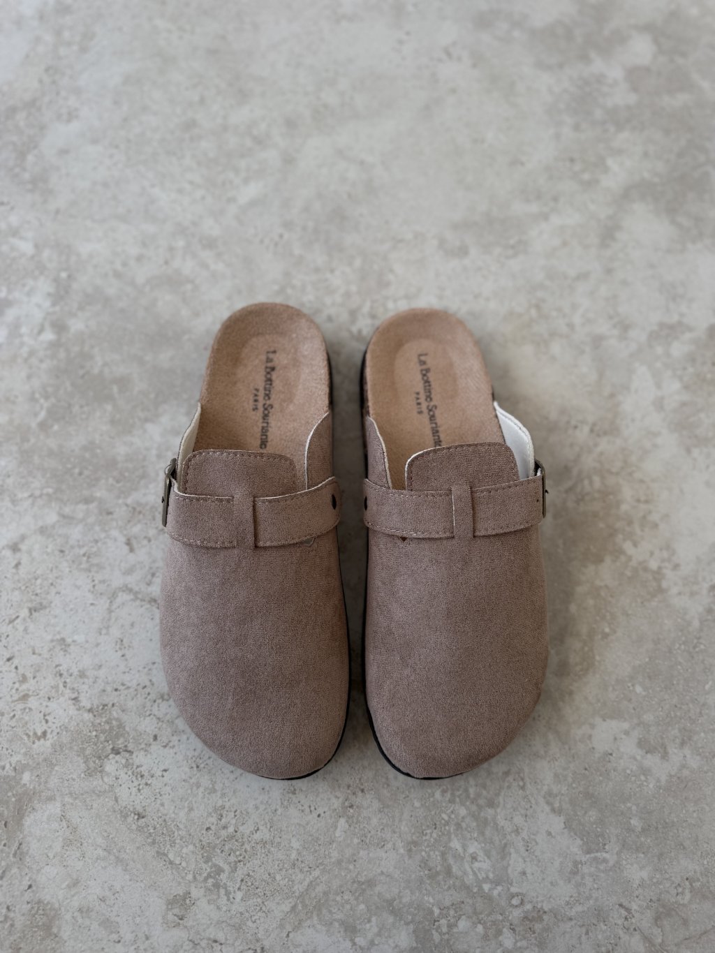 These mule-style slip-ons are a great everyday choice when you want comfort with a clean, timeless look. The closed toe gives them an elegant feel while keeping your foot more secure, and the soft footbed adds comfort for all-day wear. The buckle detail helps with a better fit and adds a stylish accent. The cork-style sole feels supportive and stable. We recommend choosing one size bigger than your usual size.