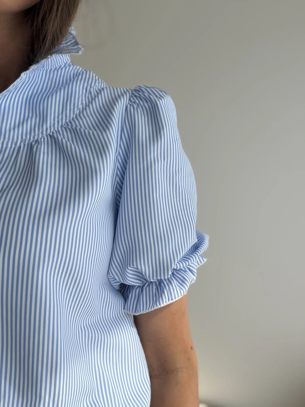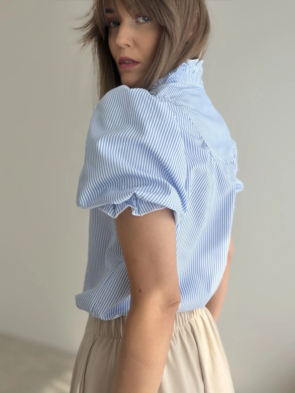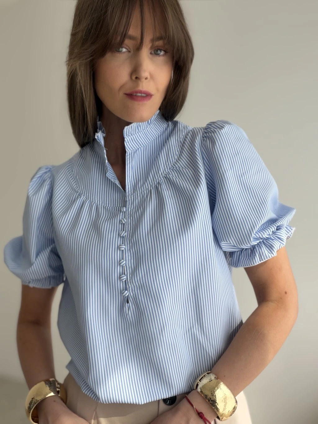 This elegant blouse with a soft romantic touch is a beautiful piece that feels feminine, polished, and effortlessly refined. It stands out with its subtle striped pattern, delicate front details, and more pronounced sleeves that add charm and a stylish character to the overall look. The fit feels light and airy, making the blouse comfortable to wear throughout the day while still maintaining an elegant appearance.