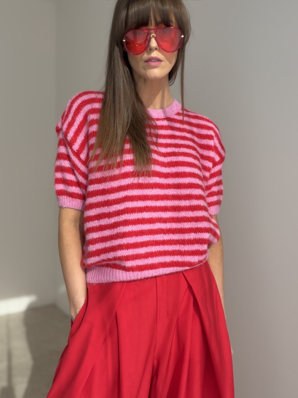 A striped knit pullover with short sleeves is a perfect piece for transitional weather and easy layering on cooler days. It feels soft and airy, giving a premium look at first glance. The relaxed fit sits comfortably on the body while keeping the outfit effortless and refined. Ribbed finishes at the neckline, sleeves, and hem help it hold its shape and create a polished silhouette. Style it with high-waisted trousers or a skirt—add accessories and you’re ready to go.