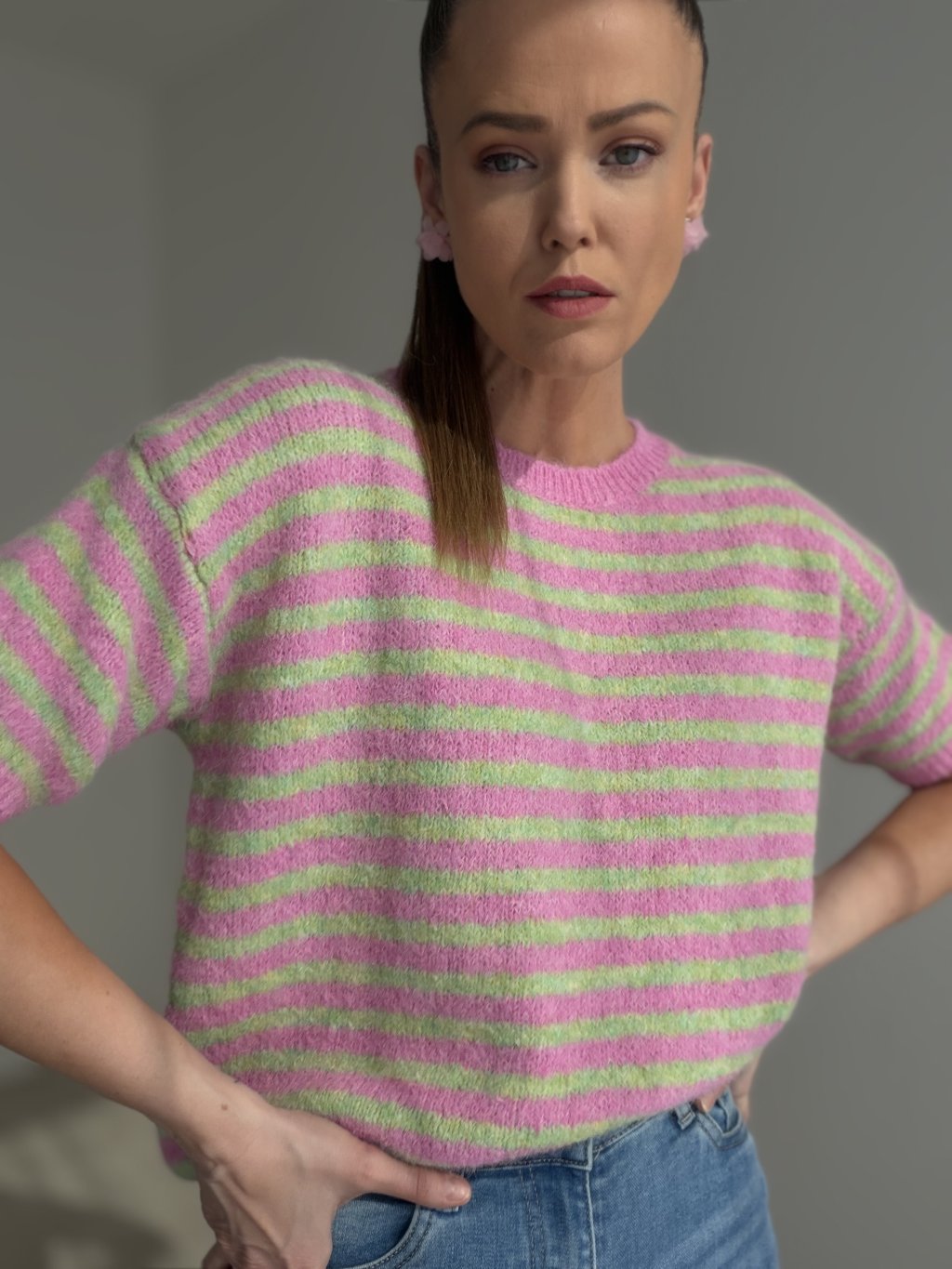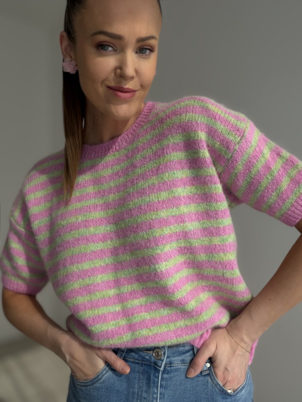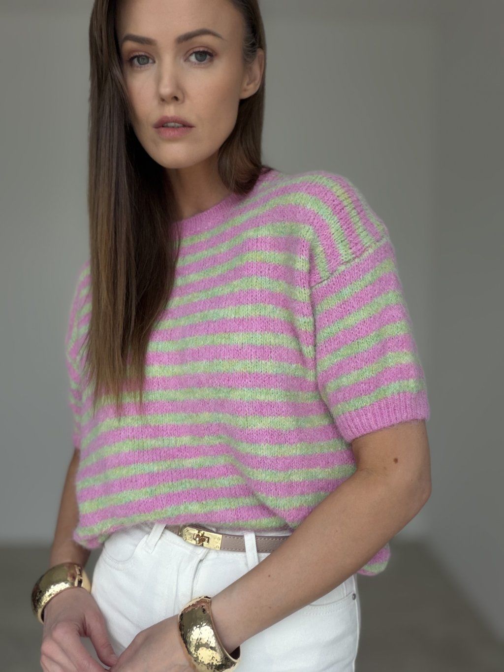 A striped knit pullover with short sleeves is a perfect piece for transitional weather and easy layering on cooler days. It feels soft and airy, giving a premium look at first glance. The relaxed fit sits comfortably on the body while keeping the outfit effortless and refined. Ribbed finishes at the neckline, sleeves, and hem help it hold its shape and create a polished silhouette. Style it with high-waisted trousers or a skirt—add accessories and you’re ready to go.