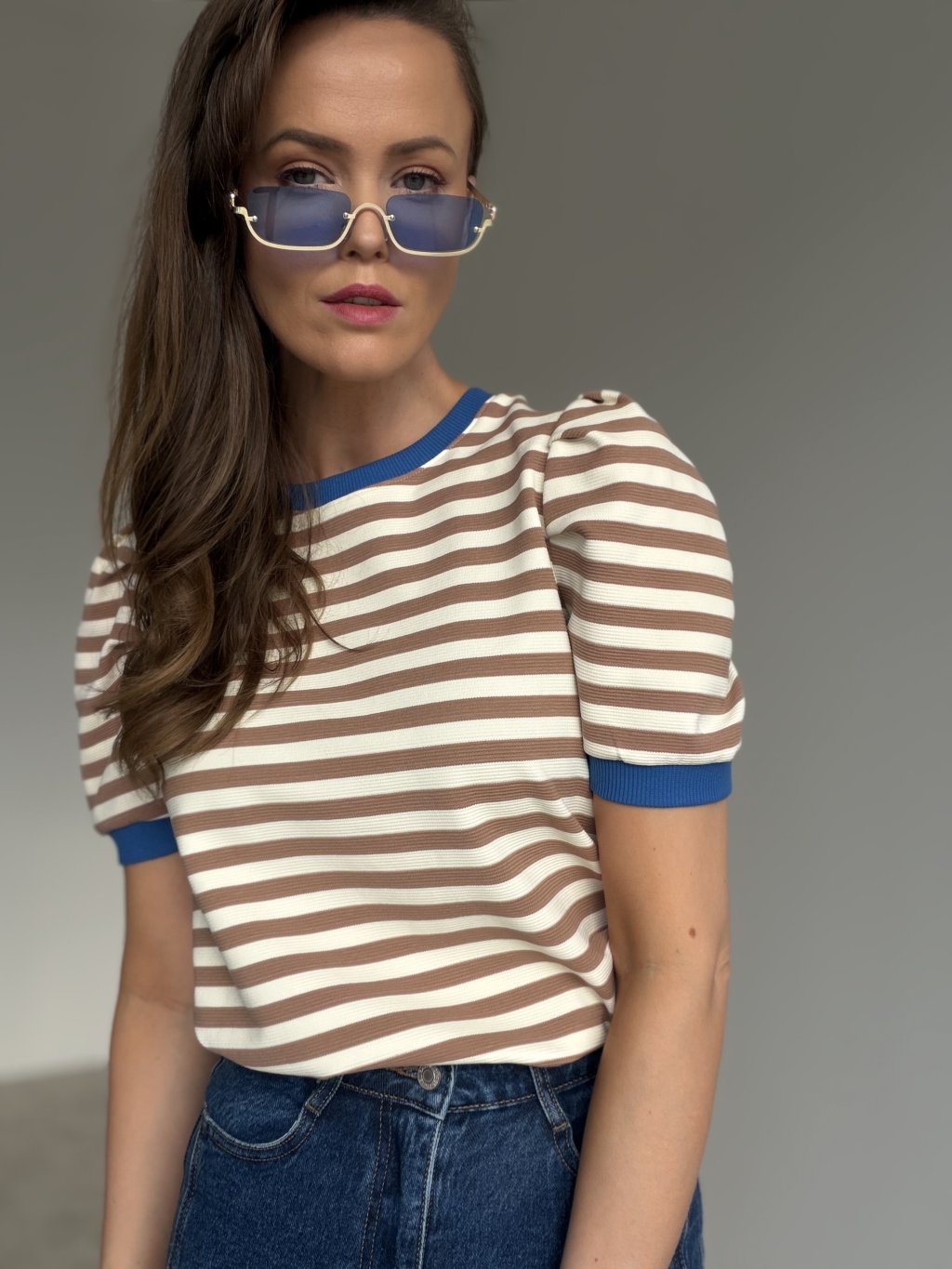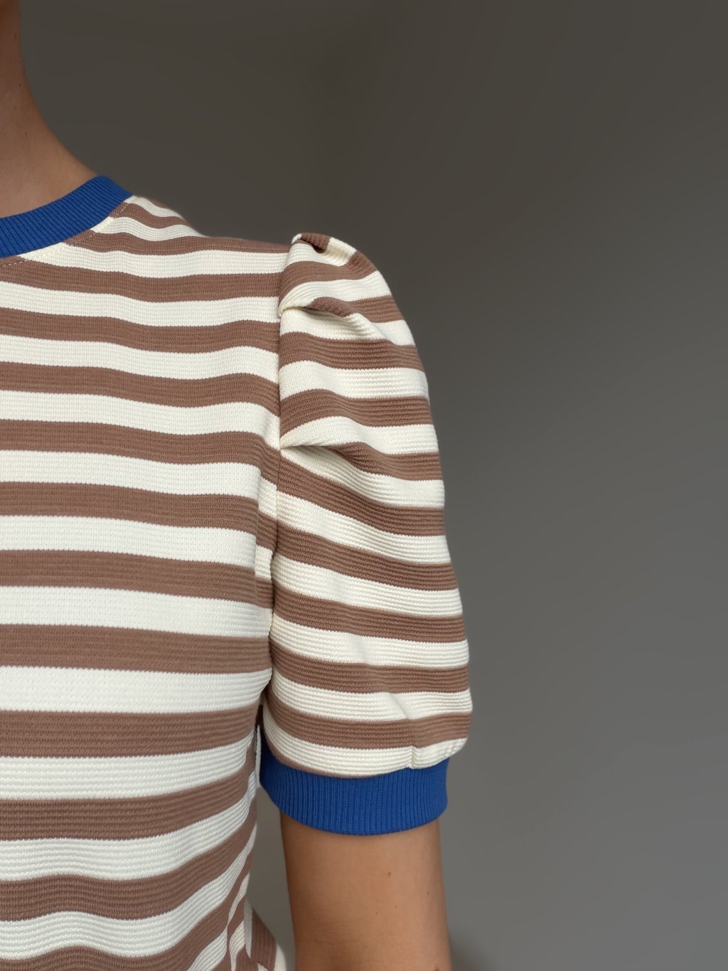 A striped top with a subtly textured finish that instantly looks polished while staying comfortable. It features a classic crew neckline with ribbed trim and short sleeves with gentle shoulder gathering, creating a flattering, feminine shape. Ribbed finishes help the top keep its structure and add a clean, elevated feel. The fit is easy to wear and styles effortlessly with jeans, high-waisted trousers, or a skirt, making it a reliable everyday piece for both casual and city looks.