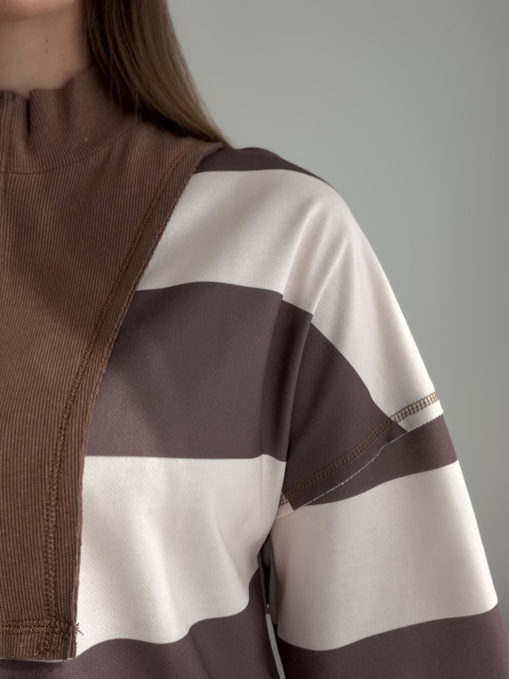 A striped tunic with a relaxed fit, shorter sleeves, and a standout neckline detail. A comfortable and stylish everyday piece.