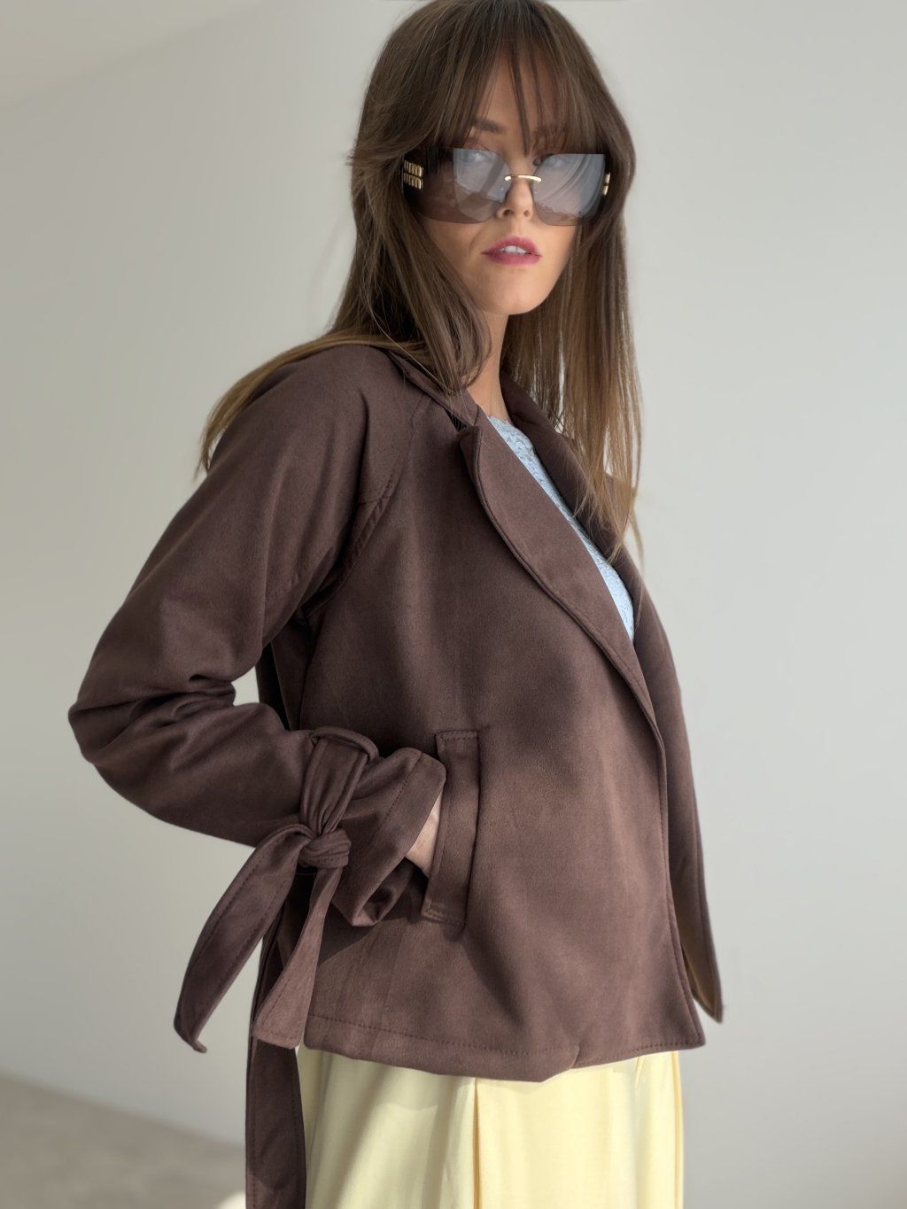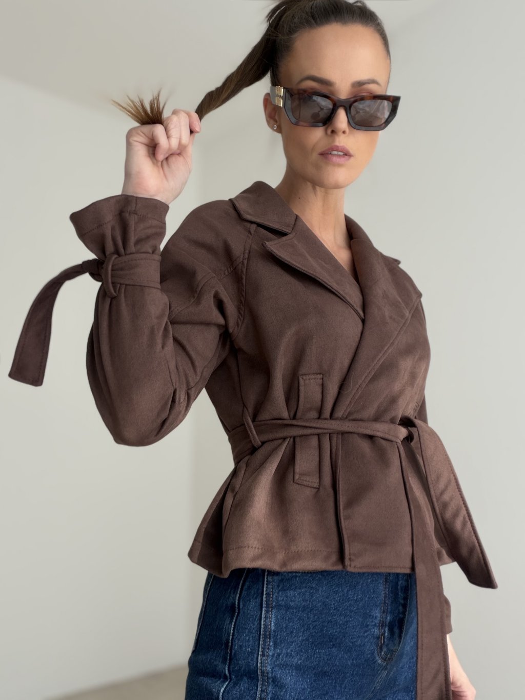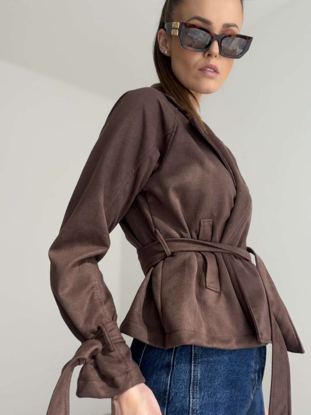A suede blazer with a waist tie that brings elegance and effortless style to both everyday and feminine outfits. It is not lined, making it light, soft and comfortable to wear.