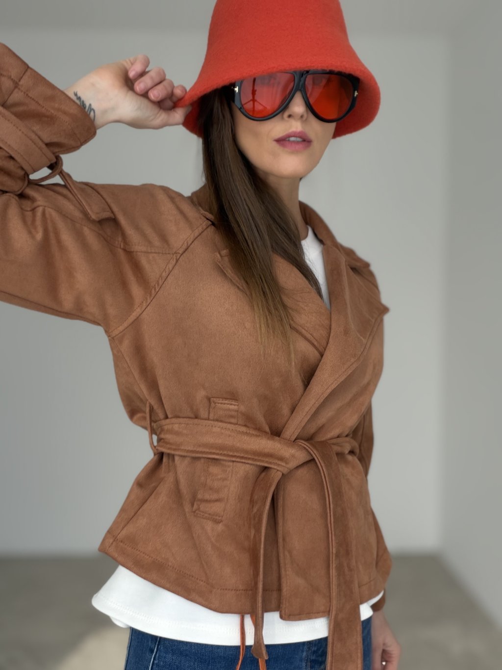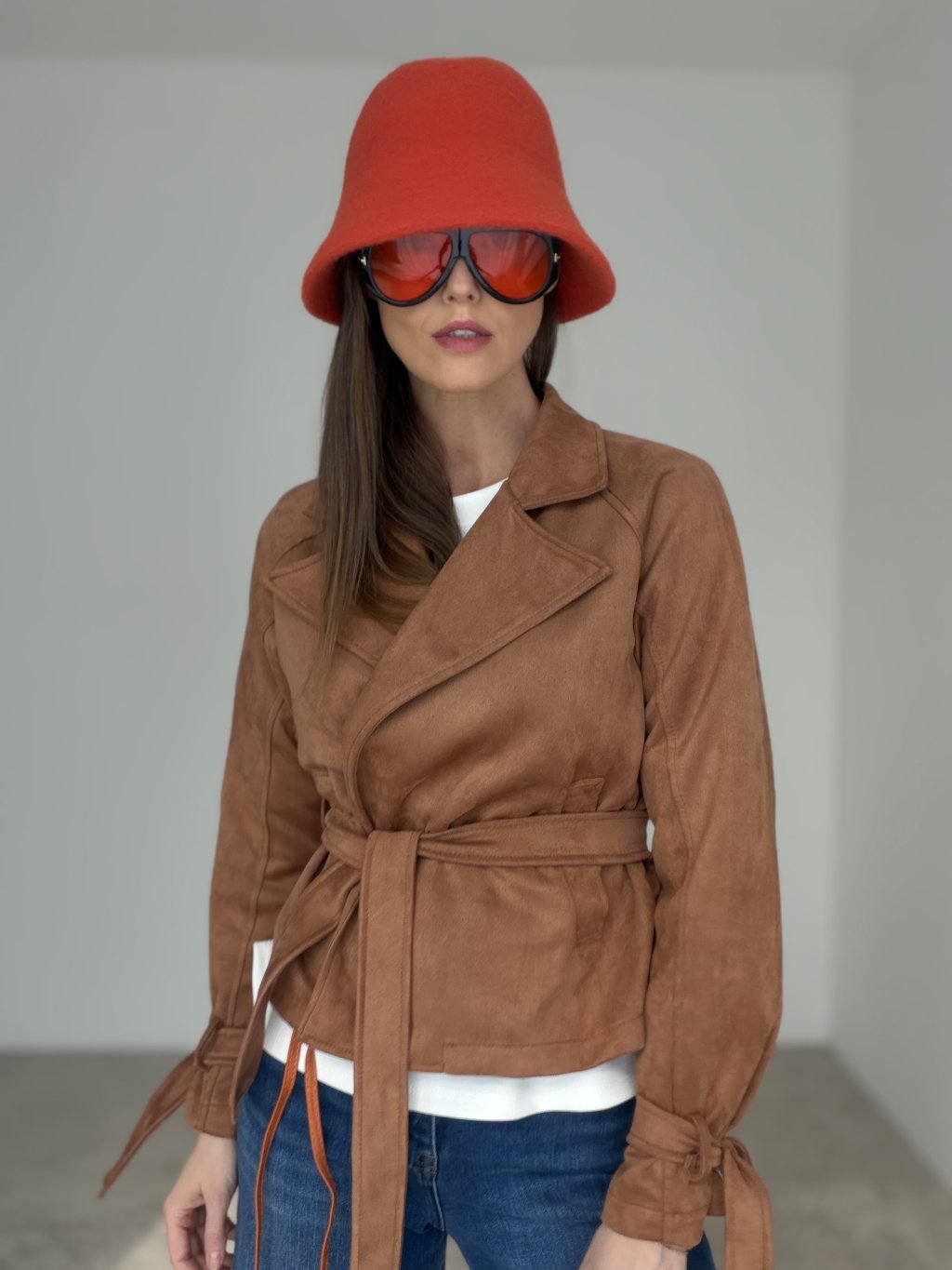 A suede blazer with a waist tie that brings elegance and effortless style to both everyday and feminine outfits. It is not lined, making it light, soft and comfortable to wear.