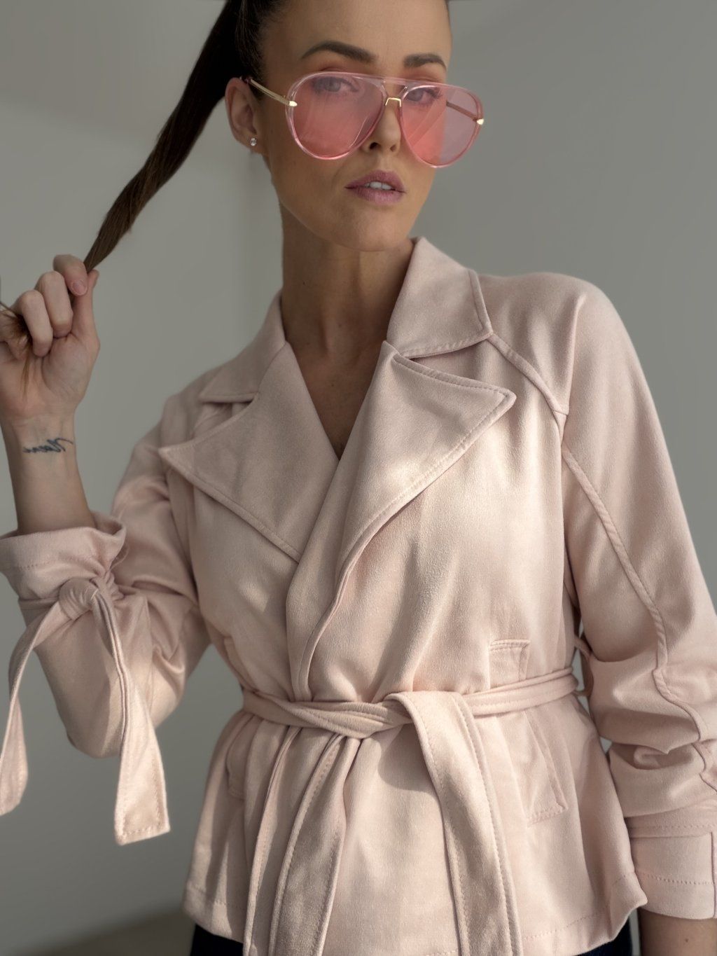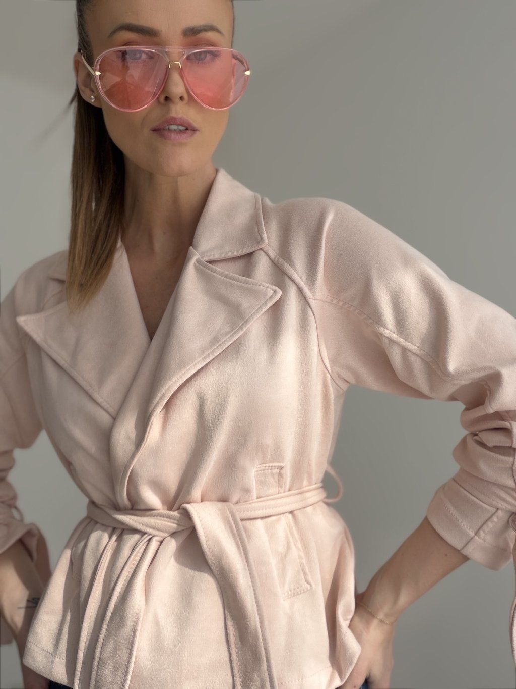 A suede blazer with a waist tie that brings elegance and effortless style to both everyday and feminine outfits. It is not lined, making it light, soft and comfortable to wear.