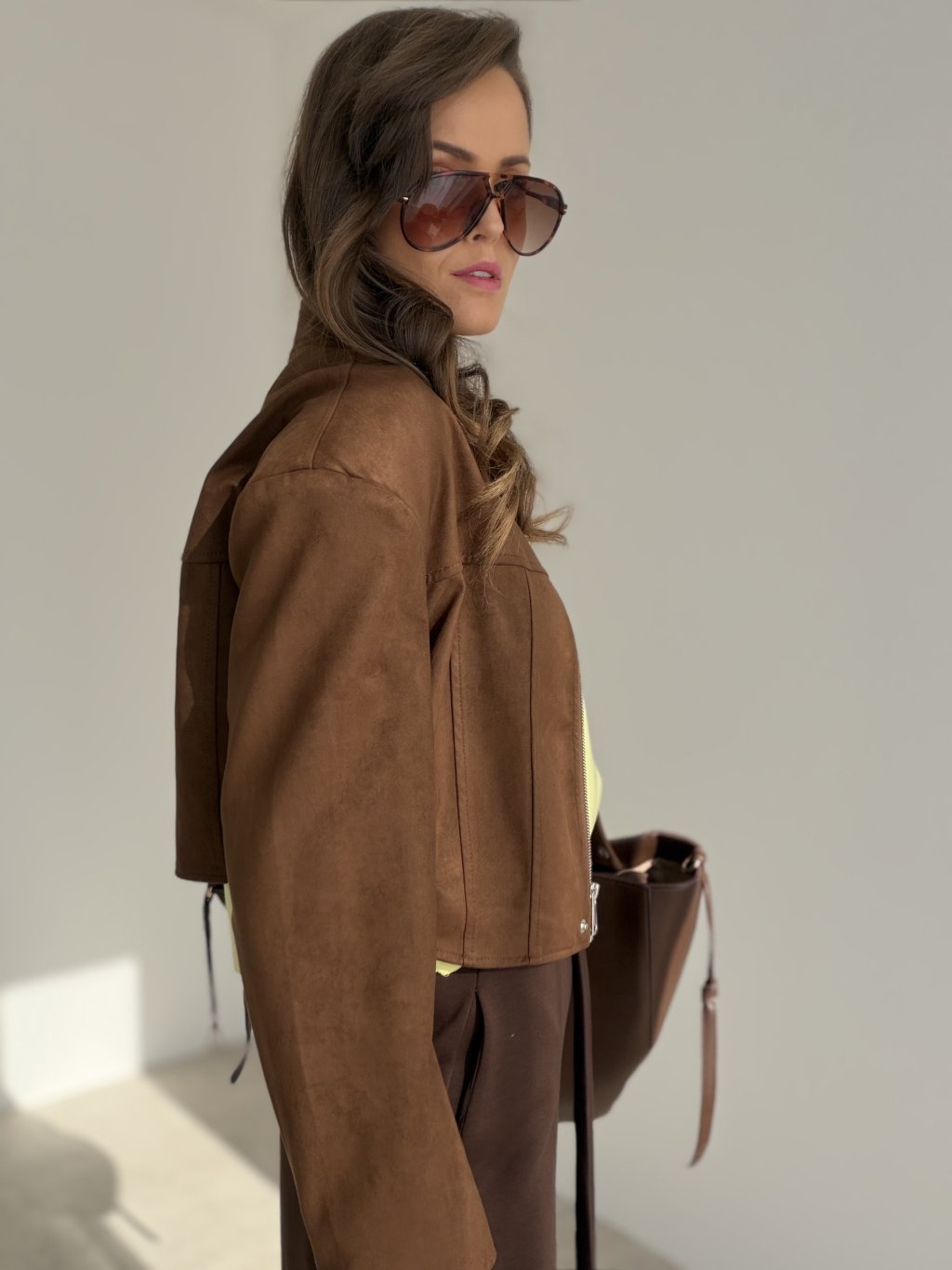 Cropped, structured jacket with a soft velvety finish, minimal stand collar, clean lines and subtle metal details, perfect with high-waisted pieces.
