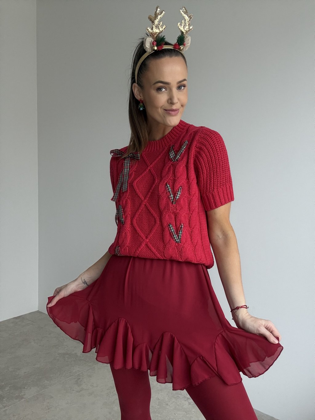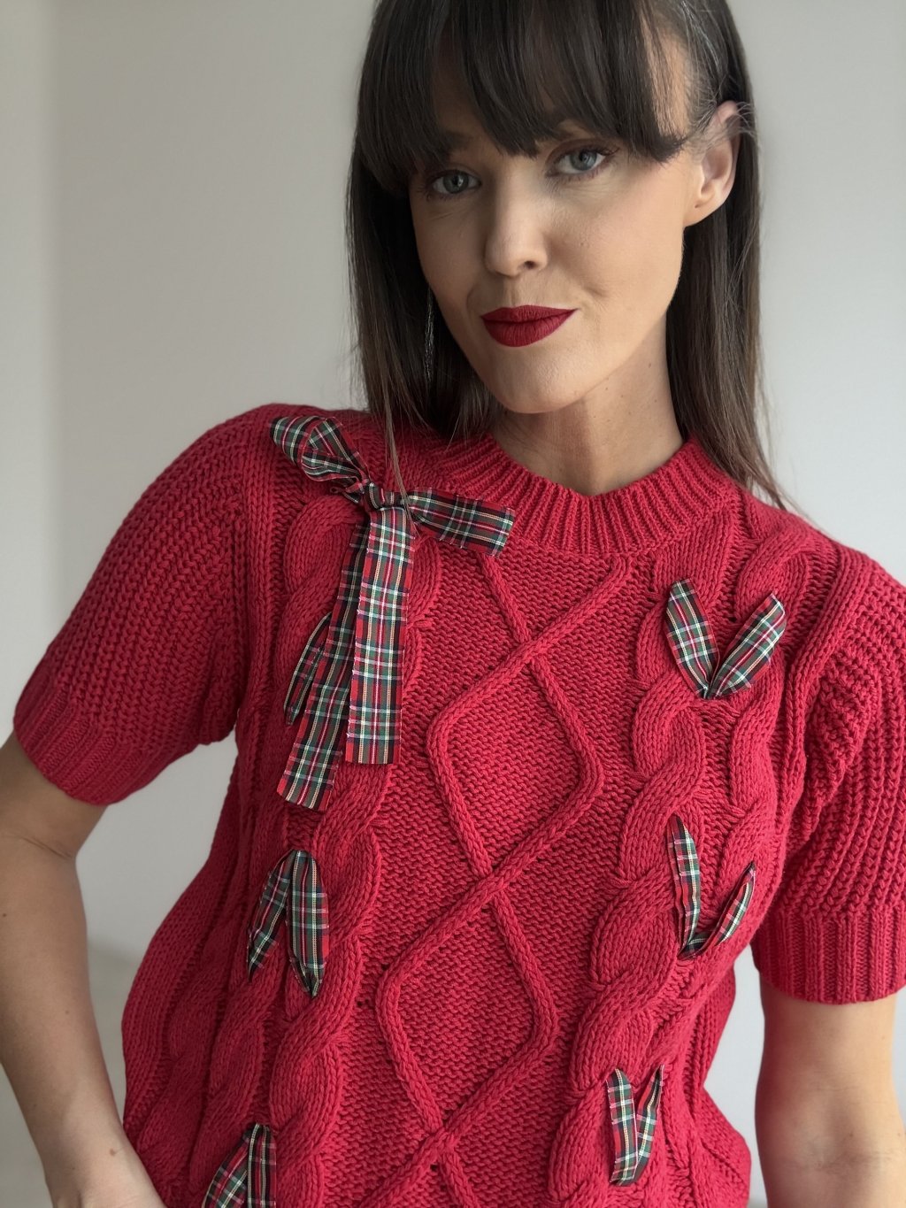 An original knitted sweater with short sleeves that combines playful detailing with an elegant look. The front features a chunky cable pattern decorated with several bows made from checked ribbon, creating a “gift-wrapped” effect and adding a festive touch to any outfit. The soft knit feels pleasant on the skin, doesn’t itch and comfortably follows the shape of the body. Ribbed edges at the neckline, hem and sleeves help the sweater keep its shape and gently define the silhouette. It’s a statement piece that looks great in photos yet remains comfortable enough for all-day wear.