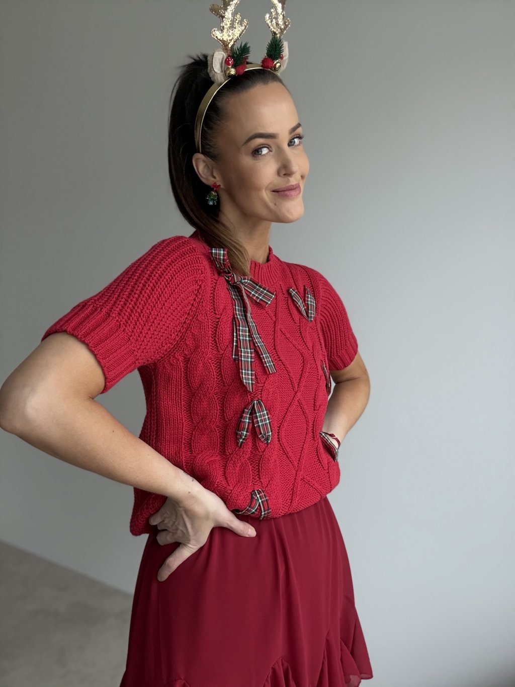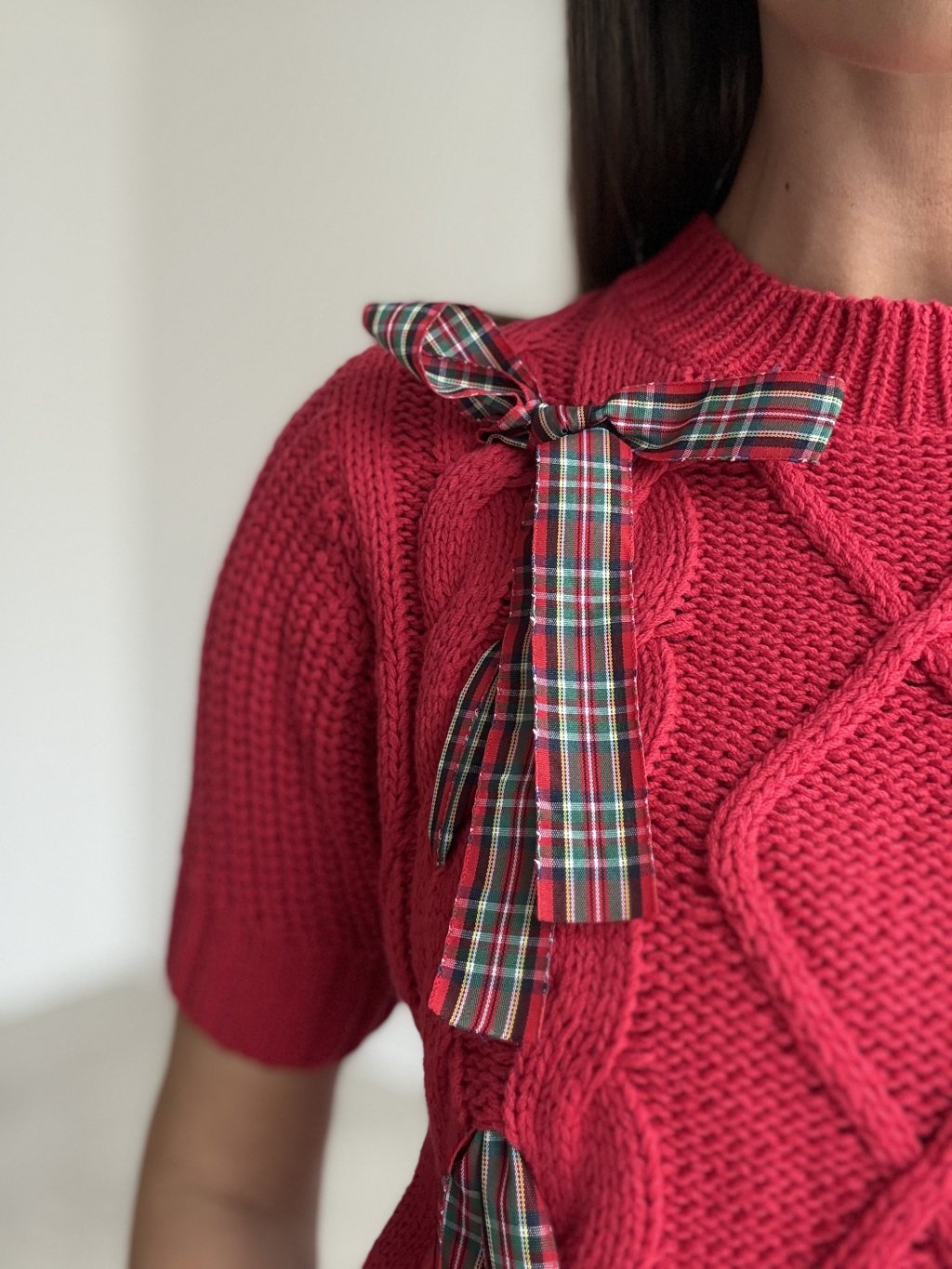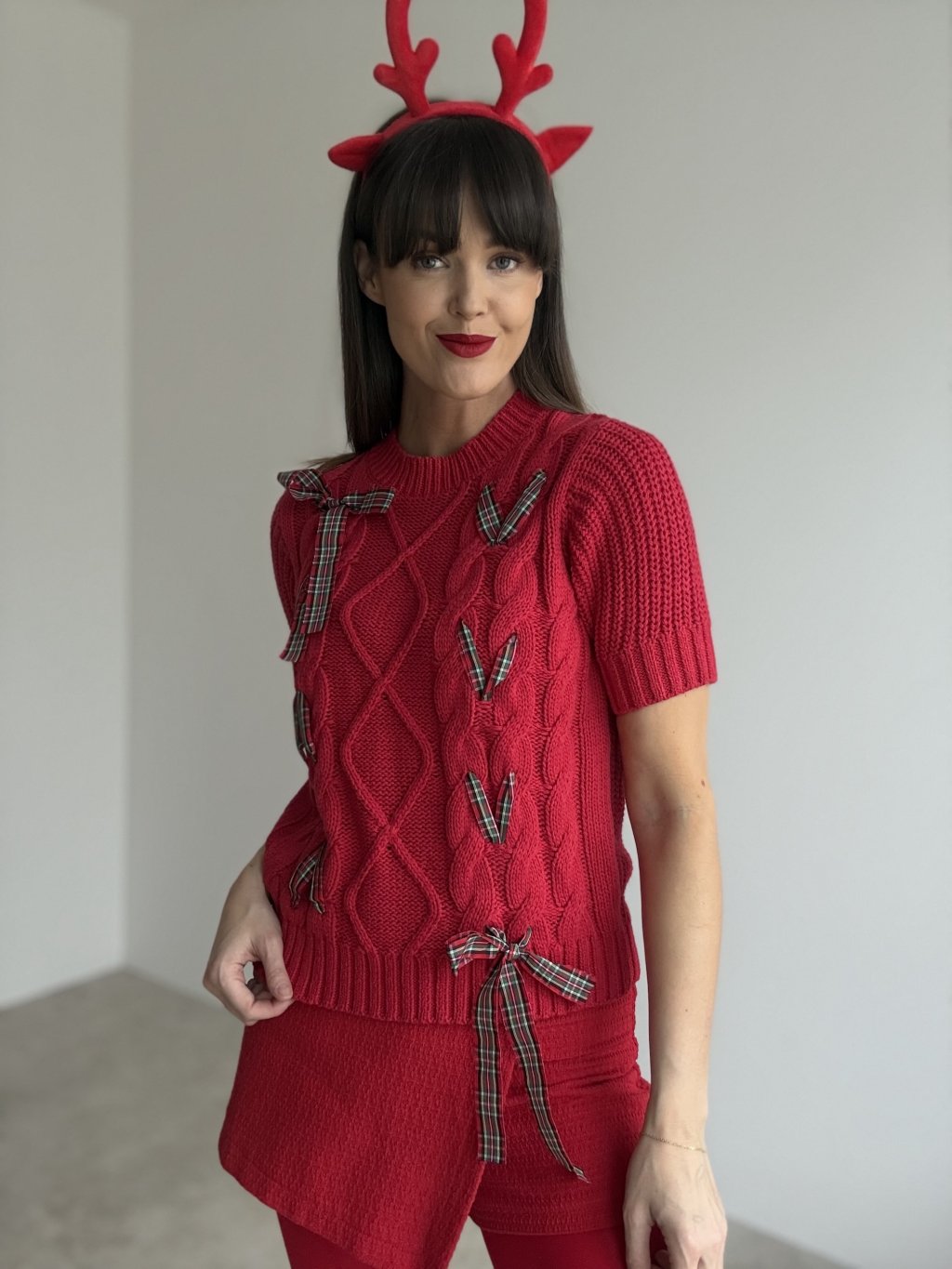 Knitted short-sleeve sweater with a cable pattern and decorative checked bows on the front, adding a playful yet elegant festive touch to any outfit.