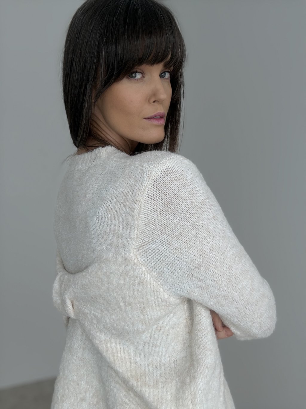 A softly textured knit sweater with a cosy feel and an elegant finish. Designed in a comfortable silhouette with a classic crew neckline and long sleeves, it’s easy to style for everyday wear or a polished smart-casual look. The standout feature is the bow detail on the back, adding a feminine twist and making the piece look special with minimal effort—perfect with sleek trousers or a simple skirt. The fabric feels pleasant to wear and works well for layering under outerwear during transitional days.