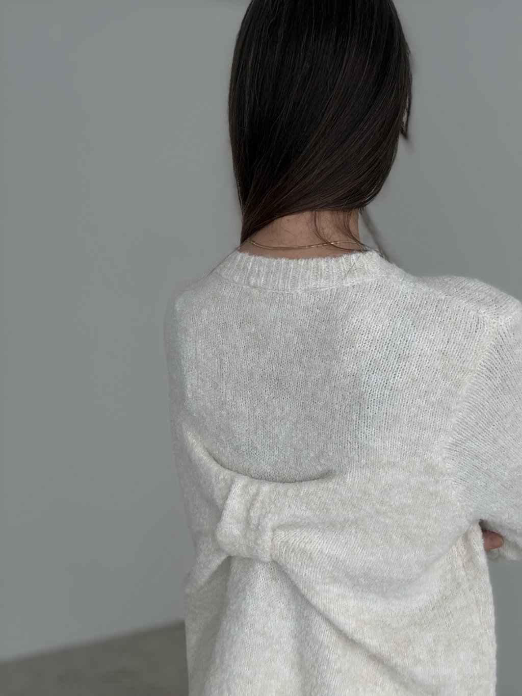 A comfortable knit sweater with a crew neck and long sleeves, finished with a statement bow on the back. Easy to style for everyday and smart-casual outfits.