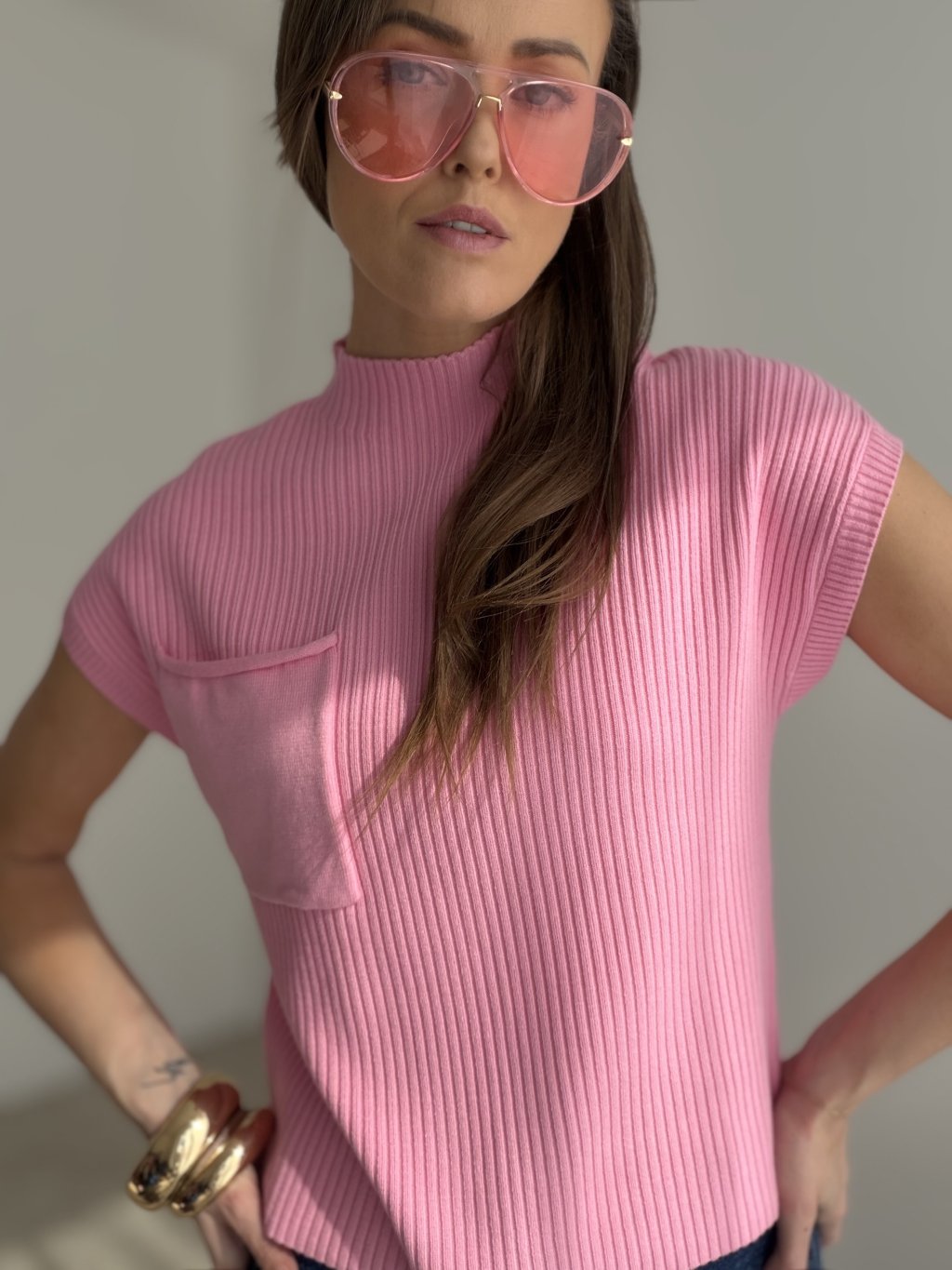This soft ribbed sweater is an elegant yet versatile piece that fits beautifully into both everyday and polished wardrobes. It stands out with its clean lines, closer fit and higher neckline, which give it a modern and sophisticated look. The short sleeves add a fresh and feminine touch, while the subtle front pocket creates an interesting detail that elevates the overall design.