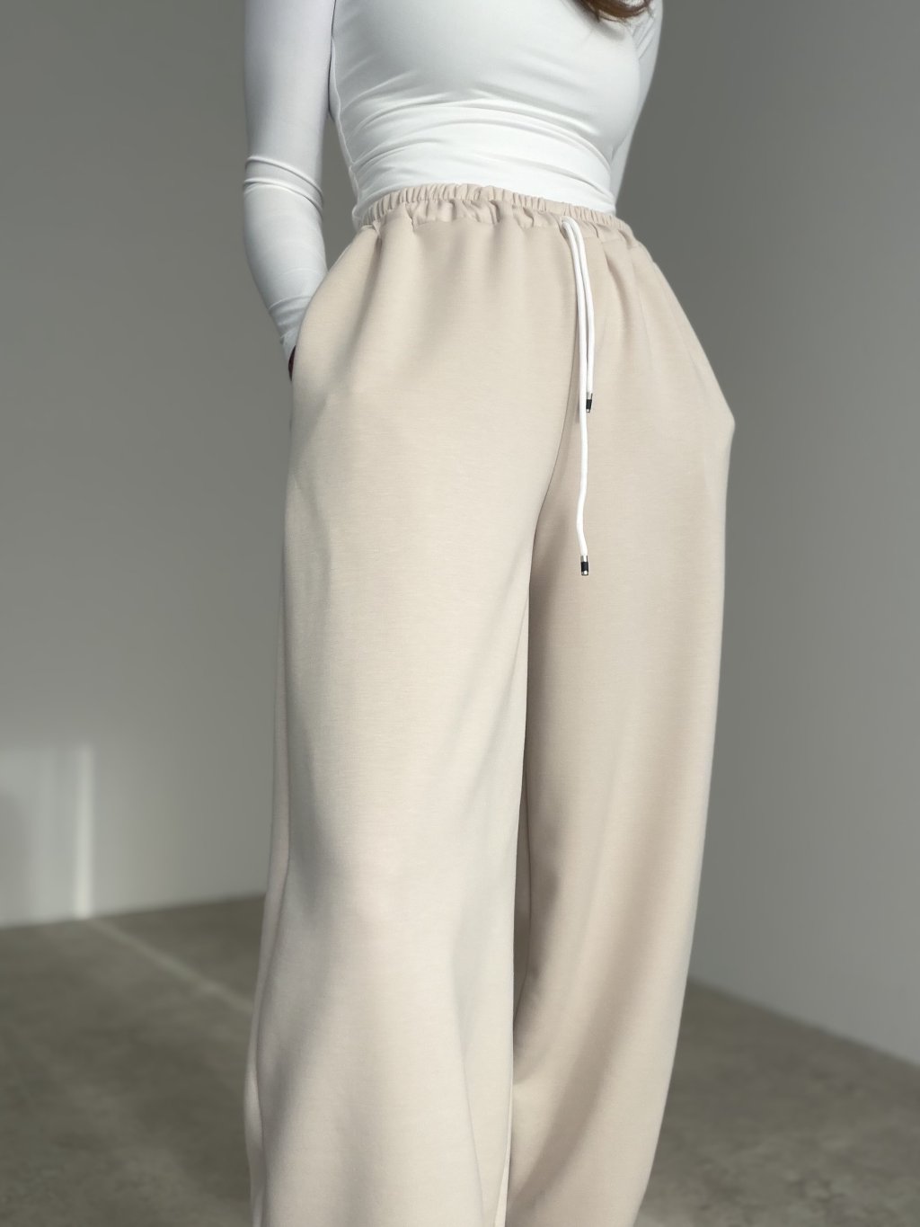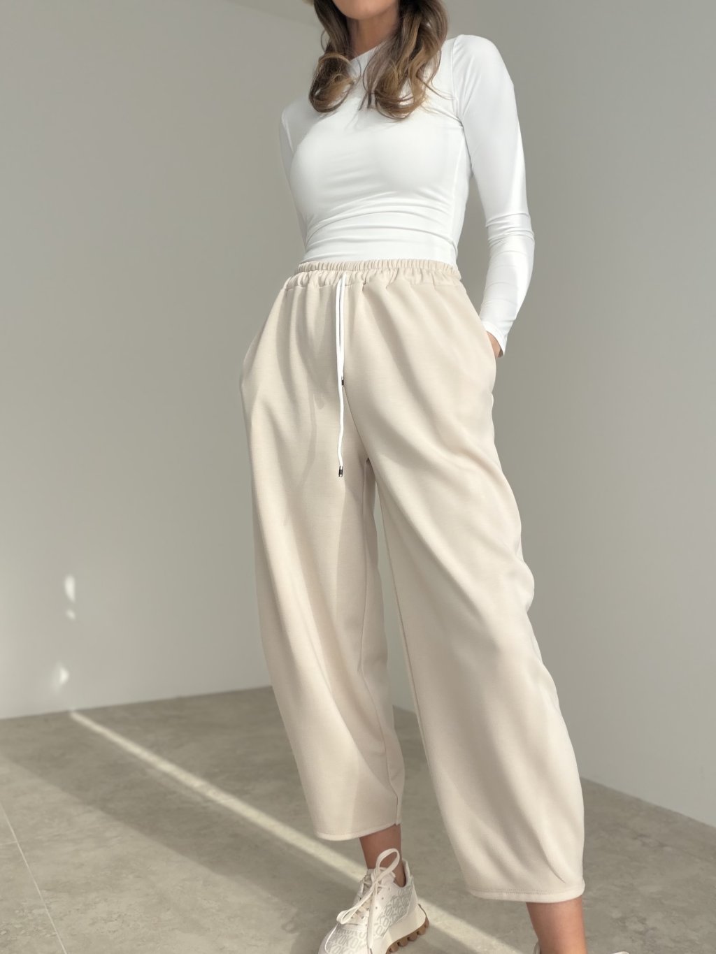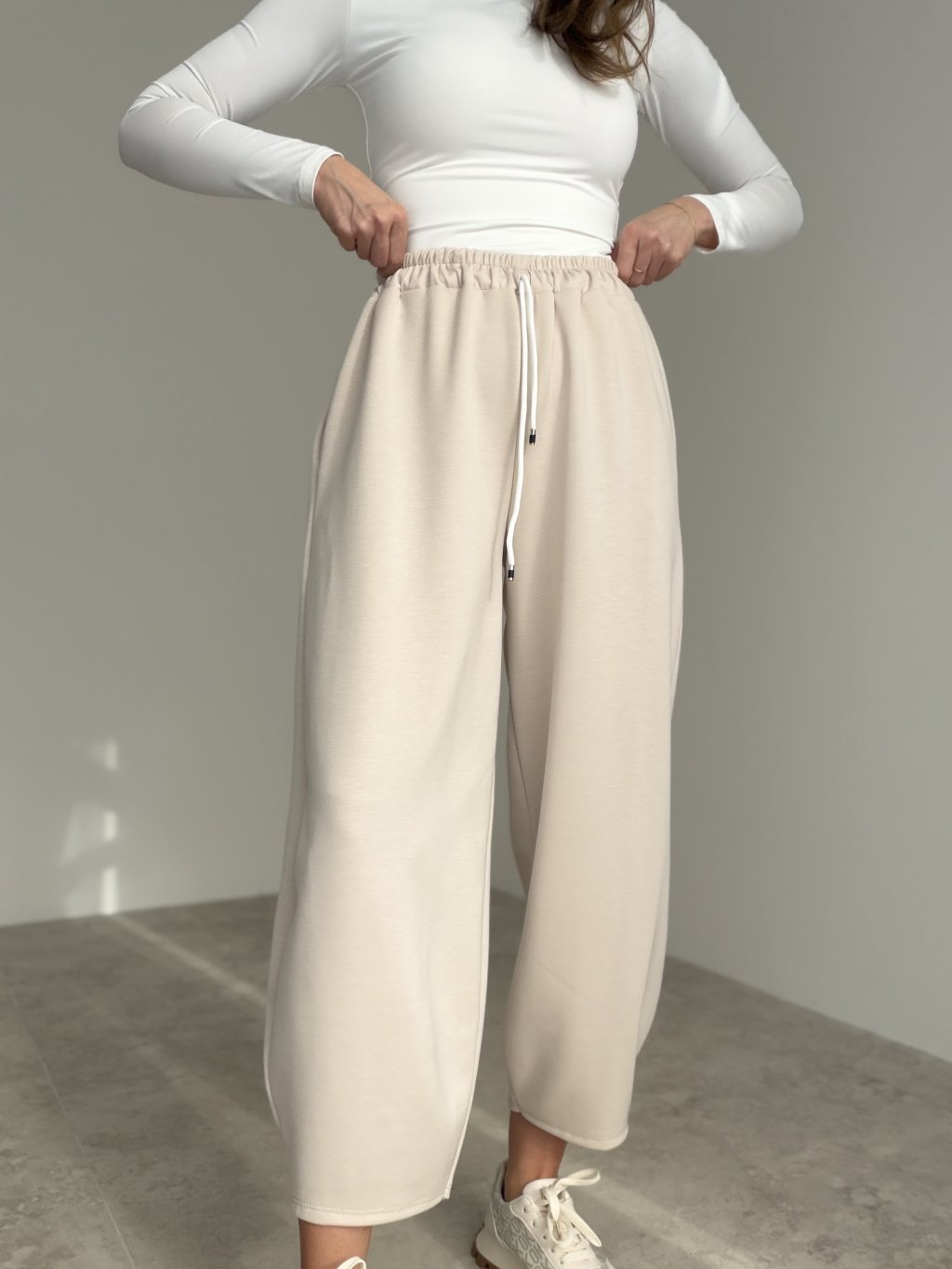 These sweatpants are designed for all-day comfort with a modern, clean finish. They feature a higher elastic waistband with a drawstring, making them easy to adjust and comfortable to wear throughout the day. The relaxed, softly rounded leg shape creates an effortless silhouette that feels contemporary without extra fuss. The fabric is soft and fluid, making them ideal for home, travel, or casual city styling. Pair them with a fitted top, a hoodie, or even a blazer when you want a balanced look that feels relaxed yet put-together.