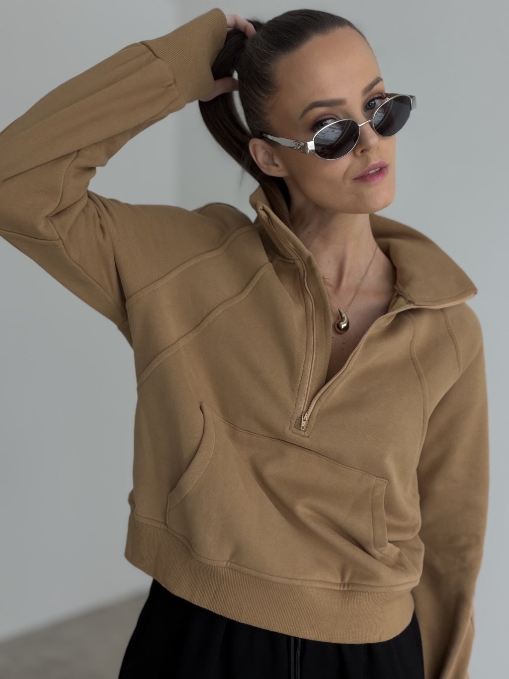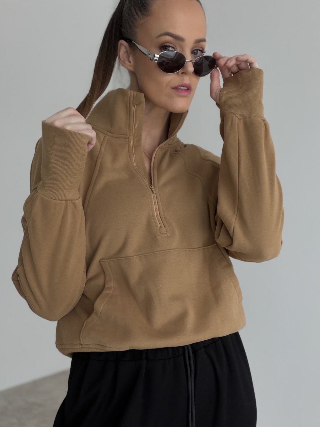This half-zip sweatshirt is a perfect choice when you want comfort with a polished, city-ready feel. It features a structured stand collar that holds its shape beautifully and can be worn fully zipped or slightly open for a more relaxed look. The easy, relaxed fit feels comfortable all day while still looking clean and modern. A front kangaroo pocket adds a practical detail, and ribbed cuffs and hem help the sweatshirt sit nicely and stay in place. It pairs effortlessly with sweatpants, denim, or tailored trousers when you want a refined contrast between casual and sophisticated styling.