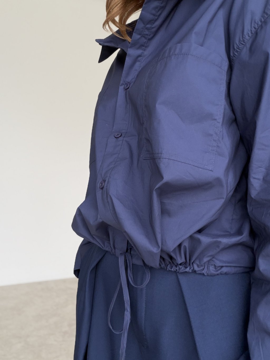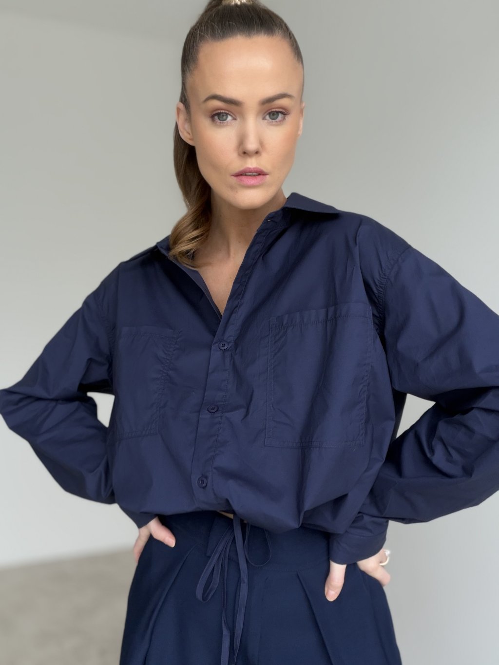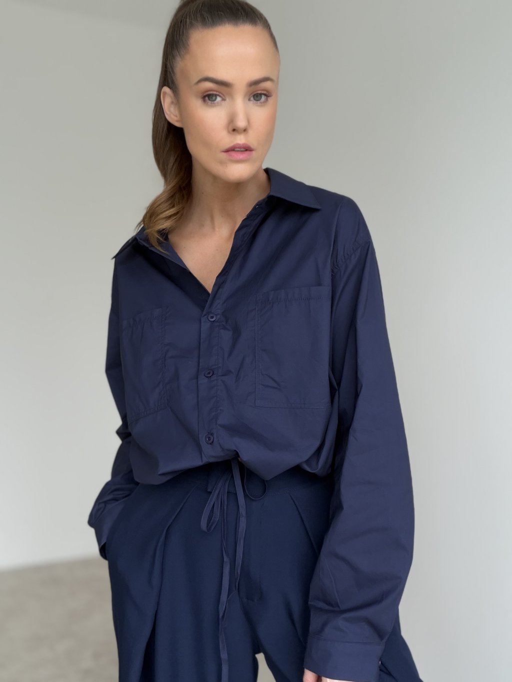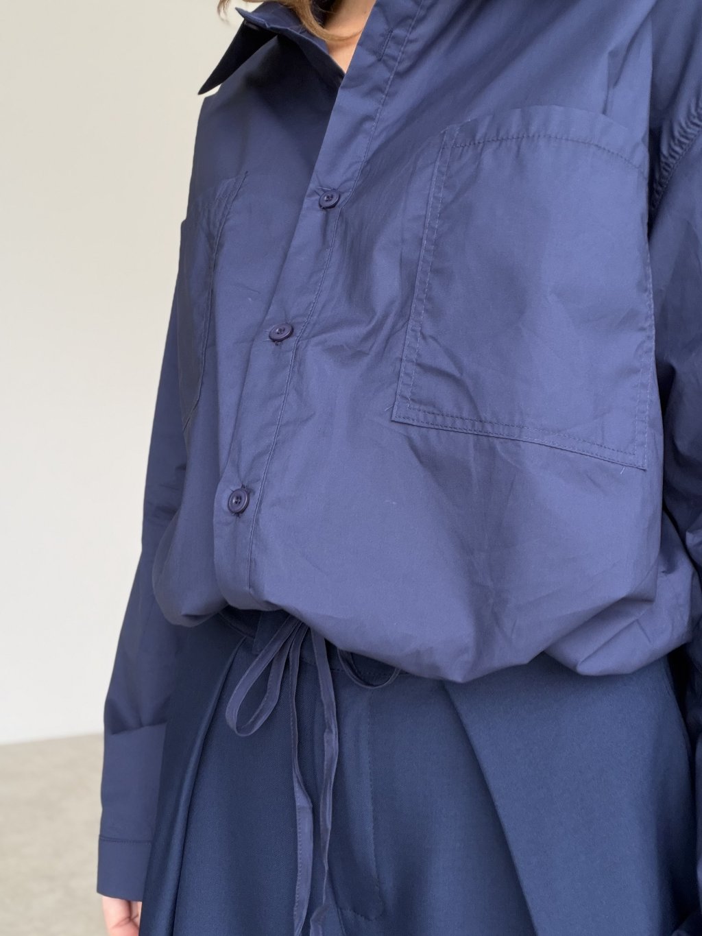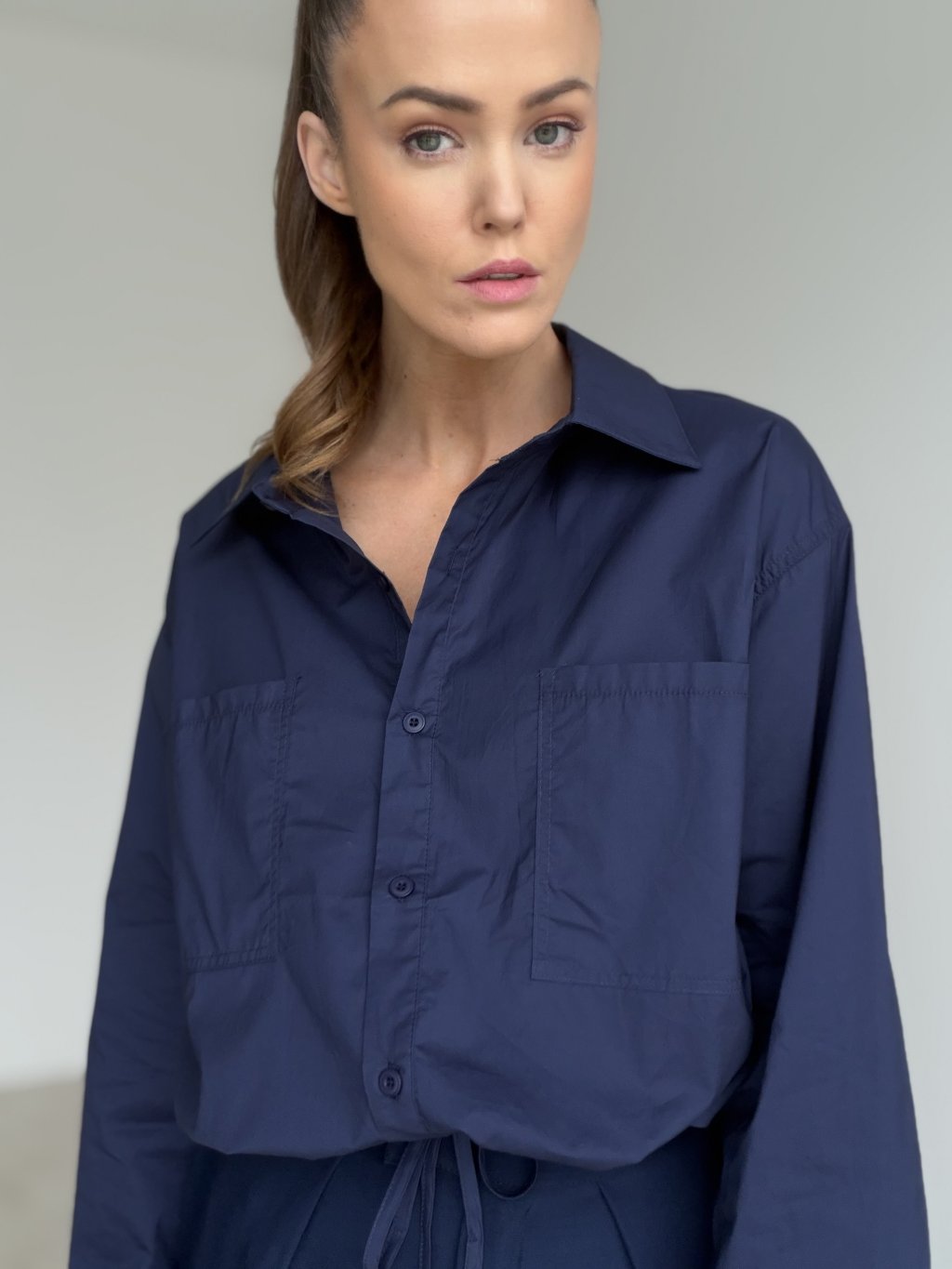 This relaxed yet chic cotton shirt features a waist tie detail that allows you to adjust the fit to your shape. The double chest pockets and gently gathered sleeves add a touch of effortless elegance. A perfect choice for everyday wear – whether for a city stroll, casual day out, or laid-back outfit styling.