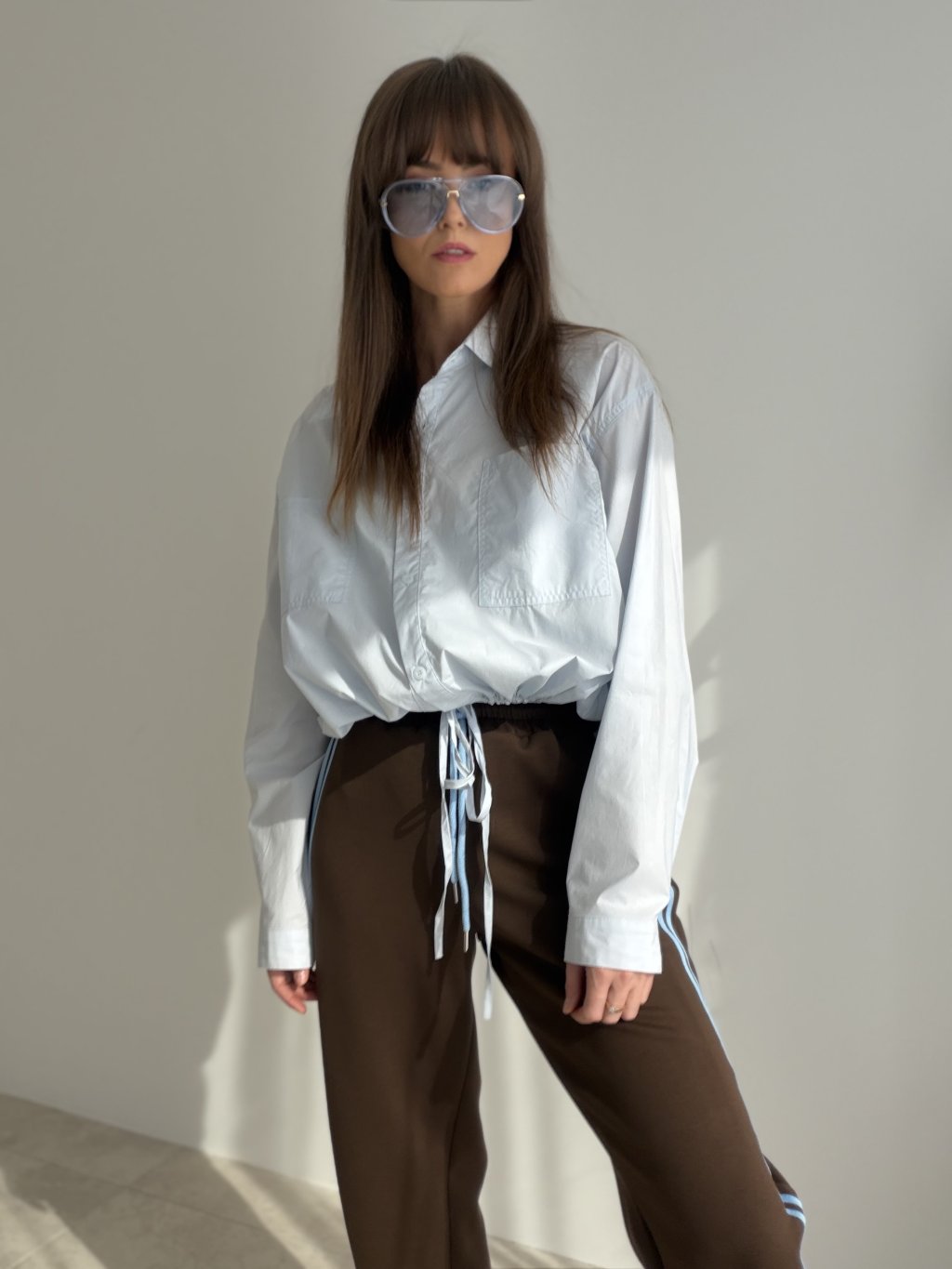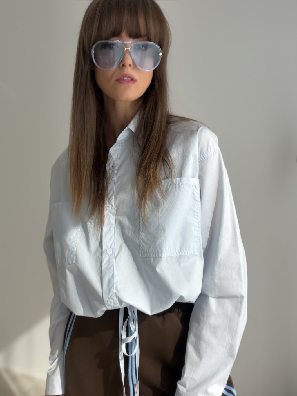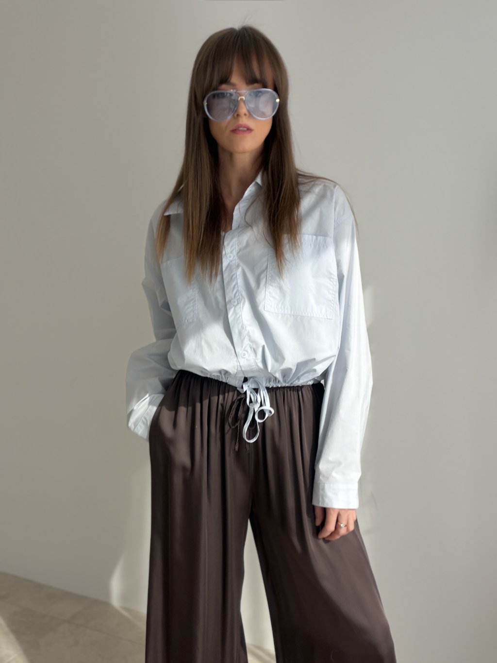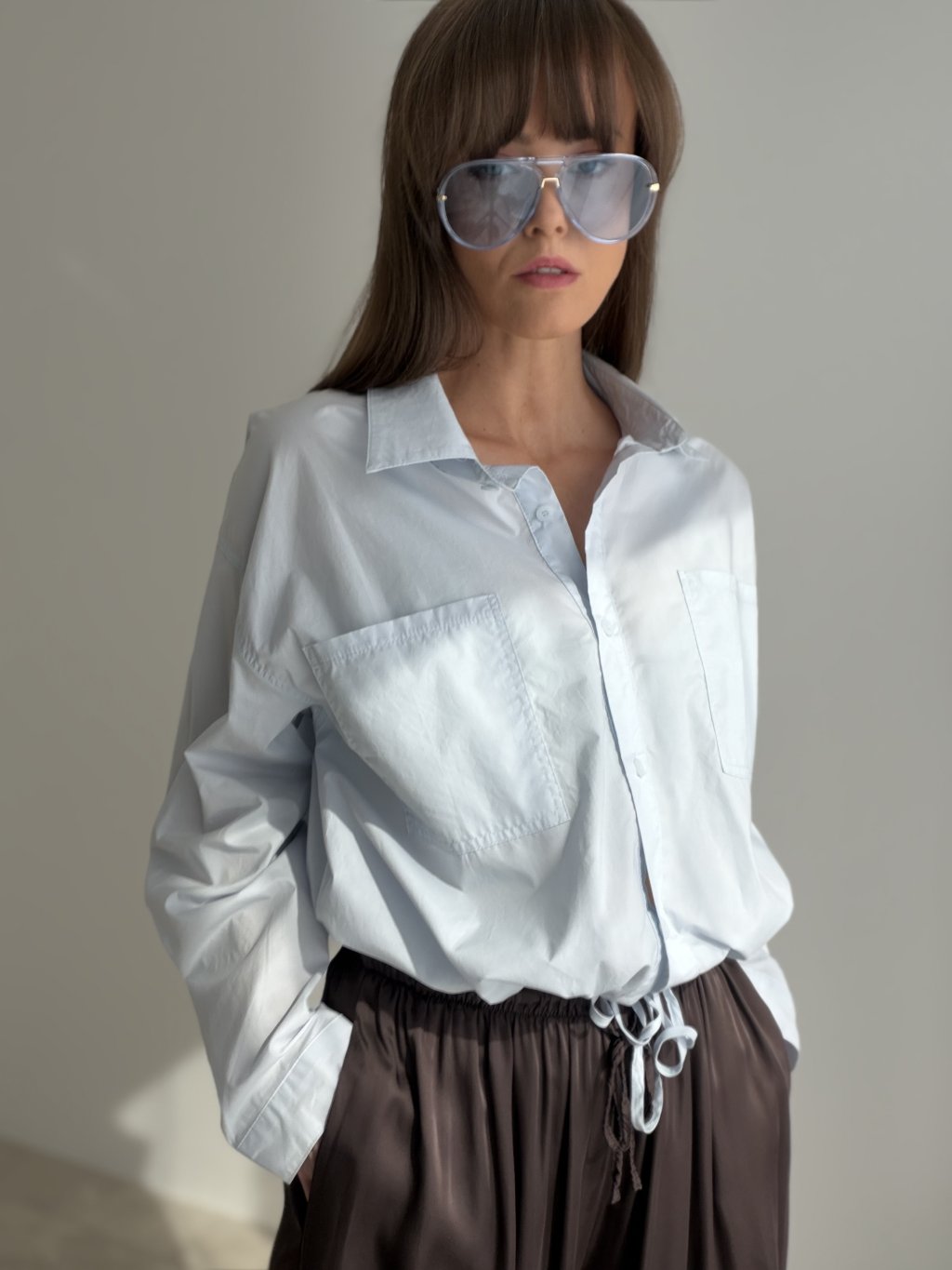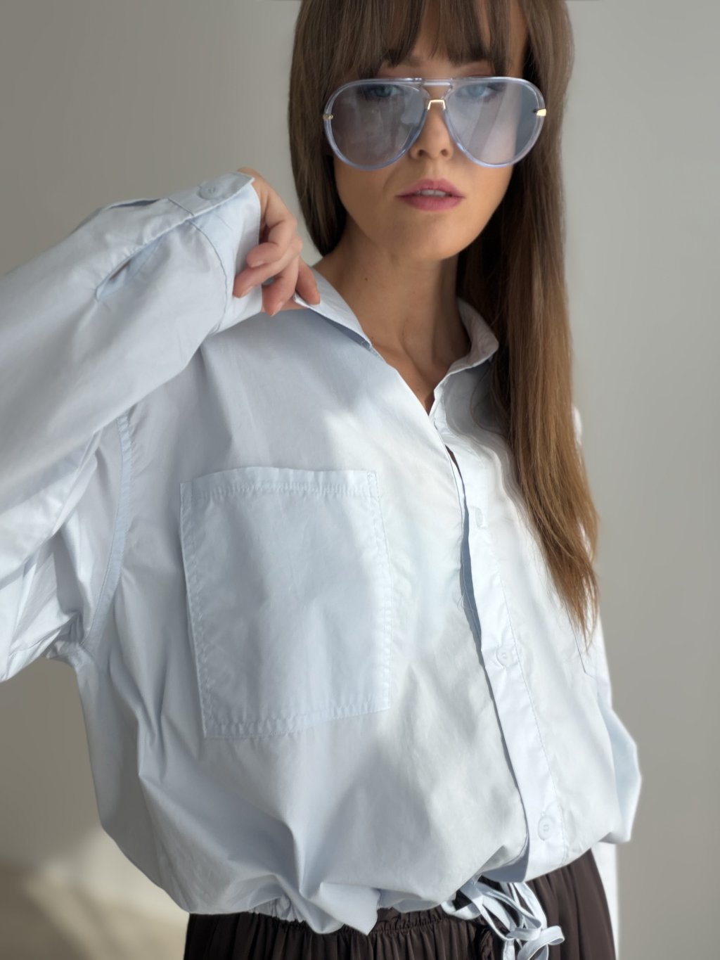 This relaxed yet chic cotton shirt features a waist tie detail that allows you to adjust the fit to your shape. The double chest pockets and gently gathered sleeves add a touch of effortless elegance. A perfect choice for everyday wear – whether for a city stroll, casual day out, or laid-back outfit styling.