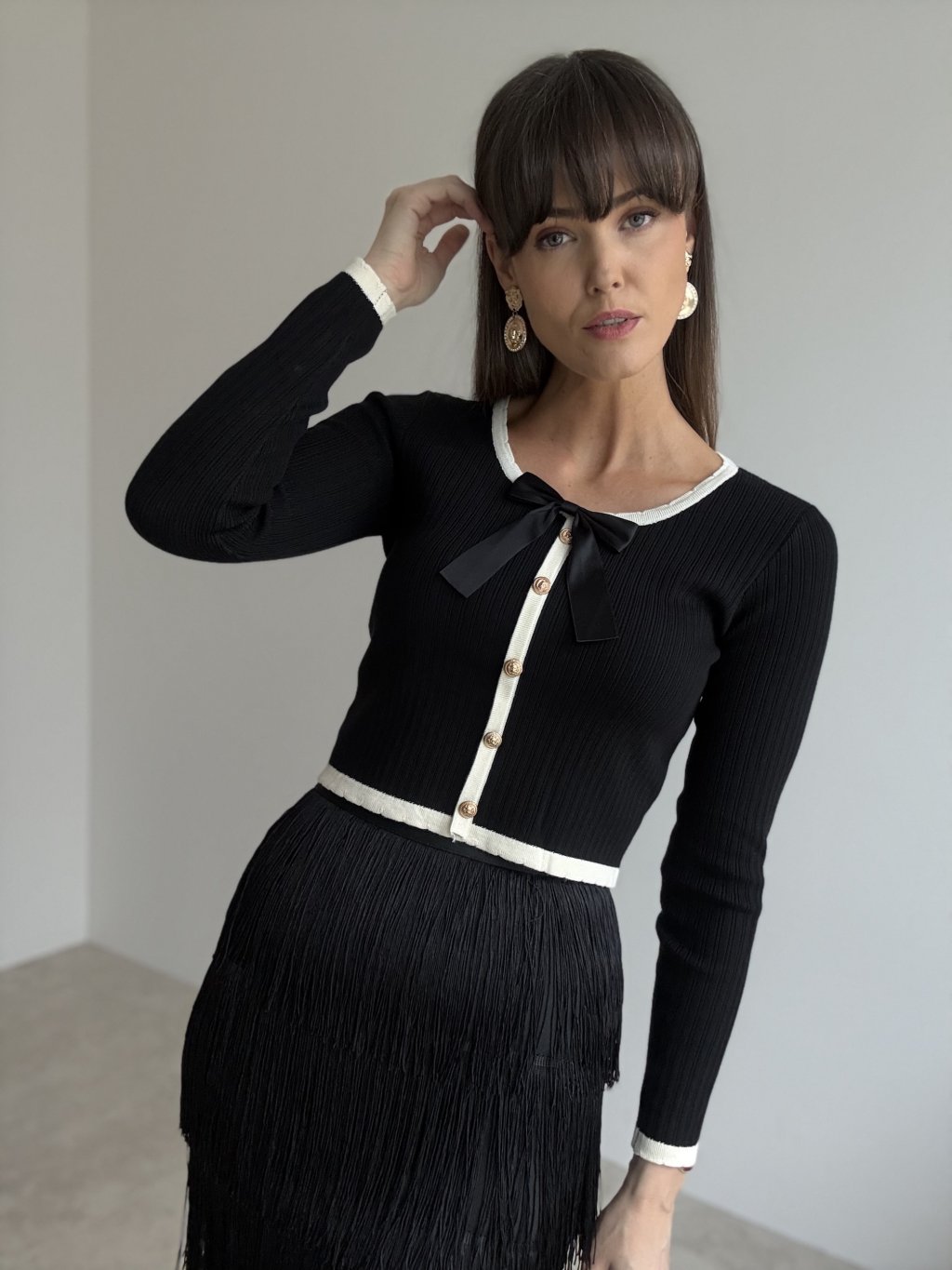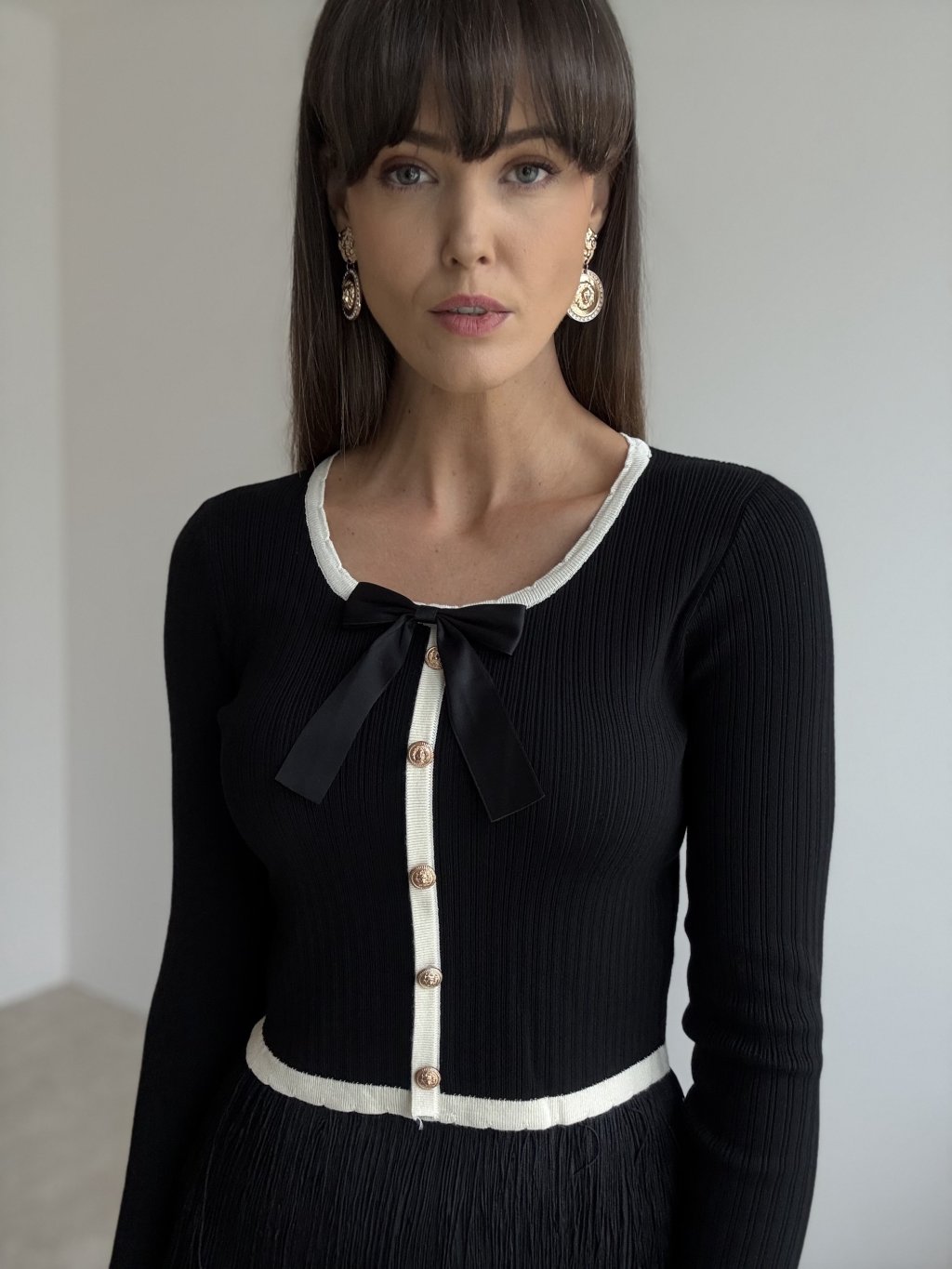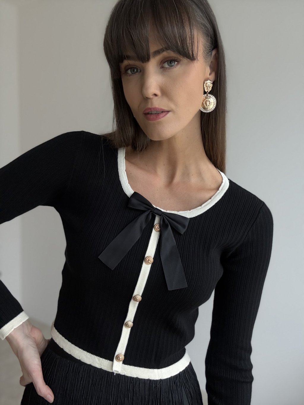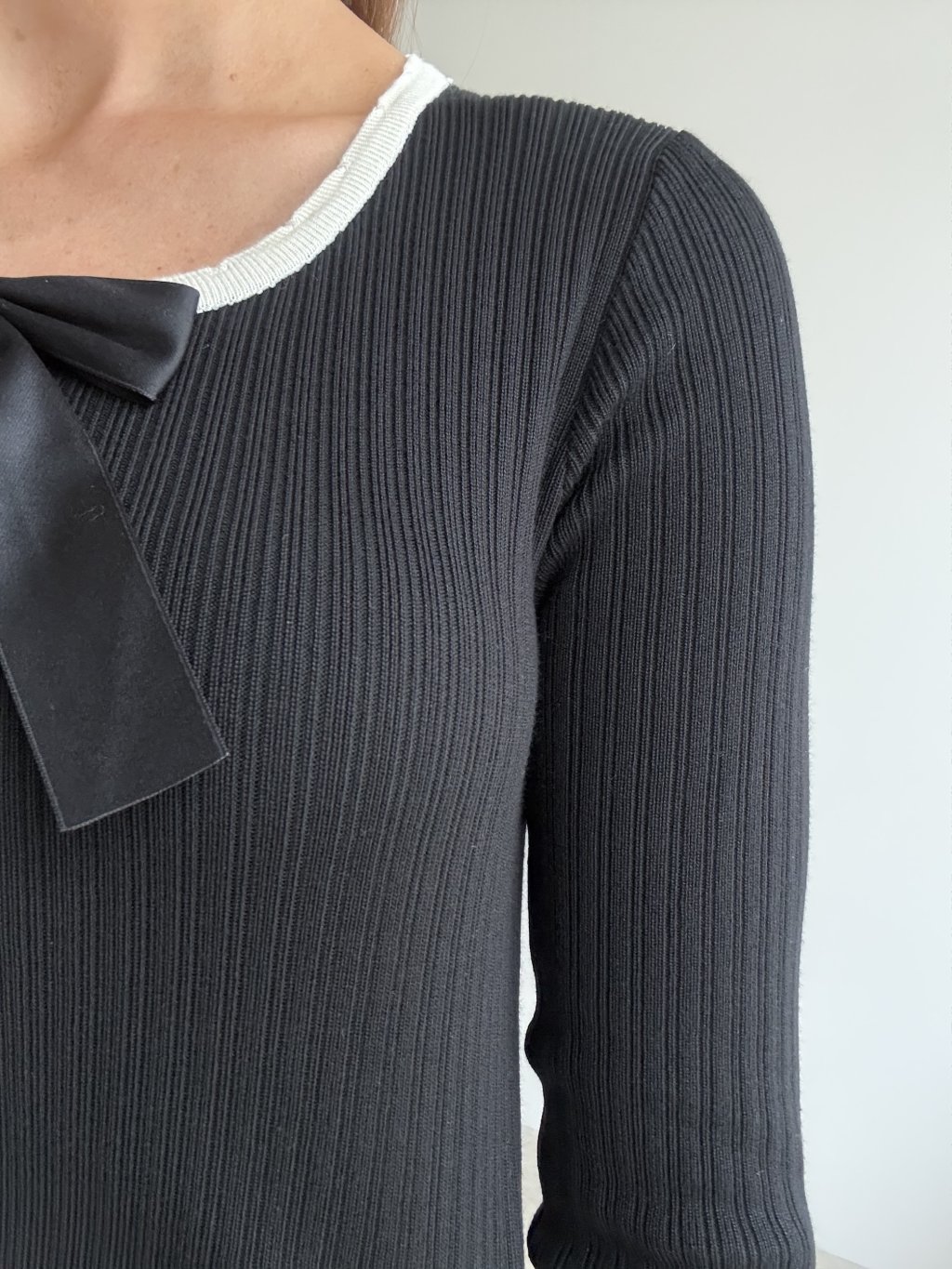 Fitted ribbed top with contrasting trim and a detachable bow at the neckline. An elegant, comfortable piece suitable for both office wear and evening looks.