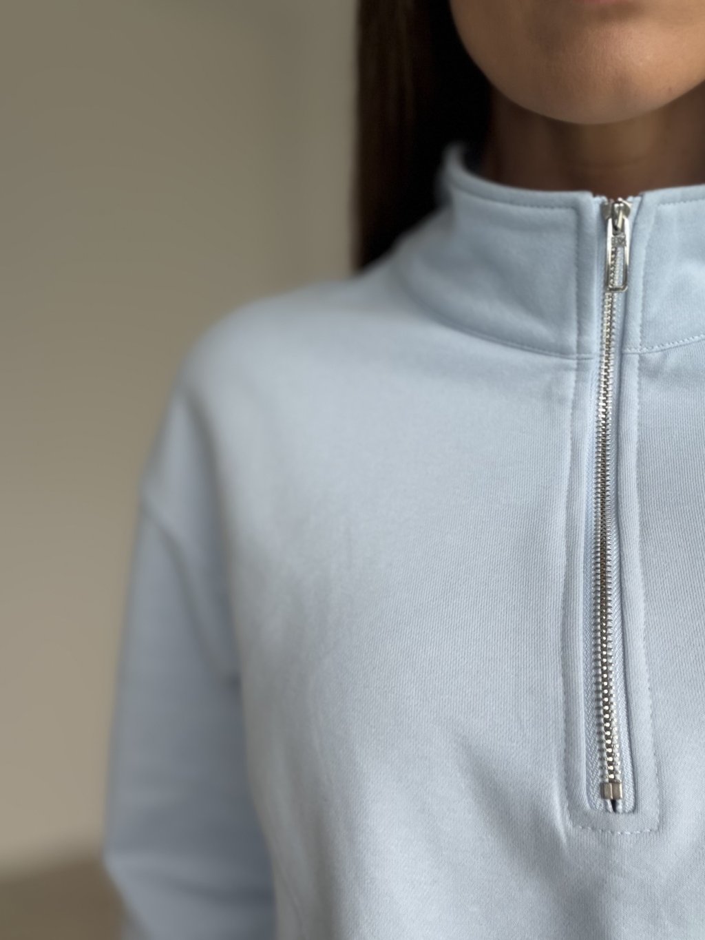 A tracksuit set in a clean, modern design that combines comfort with a polished look. The sweatshirt features a high collar with a zip at the neckline, so you can wear it open or zipped up depending on the vibe you want. The fit is relaxed yet flattering, enhanced by subtle seam lines and refined details. The joggers come with an elastic waistband, practical pockets, and tapered cuffs that keep the shape and sit nicely on footwear. Perfect for off-duty days, travel, or an effortless city outfit that still looks put-together.