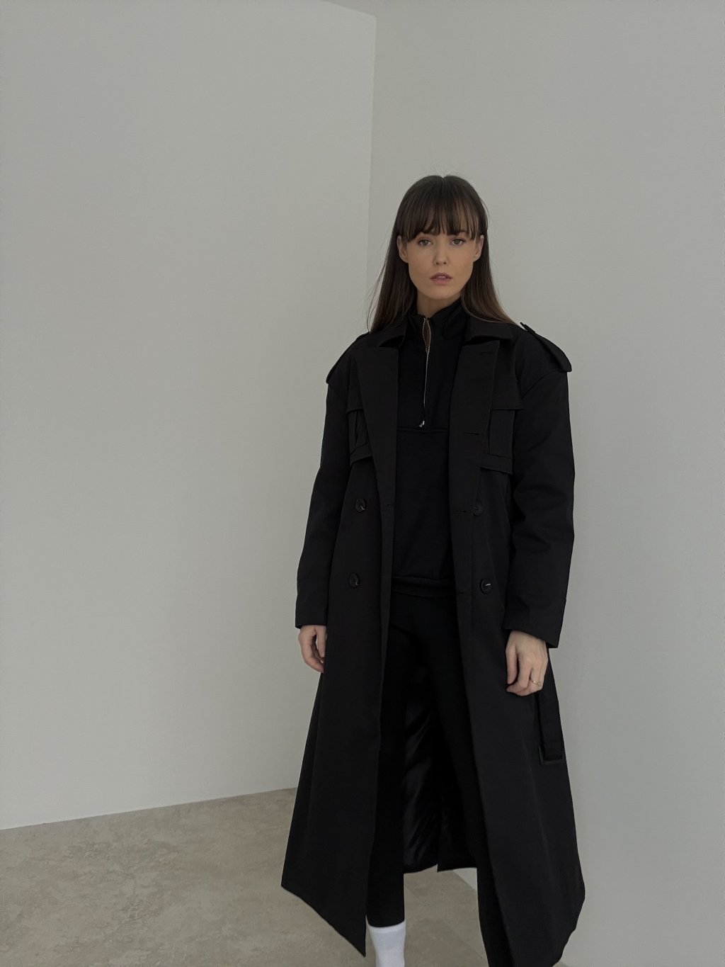 A long trench coat with a waist tie and functional pockets for a sharp, modern look. A timeless outerwear piece for transitional seasons.